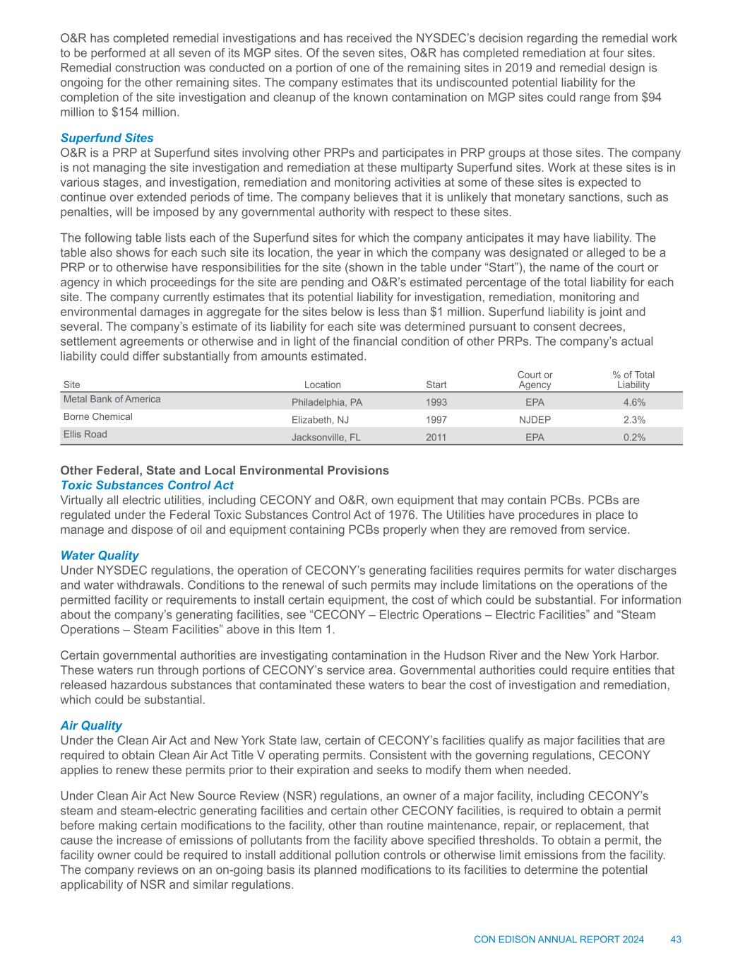 O&R has completed remedial investigations and has received the NYSDEC’s decision regarding the remedial work to be performed at all seven of its MGP sites. Of the seven sites, O&R has completed remediation at four sites. Remedial construction was conducted on a portion of one of the remaining sites in 2019 and remedial design is ongoing for the other remaining sites. The company estimates that its undiscounted potential liability for the completion of the site investigation and cleanup of the known contamination on MGP sites could range from $94 million to $154 million. Superfund Sites O&R is a PRP at Superfund sites involving other PRPs and participates in PRP groups at those sites. The company is not managing the site investigation and remediation at these multiparty Superfund sites. Work at these sites is in various stages, and investigation, remediation and monitoring activities at some of these sites is expected to continue over extended periods of time. The company believes that it is unlikely that monetary sanctions, such as penalties, will be imposed by any governmental authority with respect to these sites. The following table lists each of the Superfund sites for which the company anticipates it may have liability. The table also shows for each such site its location, the year in which the company was designated or alleged to be a PRP or to otherwise have responsibilities for the site (shown in the table under “Start”), the name of the court or agency in which proceedings for the site are pending and O&R’s estimated percentage of the total liability for each site. The company currently estimates that its potential liability for investigation, remediation, monitoring and environmental damages in aggregate for the sites below is less than $1 million. Superfund liability is joint and several. The company’s estimate of its liability for each site was determined pursuant to consent decrees, settlement agreements or otherwise and in light of the financial condition of other PRPs. The company’s actual liability could differ substantially from amounts estimated. Site Location Start Court or Agency % of Total Liability Metal Bank of America Philadelphia, PA 1993 EPA 4.6% Borne Chemical Elizabeth, NJ 1997 NJDEP 2.3% Ellis Road Jacksonville, FL 2011 EPA 0.2% Other Federal, State and Local Environmental Provisions Toxic Substances Control Act Virtually all electric utilities, including CECONY and O&R, own equipment that may contain PCBs. PCBs are regulated under the Federal Toxic Substances Control Act of 1976. The Utilities have procedures in place to manage and dispose of oil and equipment containing PCBs properly when they are removed from service. Water Quality Under NYSDEC regulations, the operation of CECONY’s generating facilities requires permits for water discharges and water withdrawals. Conditions to the renewal of such permits may include limitations on the operations of the permitted facility or requirements to install certain equipment, the cost of which could be substantial. For information about the company’s generating facilities, see “CECONY – Electric Operations – Electric Facilities” and “Steam Operations – Steam Facilities” above in this Item 1. Certain governmental authorities are investigating contamination in the Hudson River and the New York Harbor. These waters run through portions of CECONY’s service area. Governmental authorities could require entities that released hazardous substances that contaminated these waters to bear the cost of investigation and remediation, which could be substantial. Air Quality Under the Clean Air Act and New York State law, certain of CECONY’s facilities qualify as major facilities that are required to obtain Clean Air Act Title V operating permits. Consistent with the governing regulations, CECONY applies to renew these permits prior to their expiration and seeks to modify them when needed. Under Clean Air Act New Source Review (NSR) regulations, an owner of a major facility, including CECONY’s steam and steam-electric generating facilities and certain other CECONY facilities, is required to obtain a permit before making certain modifications to the facility, other than routine maintenance, repair, or replacement, that cause the increase of emissions of pollutants from the facility above specified thresholds. To obtain a permit, the facility owner could be required to install additional pollution controls or otherwise limit emissions from the facility. The company reviews on an on-going basis its planned modifications to its facilities to determine the potential applicability of NSR and similar regulations. CON EDISON ANNUAL REPORT 2024 43