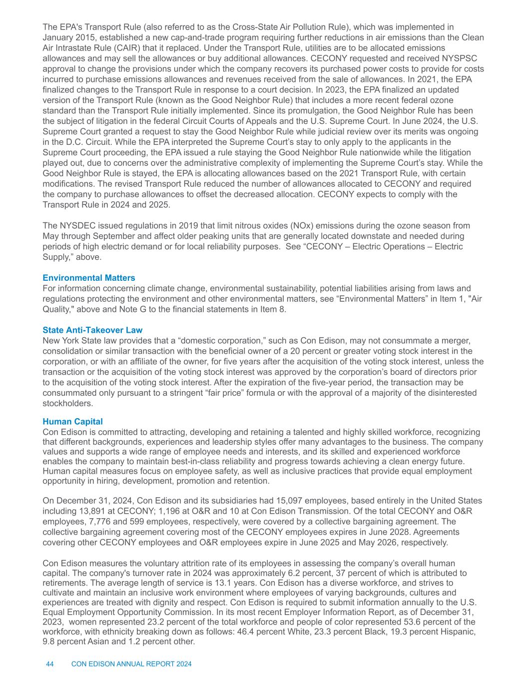 The EPA's Transport Rule (also referred to as the Cross-State Air Pollution Rule), which was implemented in January 2015, established a new cap-and-trade program requiring further reductions in air emissions than the Clean Air Intrastate Rule (CAIR) that it replaced. Under the Transport Rule, utilities are to be allocated emissions allowances and may sell the allowances or buy additional allowances. CECONY requested and received NYSPSC approval to change the provisions under which the company recovers its purchased power costs to provide for costs incurred to purchase emissions allowances and revenues received from the sale of allowances. In 2021, the EPA finalized changes to the Transport Rule in response to a court decision. In 2023, the EPA finalized an updated version of the Transport Rule (known as the Good Neighbor Rule) that includes a more recent federal ozone standard than the Transport Rule initially implemented. Since its promulgation, the Good Neighbor Rule has been the subject of litigation in the federal Circuit Courts of Appeals and the U.S. Supreme Court. In June 2024, the U.S. Supreme Court granted a request to stay the Good Neighbor Rule while judicial review over its merits was ongoing in the D.C. Circuit. While the EPA interpreted the Supreme Court’s stay to only apply to the applicants in the Supreme Court proceeding, the EPA issued a rule staying the Good Neighbor Rule nationwide while the litigation played out, due to concerns over the administrative complexity of implementing the Supreme Court’s stay. While the Good Neighbor Rule is stayed, the EPA is allocating allowances based on the 2021 Transport Rule, with certain modifications. The revised Transport Rule reduced the number of allowances allocated to CECONY and required the company to purchase allowances to offset the decreased allocation. CECONY expects to comply with the Transport Rule in 2024 and 2025. The NYSDEC issued regulations in 2019 that limit nitrous oxides (NOx) emissions during the ozone season from May through September and affect older peaking units that are generally located downstate and needed during periods of high electric demand or for local reliability purposes. See “CECONY – Electric Operations – Electric Supply,” above. Environmental Matters For information concerning climate change, environmental sustainability, potential liabilities arising from laws and regulations protecting the environment and other environmental matters, see “Environmental Matters” in Item 1, "Air Quality," above and Note G to the financial statements in Item 8. State Anti-Takeover Law New York State law provides that a “domestic corporation,” such as Con Edison, may not consummate a merger, consolidation or similar transaction with the beneficial owner of a 20 percent or greater voting stock interest in the corporation, or with an affiliate of the owner, for five years after the acquisition of the voting stock interest, unless the transaction or the acquisition of the voting stock interest was approved by the corporation’s board of directors prior to the acquisition of the voting stock interest. After the expiration of the five-year period, the transaction may be consummated only pursuant to a stringent “fair price” formula or with the approval of a majority of the disinterested stockholders. Human Capital Con Edison is committed to attracting, developing and retaining a talented and highly skilled workforce, recognizing that different backgrounds, experiences and leadership styles offer many advantages to the business. The company values and supports a wide range of employee needs and interests, and its skilled and experienced workforce enables the company to maintain best-in-class reliability and progress towards achieving a clean energy future. Human capital measures focus on employee safety, as well as inclusive practices that provide equal employment opportunity in hiring, development, promotion and retention. On December 31, 2024, Con Edison and its subsidiaries had 15,097 employees, based entirely in the United States including 13,891 at CECONY; 1,196 at O&R and 10 at Con Edison Transmission. Of the total CECONY and O&R employees, 7,776 and 599 employees, respectively, were covered by a collective bargaining agreement. The collective bargaining agreement covering most of the CECONY employees expires in June 2028. Agreements covering other CECONY employees and O&R employees expire in June 2025 and May 2026, respectively. Con Edison measures the voluntary attrition rate of its employees in assessing the company’s overall human capital. The company's turnover rate in 2024 was approximately 6.2 percent, 37 percent of which is attributed to retirements. The average length of service is 13.1 years. Con Edison has a diverse workforce, and strives to cultivate and maintain an inclusive work environment where employees of varying backgrounds, cultures and experiences are treated with dignity and respect. Con Edison is required to submit information annually to the U.S. Equal Employment Opportunity Commission. In its most recent Employer Information Report, as of December 31, 2023, women represented 23.2 percent of the total workforce and people of color represented 53.6 percent of the workforce, with ethnicity breaking down as follows: 46.4 percent White, 23.3 percent Black, 19.3 percent Hispanic, 9.8 percent Asian and 1.2 percent other. 44 CON EDISON ANNUAL REPORT 2024
