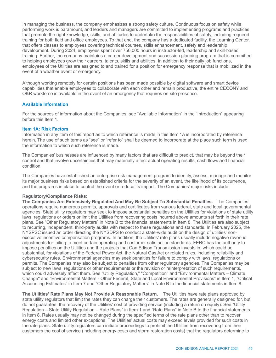 In managing the business, the company emphasizes a strong safety culture. Continuous focus on safety while performing work is paramount, and leaders and managers are committed to implementing programs and practices that promote the right knowledge, skills, and attitudes to undertake the responsibilities of safety, including required training for both field and office employees. To that end, the company has a dedicated facility, the Learning Center, that offers classes to employees covering technical courses, skills enhancement, safety and leadership development. During 2024, employees spent over 750,000 hours in instructor-led, leadership and skill-based training. Further, the company maintains a career development and succession planning program that is committed to helping employees grow their careers, talents, skills and abilities. In addition to their daily job functions, employees of the Utilities are assigned to and trained for a position for emergency response that is mobilized in the event of a weather event or emergency. Although working remotely for certain positions has been made possible by digital software and smart device capabilities that enable employees to collaborate with each other and remain productive, the entire CECONY and O&R workforce is available in the event of an emergency that requires on-site presence. Available Information For the sources of information about the Companies, see “Available Information” in the “Introduction” appearing before this Item 1. Item 1A: Risk Factors Information in any item of this report as to which reference is made in this Item 1A is incorporated by reference herein. The use of such terms as “see” or “refer to” shall be deemed to incorporate at the place such term is used the information to which such reference is made. The Companies’ businesses are influenced by many factors that are difficult to predict, that may be beyond their control and that involve uncertainties that may materially affect actual operating results, cash flows and financial condition. The Companies have established an enterprise risk management program to identify, assess, manage and monitor its major business risks based on established criteria for the severity of an event, the likelihood of its occurrence, and the programs in place to control the event or reduce its impact. The Companies’ major risks include: Regulatory/Compliance Risks: The Companies Are Extensively Regulated And May Be Subject To Substantial Penalties. The Companies’ operations require numerous permits, approvals and certificates from various federal, state and local governmental agencies. State utility regulators may seek to impose substantial penalties on the Utilities for violations of state utility laws, regulations or orders or limit the Utilities from recovering costs incurred above amounts set forth in their rate plans. See “Other Regulatory Matters” in Note B to the financial statements in Item 8. The Utilities are also subject to recurring, independent, third-party audits with respect to these regulations and standards. In February 2025, the NYSPSC issued an order directing the NYSDPS to conduct a state-wide audit on the design of utilities' non- executive incentive compensation programs. In addition, the Utilities' rate plans usually include negative revenue adjustments for failing to meet certain operating and customer satisfaction standards. FERC has the authority to impose penalties on the Utilities and the projects that Con Edison Transmission invests in, which could be substantial, for violations of the Federal Power Act, the Natural Gas Act or related rules, including reliability and cybersecurity rules. Environmental agencies may seek penalties for failure to comply with laws, regulations or permits. The Companies may also be subject to penalties from other regulatory agencies. The Companies may be subject to new laws, regulations or other requirements or the revision or reinterpretation of such requirements, which could adversely affect them. See “Utility Regulation," "Competition" and “Environmental Matters – Climate Change" and "Environmental Matters - Other Federal, State and Local Environmental Provisions” in Item 1, “Critical Accounting Estimates” in Item 7 and “Other Regulatory Matters” in Note B to the financial statements in Item 8. The Utilities’ Rate Plans May Not Provide A Reasonable Return. The Utilities have rate plans approved by state utility regulators that limit the rates they can charge their customers. The rates are generally designed for, but do not guarantee, the recovery of the Utilities’ cost of providing service (including a return on equity). See “Utility Regulation – State Utility Regulation – Rate Plans” in Item 1 and “Rate Plans” in Note B to the financial statements in Item 8. Rates usually may not be changed during the specified terms of the rate plans other than to recover energy costs and limited other exceptions. The Utilities’ actual costs may exceed levels provided for such costs in the rate plans. State utility regulators can initiate proceedings to prohibit the Utilities from recovering from their customers the cost of service (including energy costs and storm restoration costs) that the regulators determine to CON EDISON ANNUAL REPORT 2024 45