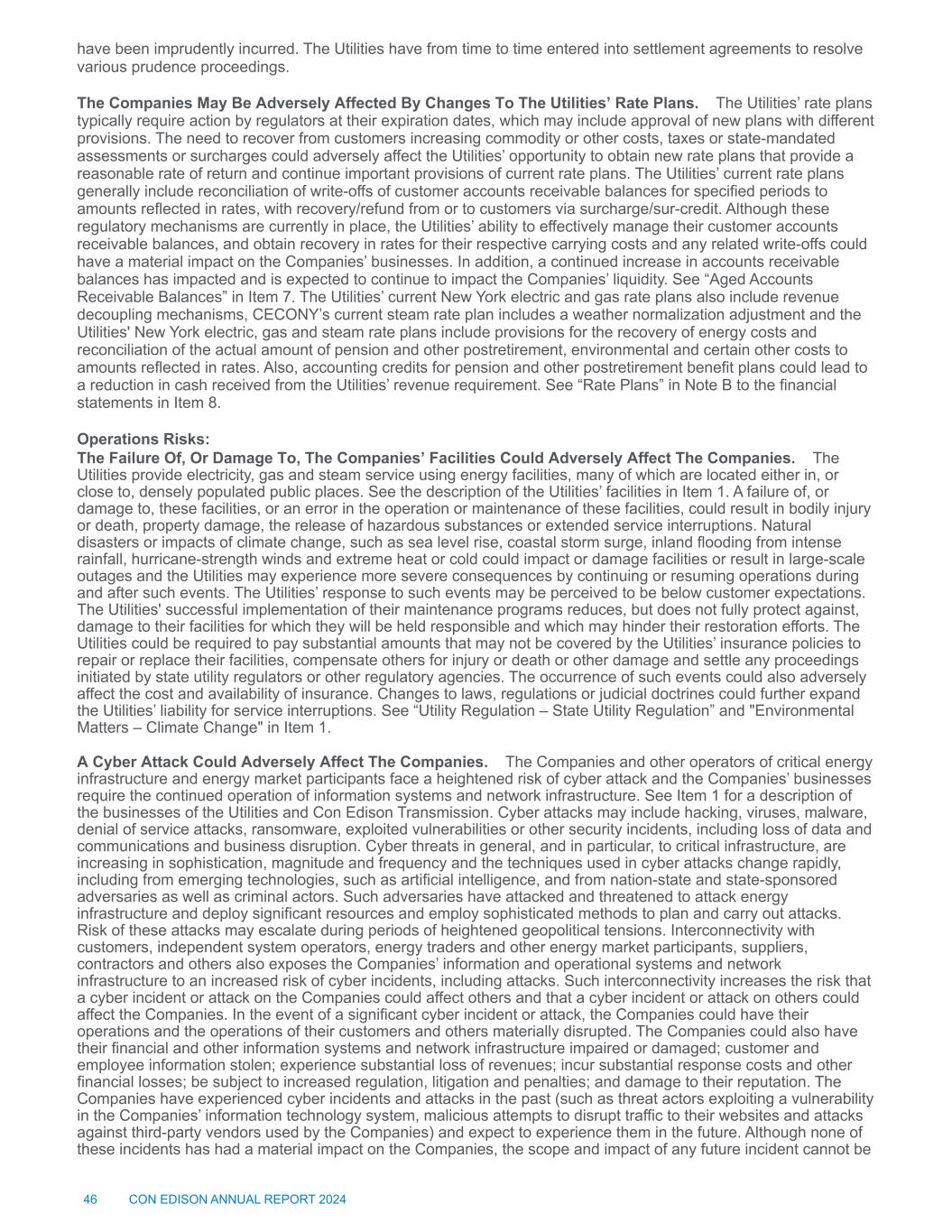 have been imprudently incurred. The Utilities have from time to time entered into settlement agreements to resolve various prudence proceedings. The Companies May Be Adversely Affected By Changes To The Utilities’ Rate Plans. The Utilities’ rate plans typically require action by regulators at their expiration dates, which may include approval of new plans with different provisions. The need to recover from customers increasing commodity or other costs, taxes or state-mandated assessments or surcharges could adversely affect the Utilities’ opportunity to obtain new rate plans that provide a reasonable rate of return and continue important provisions of current rate plans. The Utilities’ current rate plans generally include reconciliation of write-offs of customer accounts receivable balances for specified periods to amounts reflected in rates, with recovery/refund from or to customers via surcharge/sur-credit. Although these regulatory mechanisms are currently in place, the Utilities’ ability to effectively manage their customer accounts receivable balances, and obtain recovery in rates for their respective carrying costs and any related write-offs could have a material impact on the Companies’ businesses. In addition, a continued increase in accounts receivable balances has impacted and is expected to continue to impact the Companies’ liquidity. See “Aged Accounts Receivable Balances” in Item 7. The Utilities’ current New York electric and gas rate plans also include revenue decoupling mechanisms, CECONY’s current steam rate plan includes a weather normalization adjustment and the Utilities' New York electric, gas and steam rate plans include provisions for the recovery of energy costs and reconciliation of the actual amount of pension and other postretirement, environmental and certain other costs to amounts reflected in rates. Also, accounting credits for pension and other postretirement benefit plans could lead to a reduction in cash received from the Utilities’ revenue requirement. See “Rate Plans” in Note B to the financial statements in Item 8. Operations Risks: The Failure Of, Or Damage To, The Companies’ Facilities Could Adversely Affect The Companies. The Utilities provide electricity, gas and steam service using energy facilities, many of which are located either in, or close to, densely populated public places. See the description of the Utilities’ facilities in Item 1. A failure of, or damage to, these facilities, or an error in the operation or maintenance of these facilities, could result in bodily injury or death, property damage, the release of hazardous substances or extended service interruptions. Natural disasters or impacts of climate change, such as sea level rise, coastal storm surge, inland flooding from intense rainfall, hurricane-strength winds and extreme heat or cold could impact or damage facilities or result in large-scale outages and the Utilities may experience more severe consequences by continuing or resuming operations during and after such events. The Utilities’ response to such events may be perceived to be below customer expectations. The Utilities' successful implementation of their maintenance programs reduces, but does not fully protect against, damage to their facilities for which they will be held responsible and which may hinder their restoration efforts. The Utilities could be required to pay substantial amounts that may not be covered by the Utilities’ insurance policies to repair or replace their facilities, compensate others for injury or death or other damage and settle any proceedings initiated by state utility regulators or other regulatory agencies. The occurrence of such events could also adversely affect the cost and availability of insurance. Changes to laws, regulations or judicial doctrines could further expand the Utilities’ liability for service interruptions. See “Utility Regulation – State Utility Regulation” and "Environmental Matters – Climate Change" in Item 1. A Cyber Attack Could Adversely Affect The Companies. The Companies and other operators of critical energy infrastructure and energy market participants face a heightened risk of cyber attack and the Companies’ businesses require the continued operation of information systems and network infrastructure. See Item 1 for a description of the businesses of the Utilities and Con Edison Transmission. Cyber attacks may include hacking, viruses, malware, denial of service attacks, ransomware, exploited vulnerabilities or other security incidents, including loss of data and communications and business disruption. Cyber threats in general, and in particular, to critical infrastructure, are increasing in sophistication, magnitude and frequency and the techniques used in cyber attacks change rapidly, including from emerging technologies, such as artificial intelligence, and from nation-state and state-sponsored adversaries as well as criminal actors. Such adversaries have attacked and threatened to attack energy infrastructure and deploy significant resources and employ sophisticated methods to plan and carry out attacks. Risk of these attacks may escalate during periods of heightened geopolitical tensions. Interconnectivity with customers, independent system operators, energy traders and other energy market participants, suppliers, contractors and others also exposes the Companies’ information and operational systems and network infrastructure to an increased risk of cyber incidents, including attacks. Such interconnectivity increases the risk that a cyber incident or attack on the Companies could affect others and that a cyber incident or attack on others could affect the Companies. In the event of a significant cyber incident or attack, the Companies could have their operations and the operations of their customers and others materially disrupted. The Companies could also have their financial and other information systems and net