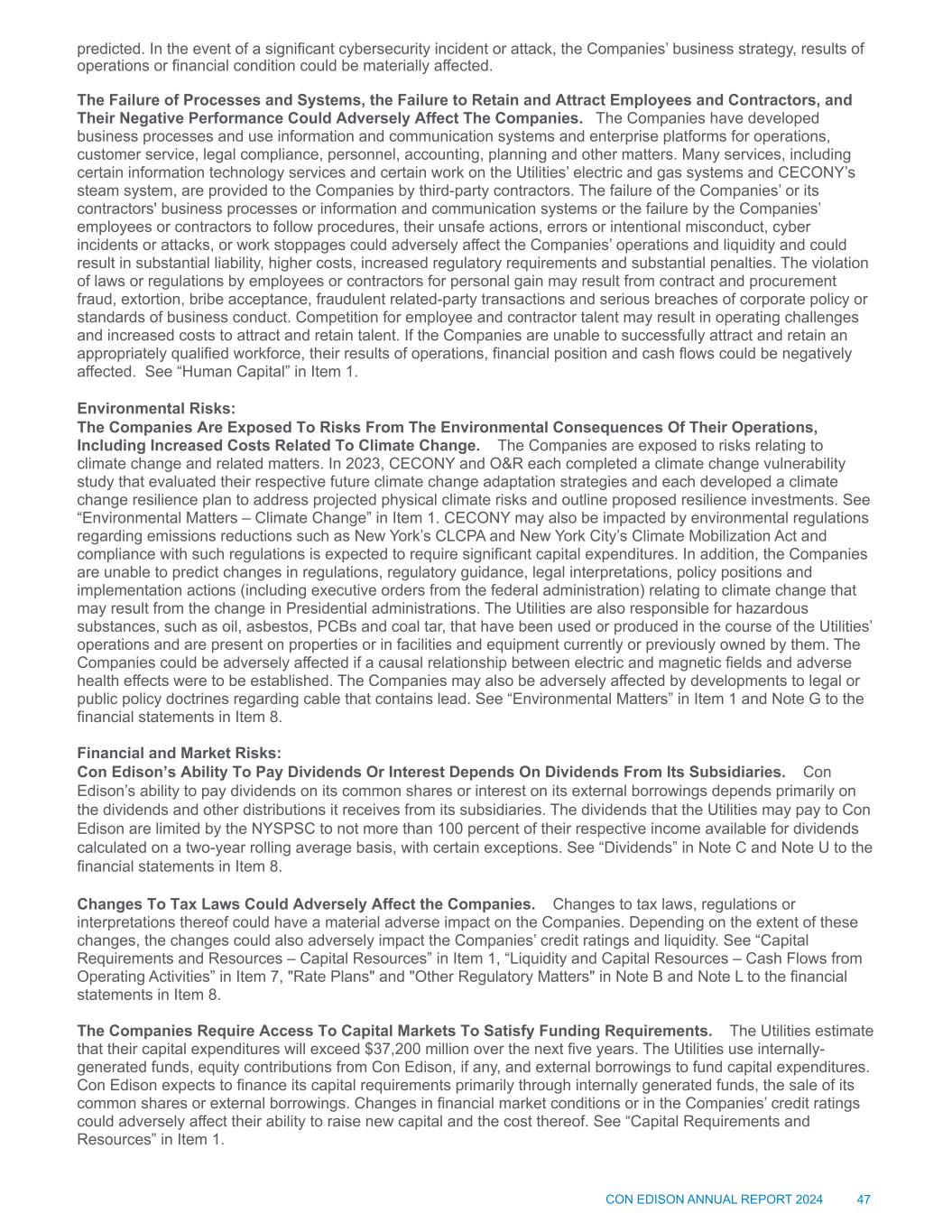 predicted. In the event of a significant cybersecurity incident or attack, the Companies’ business strategy, results of operations or financial condition could be materially affected. The Failure of Processes and Systems, the Failure to Retain and Attract Employees and Contractors, and Their Negative Performance Could Adversely Affect The Companies. The Companies have developed business processes and use information and communication systems and enterprise platforms for operations, customer service, legal compliance, personnel, accounting, planning and other matters. Many services, including certain information technology services and certain work on the Utilities’ electric and gas systems and CECONY’s steam system, are provided to the Companies by third-party contractors. The failure of the Companies’ or its contractors' business processes or information and communication systems or the failure by the Companies’ employees or contractors to follow procedures, their unsafe actions, errors or intentional misconduct, cyber incidents or attacks, or work stoppages could adversely affect the Companies’ operations and liquidity and could result in substantial liability, higher costs, increased regulatory requirements and substantial penalties. The violation of laws or regulations by employees or contractors for personal gain may result from contract and procurement fraud, extortion, bribe acceptance, fraudulent related-party transactions and serious breaches of corporate policy or standards of business conduct. Competition for employee and contractor talent may result in operating challenges and increased costs to attract and retain talent. If the Companies are unable to successfully attract and retain an appropriately qualified workforce, their results of operations, financial position and cash flows could be negatively affected. See “Human Capital” in Item 1. Environmental Risks: The Companies Are Exposed To Risks From The Environmental Consequences Of Their Operations, Including Increased Costs Related To Climate Change. The Companies are exposed to risks relating to climate change and related matters. In 2023, CECONY and O&R each completed a climate change vulnerability study that evaluated their respective future climate change adaptation strategies and each developed a climate change resilience plan to address projected physical climate risks and outline proposed resilience investments. See “Environmental Matters – Climate Change” in Item 1. CECONY may also be impacted by environmental regulations regarding emissions reductions such as New York’s CLCPA and New York City’s Climate Mobilization Act and compliance with such regulations is expected to require significant capital expenditures. In addition, the Companies are unable to predict changes in regulations, regulatory guidance, legal interpretations, policy positions and implementation actions (including executive orders from the federal administration) relating to climate change that may result from the change in Presidential administrations. The Utilities are also responsible for hazardous substances, such as oil, asbestos, PCBs and coal tar, that have been used or produced in the course of the Utilities’ operations and are present on properties or in facilities and equipment currently or previously owned by them. The Companies could be adversely affected if a causal relationship between electric and magnetic fields and adverse health effects were to be established. The Companies may also be adversely affected by developments to legal or public policy doctrines regarding cable that contains lead. See “Environmental Matters” in Item 1 and Note G to the financial statements in Item 8. Financial and Market Risks: Con Edison’s Ability To Pay Dividends Or Interest Depends On Dividends From Its Subsidiaries. Con Edison’s ability to pay dividends on its common shares or interest on its external borrowings depends primarily on the dividends and other distributions it receives from its subsidiaries. The dividends that the Utilities may pay to Con Edison are limited by the NYSPSC to not more than 100 percent of their respective income available for dividends calculated on a two-year rolling average basis, with certain exceptions. See “Dividends” in Note C and Note U to the financial statements in Item 8. Changes To Tax Laws Could Adversely Affect the Companies. Changes to tax laws, regulations or interpretations thereof could have a material adverse impact on the Companies. Depending on the extent of these changes, the changes could also adversely impact the Companies’ credit ratings and liquidity. See “Capital Requirements and Resources – Capital Resources” in Item 1, “Liquidity and Capital Resources – Cash Flows from Operating Activities” in Item 7, "Rate Plans" and "Other Regulatory Matters" in Note B and Note L to the financial statements in Item 8. The Companies Require Access To Capital Markets To Satisfy Funding Requirements. The Utilities estimate that their capital expenditures will exceed $37,200 million over the next five years. The Utilities use internally- generated funds, equity contributions from Con Edison, if any, and external borrowings to fund capital expenditures. Con Edison expects to finance its capital requirements primarily through internally generated funds, the sale of its common shares or external borrowings. Changes in financial market conditions or in the Companies’ credit ratings could adversely affect their ability to raise new capital and the cost thereof. See “Capital Requirements and Resources” in Item 1. CON EDISON ANNUAL REPORT 2024 47