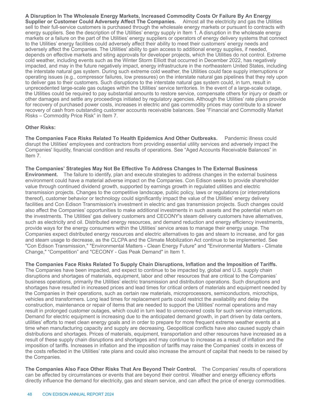 A Disruption In The Wholesale Energy Markets, Increased Commodity Costs Or Failure By An Energy Supplier or Customer Could Adversely Affect The Companies. Almost all the electricity and gas the Utilities sell to their full-service customers is purchased through the wholesale energy markets or pursuant to contracts with energy suppliers. See the description of the Utilities’ energy supply in Item 1. A disruption in the wholesale energy markets or a failure on the part of the Utilities’ energy suppliers or operators of energy delivery systems that connect to the Utilities’ energy facilities could adversely affect their ability to meet their customers’ energy needs and adversely affect the Companies. The Utilities' ability to gain access to additional energy supplies, if needed, depends on effective markets and siting approvals for developer projects, which the Utilities do not control. Extreme cold weather, including events such as the Winter Storm Elliott that occurred in December 2022, has negatively impacted, and may in the future negatively impact, energy infrastructure in the northeastern United States, including the interstate natural gas system. During such extreme cold weather, the Utilities could face supply interruptions or operating issues (e.g., compressor failures, low pressures) on the interstate natural gas pipelines that they rely upon to deliver gas to their customers. Such disruptions to the interstate natural gas system could, in turn, result in unprecedented large-scale gas outages within the Utilities’ service territories. In the event of a large-scale outage, the Utilities could be required to pay substantial amounts to restore service, compensate others for injury or death or other damages and settle any proceedings initiated by regulatory agencies. Although the Utilities’ rate plans provide for recovery of purchased power costs, increases in electric and gas commodity prices may contribute to a slower recovery of cash from outstanding customer accounts receivable balances. See “Financial and Commodity Market Risks – Commodity Price Risk” in Item 7. Other Risks: The Companies Face Risks Related To Health Epidemics And Other Outbreaks. Pandemic illness could disrupt the Utilities' employees and contractors from providing essential utility services and adversely impact the Companies' liquidity, financial condition and results of operations. See “Aged Accounts Receivable Balances” in Item 7. The Companies’ Strategies May Not Be Effective To Address Changes In The External Business Environment. The failure to identify, plan and execute strategies to address changes in the external business environment could have a material adverse impact on the Companies. Con Edison seeks to provide shareholder value through continued dividend growth, supported by earnings growth in regulated utilities and electric transmission projects. Changes to the competitive landscape, public policy, laws or regulations (or interpretations thereof), customer behavior or technology could significantly impact the value of the Utilities’ energy delivery facilities and Con Edison Transmission's investment in electric and gas transmission projects. Such changes could also affect the Companies’ opportunities to make additional investments in such assets and the potential return on the investments. The Utilities' gas delivery customers and CECONY's steam delivery customers have alternatives, such as electricity and oil. Distributed energy resources, and demand reduction and energy efficiency investments, provide ways for the energy consumers within the Utilities’ service areas to manage their energy usage. The Companies expect distributed energy resources and electric alternatives to gas and steam to increase, and for gas and steam usage to decrease, as the CLCPA and the Climate Mobilization Act continue to be implemented. See "Con Edison Transmission," "Environmental Matters - Clean Energy Future" and "Environmental Matters - Climate Change," “Competition” and "CECONY - Gas Peak Demand" in Item 1. The Companies Face Risks Related To Supply Chain Disruptions, Inflation and the Imposition of Tariffs. The Companies have been impacted, and expect to continue to be impacted by, global and U.S. supply chain disruptions and shortages of materials, equipment, labor and other resources that are critical to the Companies’ business operations, primarily the Utilities’ electric transmission and distribution operations. Such disruptions and shortages have resulted in increased prices and lead times for critical orders of materials and equipment needed by the Companies in their operations, such as certain raw materials, microprocessors, semiconductors, microchips, vehicles and transformers. Long lead times for replacement parts could restrict the availability and delay the construction, maintenance or repair of items that are needed to support the Utilities' normal operations and may result in prolonged customer outages, which could in turn lead to unrecovered costs for such service interruptions. Demand for electric equipment is increasing due to the anticipated demand growth, in part driven by data centers, utilities’ efforts to meet clean energy goals and in order to prepare for more frequent extreme weather events at a time when manufacturing capacity and supply are decreasing. Geopolitical conflicts have also caused supply chain distributions and shortages. Prices of materials, equipment, transportation and other resources have increased as a result of these supply chain disruptions and shortages and may continue to increase as a result of inflation and the imposition of tariffs. Increases in inflation and the imposition of tariffs may raise the Companies’ costs in excess of the costs reflected in the Utilities’ rate plans and could also increase the amount of capital that needs to be raised by the Companies. The Companies Also Face Other Risks That Are Beyond Their Con