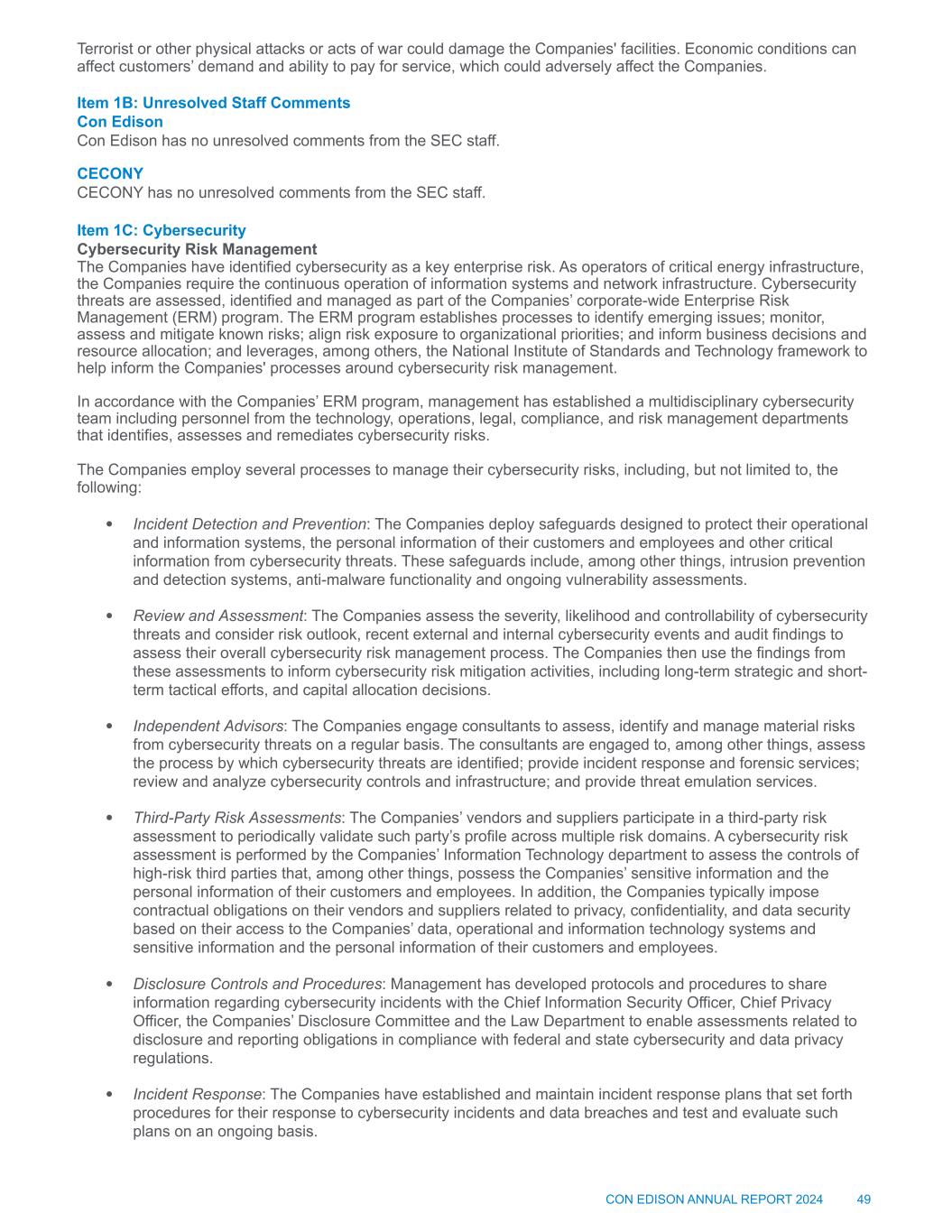 Terrorist or other physical attacks or acts of war could damage the Companies' facilities. Economic conditions can affect customers’ demand and ability to pay for service, which could adversely affect the Companies. Item 1B: Unresolved Staff Comments Con Edison Con Edison has no unresolved comments from the SEC staff. CECONY CECONY has no unresolved comments from the SEC staff. Item 1C: Cybersecurity Cybersecurity Risk Management The Companies have identified cybersecurity as a key enterprise risk. As operators of critical energy infrastructure, the Companies require the continuous operation of information systems and network infrastructure. Cybersecurity threats are assessed, identified and managed as part of the Companies’ corporate-wide Enterprise Risk Management (ERM) program. The ERM program establishes processes to identify emerging issues; monitor, assess and mitigate known risks; align risk exposure to organizational priorities; and inform business decisions and resource allocation; and leverages, among others, the National Institute of Standards and Technology framework to help inform the Companies' processes around cybersecurity risk management. In accordance with the Companies’ ERM program, management has established a multidisciplinary cybersecurity team including personnel from the technology, operations, legal, compliance, and risk management departments that identifies, assesses and remediates cybersecurity risks. The Companies employ several processes to manage their cybersecurity risks, including, but not limited to, the following: • Incident Detection and Prevention: The Companies deploy safeguards designed to protect their operational and information systems, the personal information of their customers and employees and other critical information from cybersecurity threats. These safeguards include, among other things, intrusion prevention and detection systems, anti-malware functionality and ongoing vulnerability assessments. • Review and Assessment: The Companies assess the severity, likelihood and controllability of cybersecurity threats and consider risk outlook, recent external and internal cybersecurity events and audit findings to assess their overall cybersecurity risk management process. The Companies then use the findings from these assessments to inform cybersecurity risk mitigation activities, including long-term strategic and short- term tactical efforts, and capital allocation decisions. • Independent Advisors: The Companies engage consultants to assess, identify and manage material risks from cybersecurity threats on a regular basis. The consultants are engaged to, among other things, assess the process by which cybersecurity threats are identified; provide incident response and forensic services; review and analyze cybersecurity controls and infrastructure; and provide threat emulation services. • Third-Party Risk Assessments: The Companies’ vendors and suppliers participate in a third-party risk assessment to periodically validate such party’s profile across multiple risk domains. A cybersecurity risk assessment is performed by the Companies’ Information Technology department to assess the controls of high-risk third parties that, among other things, possess the Companies’ sensitive information and the personal information of their customers and employees. In addition, the Companies typically impose contractual obligations on their vendors and suppliers related to privacy, confidentiality, and data security based on their access to the Companies’ data, operational and information technology systems and sensitive information and the personal information of their customers and employees. • Disclosure Controls and Procedures: Management has developed protocols and procedures to share information regarding cybersecurity incidents with the Chief Information Security Officer, Chief Privacy Officer, the Companies’ Disclosure Committee and the Law Department to enable assessments related to disclosure and reporting obligations in compliance with federal and state cybersecurity and data privacy regulations. • Incident Response: The Companies have established and maintain incident response plans that set forth procedures for their response to cybersecurity incidents and data breaches and test and evaluate such plans on an ongoing basis. CON EDISON ANNUAL REPORT 2024 49