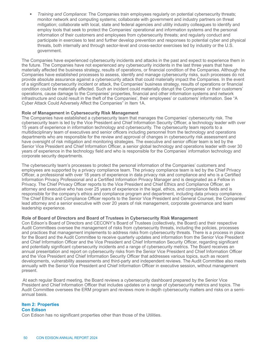• Training and Compliance: The Companies train employees regularly on potential cybersecurity threats; monitor network and computing systems; collaborate with government and industry partners on threat mitigation; collaborate with local, state and federal agencies and utility industry colleagues to identify and employ tools that seek to protect the Companies’ operational and information systems and the personal information of their customers and employees from cybersecurity threats; and regularly conduct and participate in exercises to test and further develop prevention and responses to potential cyber and physical threats, both internally and through sector-level and cross-sector exercises led by industry or the U.S. government. The Companies have experienced cybersecurity incidents and attacks in the past and expect to experience them in the future. The Companies have not experienced any cybersecurity incidents in the last three years that have materially affected the business strategy, results of operations, or financial condition of the Companies. Although the Companies have established processes to assess, identify and manage cybersecurity risks, such processes do not provide absolute assurance against a cybersecurity attack that could materially impact the Companies. In the event of a significant cybersecurity incident or attack, the Companies’ business strategy, results of operations or financial condition could be materially affected. Such an incident could materially disrupt the Companies’ or their customers’ operations, cause damage to the Companies’ properties, financial and other information systems and network infrastructure and could result in the theft of the Companies’, their employees’ or customers’ information. See “A Cyber Attack Could Adversely Affect the Companies” in Item 1A. Role of Management in Cybersecurity Risk Management The Companies have established a cybersecurity team that manages the Companies’ cybersecurity risk. The cybersecurity team is led by the Vice President and Chief Information Security Officer, a technology leader with over 15 years of experience in information technology and cybersecurity. The cybersecurity team reports to a multidisciplinary team of executives and senior officers including personnel from the technology and operations departments who are responsible for the review and approval of changes in cybersecurity risk assessment and have oversight of risk mitigation and monitoring strategies. The executive and senior officer team is led by the Senior Vice President and Chief Information Officer, a senior global technology and operations leader with over 30 years of experience in the technology field and who is responsible for the Companies’ information technology and corporate security departments. The cybersecurity team’s processes to protect the personal information of the Companies’ customers and employees are supported by a privacy compliance team. The privacy compliance team is led by the Chief Privacy Officer, a professional with over 18 years of experience in data privacy risk and compliance and who is a Certified Information Privacy Professional and a Certified Information Privacy Manager and is designated as a Fellow in Privacy. The Chief Privacy Officer reports to the Vice President and Chief Ethics and Compliance Officer, an attorney and executive who has over 25 years of experience in the legal, ethics, and compliance fields and is responsible for the company’s ethics and compliance program and department, including data privacy compliance. The Chief Ethics and Compliance Officer reports to the Senior Vice President and General Counsel, the Companies’ lead attorney and a senior executive with over 20 years of risk management, corporate governance and team leadership experience. Role of Board of Directors and Board of Trustees in Cybersecurity Risk Management Con Edison’s Board of Directors and CECONY’s Board of Trustees (collectively, the Board) and their respective Audit Committees oversee the management of risks from cybersecurity threats, including the policies, processes and practices that management implements to address risks from cybersecurity threats. There is a process in place for the Board and the Audit Committee to receive quarterly updates and information from the Senior Vice President and Chief Information Officer and the Vice President and Chief Information Security Officer, regarding significant and potentially significant cybersecurity incidents and a range of cybersecurity metrics. The Board receives an annual presentation and report on cybersecurity risks from the Senior Vice President and Chief Information Officer and the Vice President and Chief Information Security Officer that addresses various topics, such as recent developments, vulnerability assessments and third-party and independent reviews. The Audit Committee also meets annually with the Senior Vice President and Chief Information Officer in executive session, without management present. At each regular Board meeting, the Board reviews a cybersecurity dashboard prepared by the Senior Vice President and Chief Information Officer that includes updates on a range of cybersecurity metrics and topics. The Audit Committee oversees the ERM program and reviews more in-depth cybersecurity matters and risks on a semi- annual basis. Item 2: Properties Con Edison Con Edison has no significant properties other than those of the Utilities. 50 CON EDISON ANNUAL REPORT 2024
