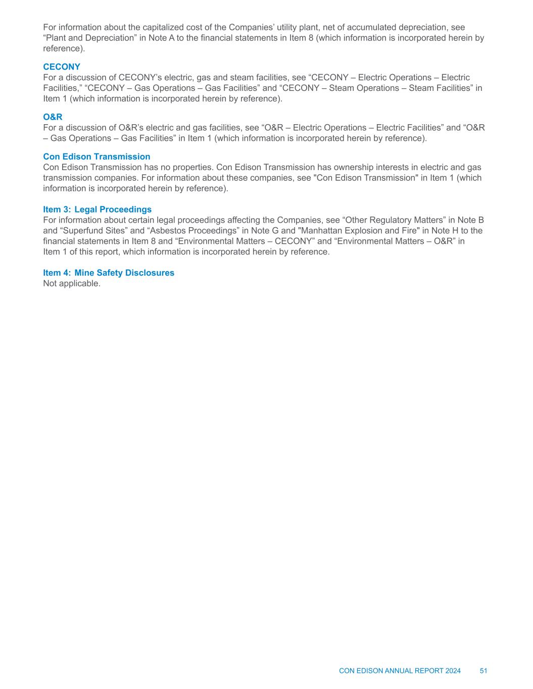 For information about the capitalized cost of the Companies’ utility plant, net of accumulated depreciation, see “Plant and Depreciation” in Note A to the financial statements in Item 8 (which information is incorporated herein by reference). CECONY For a discussion of CECONY’s electric, gas and steam facilities, see “CECONY – Electric Operations – Electric Facilities,” “CECONY – Gas Operations – Gas Facilities” and “CECONY – Steam Operations – Steam Facilities” in Item 1 (which information is incorporated herein by reference). O&R For a discussion of O&R’s electric and gas facilities, see “O&R – Electric Operations – Electric Facilities” and “O&R – Gas Operations – Gas Facilities” in Item 1 (which information is incorporated herein by reference). Con Edison Transmission Con Edison Transmission has no properties. Con Edison Transmission has ownership interests in electric and gas transmission companies. For information about these companies, see "Con Edison Transmission" in Item 1 (which information is incorporated herein by reference). Item 3: Legal Proceedings For information about certain legal proceedings affecting the Companies, see “Other Regulatory Matters” in Note B and “Superfund Sites” and “Asbestos Proceedings” in Note G and "Manhattan Explosion and Fire" in Note H to the financial statements in Item 8 and “Environmental Matters – CECONY” and “Environmental Matters – O&R” in Item 1 of this report, which information is incorporated herein by reference. Item 4: Mine Safety Disclosures Not applicable. CON EDISON ANNUAL REPORT 2024 51