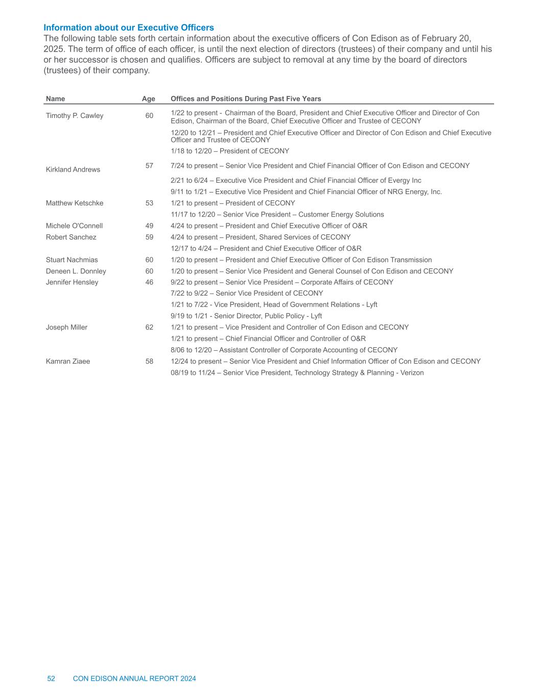 Information about our Executive Officers The following table sets forth certain information about the executive officers of Con Edison as of February 20, 2025. The term of office of each officer, is until the next election of directors (trustees) of their company and until his or her successor is chosen and qualifies. Officers are subject to removal at any time by the board of directors (trustees) of their company. Name Age Offices and Positions During Past Five Years Timothy P. Cawley 60 1/22 to present - Chairman of the Board, President and Chief Executive Officer and Director of Con Edison, Chairman of the Board, Chief Executive Officer and Trustee of CECONY 12/20 to 12/21 – President and Chief Executive Officer and Director of Con Edison and Chief Executive Officer and Trustee of CECONY 1/18 to 12/20 – President of CECONY Kirkland Andrews 57 7/24 to present – Senior Vice President and Chief Financial Officer of Con Edison and CECONY 2/21 to 6/24 – Executive Vice President and Chief Financial Officer of Evergy Inc 9/11 to 1/21 – Executive Vice President and Chief Financial Officer of NRG Energy, Inc. Matthew Ketschke 53 1/21 to present – President of CECONY 11/17 to 12/20 – Senior Vice President – Customer Energy Solutions Michele O'Connell 49 4/24 to present – President and Chief Executive Officer of O&R Robert Sanchez 59 4/24 to present – President, Shared Services of CECONY 12/17 to 4/24 – President and Chief Executive Officer of O&R Stuart Nachmias 60 1/20 to present – President and Chief Executive Officer of Con Edison Transmission Deneen L. Donnley 60 1/20 to present – Senior Vice President and General Counsel of Con Edison and CECONY Jennifer Hensley 46 9/22 to present – Senior Vice President – Corporate Affairs of CECONY 7/22 to 9/22 – Senior Vice President of CECONY 1/21 to 7/22 - Vice President, Head of Government Relations - Lyft 9/19 to 1/21 - Senior Director, Public Policy - Lyft Joseph Miller 62 1/21 to present – Vice President and Controller of Con Edison and CECONY 1/21 to present – Chief Financial Officer and Controller of O&R 8/06 to 12/20 – Assistant Controller of Corporate Accounting of CECONY Kamran Ziaee 58 12/24 to present – Senior Vice President and Chief Information Officer of Con Edison and CECONY 08/19 to 11/24 – Senior Vice President, Technology Strategy & Planning - Verizon 52 CON EDISON ANNUAL REPORT 2024