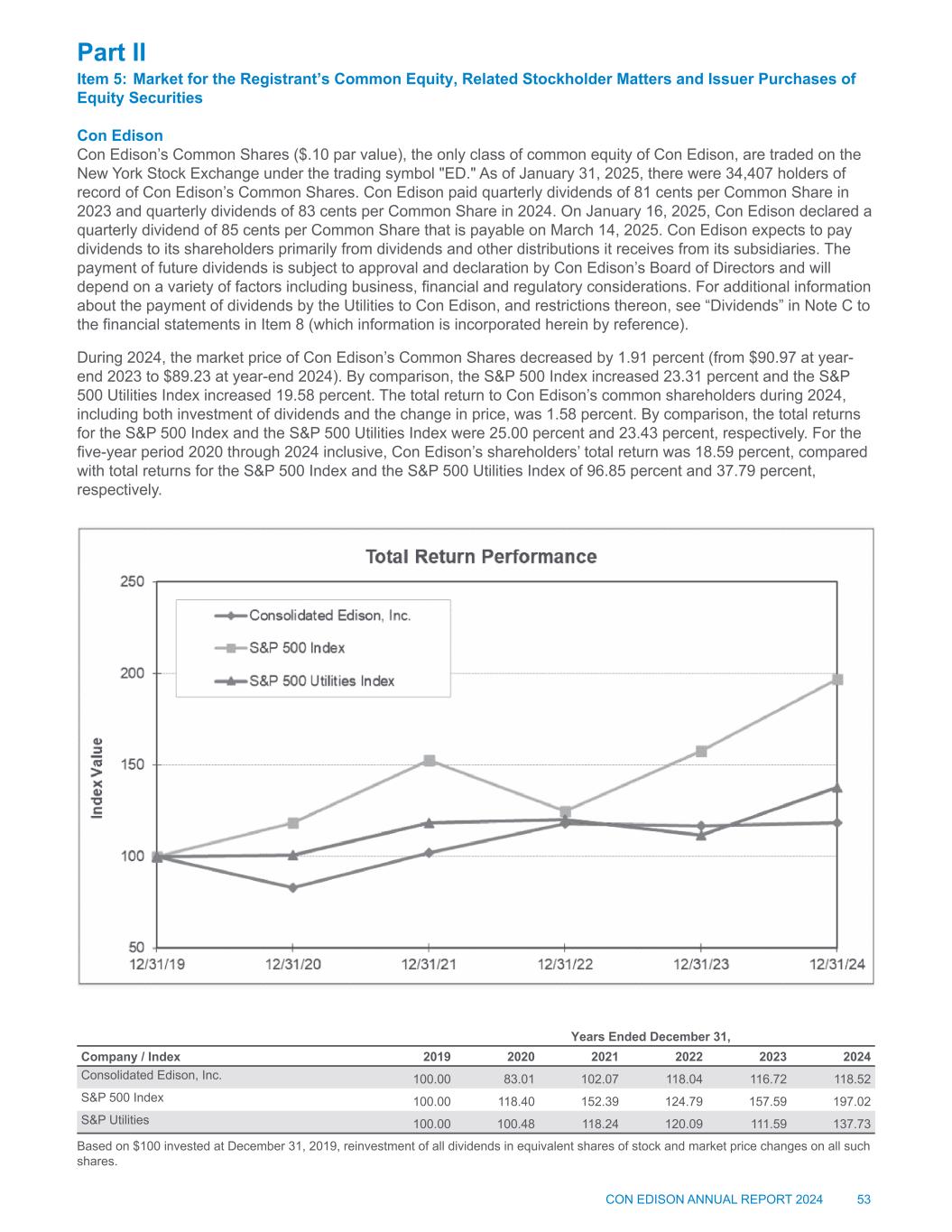 Part II Item 5: Market for the Registrant’s Common Equity, Related Stockholder Matters and Issuer Purchases of Equity Securities Con Edison Con Edison’s Common Shares ($.10 par value), the only class of common equity of Con Edison, are traded on the New York Stock Exchange under the trading symbol "ED." As of January 31, 2025, there were 34,407 holders of record of Con Edison’s Common Shares. Con Edison paid quarterly dividends of 81 cents per Common Share in 2023 and quarterly dividends of 83 cents per Common Share in 2024. On January 16, 2025, Con Edison declared a quarterly dividend of 85 cents per Common Share that is payable on March 14, 2025. Con Edison expects to pay dividends to its shareholders primarily from dividends and other distributions it receives from its subsidiaries. The payment of future dividends is subject to approval and declaration by Con Edison’s Board of Directors and will depend on a variety of factors including business, financial and regulatory considerations. For additional information about the payment of dividends by the Utilities to Con Edison, and restrictions thereon, see “Dividends” in Note C to the financial statements in Item 8 (which information is incorporated herein by reference). During 2024, the market price of Con Edison’s Common Shares decreased by 1.91 percent (from $90.97 at year- end 2023 to $89.23 at year-end 2024). By comparison, the S&P 500 Index increased 23.31 percent and the S&P 500 Utilities Index increased 19.58 percent. The total return to Con Edison’s common shareholders during 2024, including both investment of dividends and the change in price, was 1.58 percent. By comparison, the total returns for the S&P 500 Index and the S&P 500 Utilities Index were 25.00 percent and 23.43 percent, respectively. For the five-year period 2020 through 2024 inclusive, Con Edison’s shareholders’ total return was 18.59 percent, compared with total returns for the S&P 500 Index and the S&P 500 Utilities Index of 96.85 percent and 37.79 percent, respectively. Years Ended December 31, Company / Index 2019 2020 2021 2022 2023 2024 Consolidated Edison, Inc. 100.00 83.01 102.07 118.04 116.72 118.52 S&P 500 Index 100.00 118.40 152.39 124.79 157.59 197.02 S&P Utilities 100.00 100.48 118.24 120.09 111.59 137.73 Based on $100 invested at December 31, 2019, reinvestment of all dividends in equivalent shares of stock and market price changes on all such shares. CON EDISON ANNUAL REPORT 2024 53