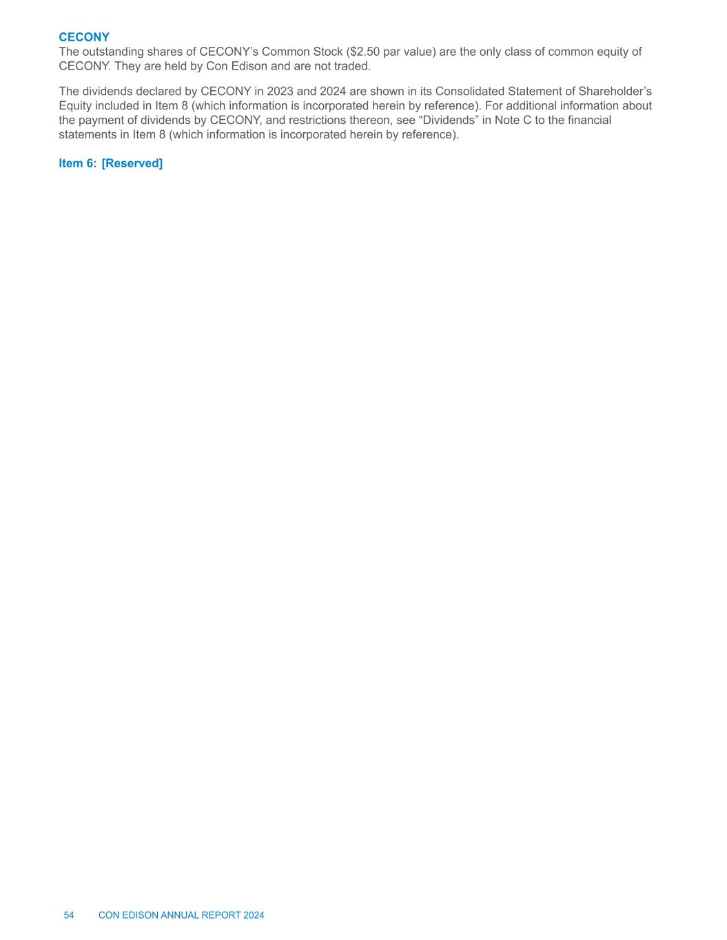 CECONY The outstanding shares of CECONY’s Common Stock ($2.50 par value) are the only class of common equity of CECONY. They are held by Con Edison and are not traded. The dividends declared by CECONY in 2023 and 2024 are shown in its Consolidated Statement of Shareholder’s Equity included in Item 8 (which information is incorporated herein by reference). For additional information about the payment of dividends by CECONY, and restrictions thereon, see “Dividends” in Note C to the financial statements in Item 8 (which information is incorporated herein by reference). Item 6: [Reserved] 54 CON EDISON ANNUAL REPORT 2024