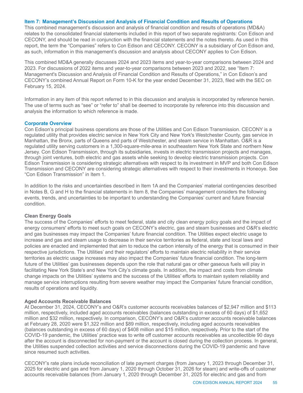 Item 7: Management’s Discussion and Analysis of Financial Condition and Results of Operations This combined management’s discussion and analysis of financial condition and results of operations (MD&A) relates to the consolidated financial statements included in this report of two separate registrants: Con Edison and CECONY, and should be read in conjunction with the financial statements and the notes thereto. As used in this report, the term the “Companies” refers to Con Edison and CECONY. CECONY is a subsidiary of Con Edison and, as such, information in this management’s discussion and analysis about CECONY applies to Con Edison. This combined MD&A generally discusses 2024 and 2023 items and year-to-year comparisons between 2024 and 2023. For discussions of 2022 items and year-to-year comparisons between 2023 and 2022, see “Item 7: Management's Discussion and Analysis of Financial Condition and Results of Operations,” in Con Edison’s and CECONY’s combined Annual Report on Form 10-K for the year ended December 31, 2023, filed with the SEC on February 15, 2024. Information in any item of this report referred to in this discussion and analysis is incorporated by reference herein. The use of terms such as “see” or “refer to” shall be deemed to incorporate by reference into this discussion and analysis the information to which reference is made. Corporate Overview Con Edison’s principal business operations are those of the Utilities and Con Edison Transmission. CECONY is a regulated utility that provides electric service in New York City and New York's Westchester County, gas service in Manhattan, the Bronx, parts of Queens and parts of Westchester, and steam service in Manhattan. O&R is a regulated utility serving customers in a 1,300-square-mile-area in southeastern New York State and northern New Jersey. Con Edison Transmission, through its subsidiaries, invests in electric transmission projects and manages, through joint ventures, both electric and gas assets while seeking to develop electric transmission projects. Con Edison Transmission is considering strategic alternatives with respect to its investment in MVP and both Con Edison Transmission and CECONY are considering strategic alternatives with respect to their investments in Honeoye. See “Con Edison Transmission” in Item 1. In addition to the risks and uncertainties described in Item 1A and the Companies’ material contingencies described in Notes B, G and H to the financial statements in Item 8, the Companies’ management considers the following events, trends, and uncertainties to be important to understanding the Companies’ current and future financial condition. Clean Energy Goals The success of the Companies’ efforts to meet federal, state and city clean energy policy goals and the impact of energy consumers' efforts to meet such goals on CECONY’s electric, gas and steam businesses and O&R’s electric and gas businesses may impact the Companies’ future financial condition. The Utilities expect electric usage to increase and gas and steam usage to decrease in their service territories as federal, state and local laws and policies are enacted and implemented that aim to reduce the carbon intensity of the energy that is consumed in their respective jurisdictions. The Utilities’ and their regulators’ efforts to maintain electric reliability in their service territories as electric usage increases may also impact the Companies’ future financial condition. The long-term future of the Utilities’ gas businesses depends upon the role that natural gas or other gaseous fuels will play in facilitating New York State’s and New York City’s climate goals. In addition, the impact and costs from climate change impacts on the Utilities’ systems and the success of the Utilities’ efforts to maintain system reliability and manage service interruptions resulting from severe weather may impact the Companies’ future financial condition, results of operations and liquidity. Aged Accounts Receivable Balances At December 31, 2024, CECONY’s and O&R’s customer accounts receivables balances of $2,947 million and $113 million, respectively, included aged accounts receivables (balances outstanding in excess of 60 days) of $1,652 million and $32 million, respectively. In comparison, CECONY’s and O&R’s customer accounts receivable balances at February 28, 2020 were $1,322 million and $89 million, respectively, including aged accounts receivables (balances outstanding in excess of 60 days) of $408 million and $15 million, respectively. Prior to the start of the COVID-19 pandemic, the Utilities’ practice was to write off customer accounts receivables as uncollectible 90 days after the account is disconnected for non-payment or the account is closed during the collection process. In general, the Utilities suspended collection activities and service disconnections during the COVID-19 pandemic and have since resumed such activities. CECONY’s rate plans include reconciliation of late payment charges (from January 1, 2023 through December 31, 2025 for electric and gas and from January 1, 2020 through October 31, 2026 for steam) and write-offs of customer accounts receivable balances (from January 1, 2020 through December 31, 2025 for electric and gas and from CON EDISON ANNUAL REPORT 2024 55