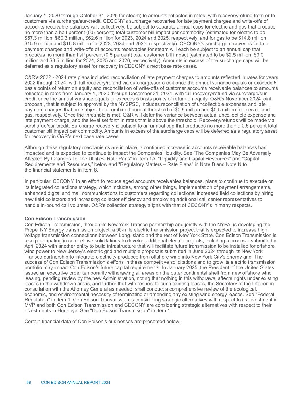 January 1, 2020 through October 31, 2026 for steam) to amounts reflected in rates, with recovery/refund from or to customers via surcharge/sur-credit. CECONY's surcharge recoveries for late payment charges and write-offs of accounts receivable balances will, collectively, be subject to separate annual caps for electric and gas that produce no more than a half percent (0.5 percent) total customer bill impact per commodity (estimated for electric to be $57.3 million, $60.3 million, $62.6 million for 2023, 2024 and 2025, respectively, and for gas to be $14.8 million, $15.9 million and $16.8 million for 2023, 2024 and 2025, respectively). CECONY's surcharge recoveries for late payment charges and write-offs of accounts receivables for steam will each be subject to an annual cap that produces no more than half percent (0.5 percent) total customer bill impact (estimated to be $2.5 million, $3.0 million and $3.5 million for 2024, 2025 and 2026, respectively). Amounts in excess of the surcharge caps will be deferred as a regulatory asset for recovery in CECONY’s next base rate cases. O&R’s 2022 - 2024 rate plans included reconciliation of late payment charges to amounts reflected in rates for years 2022 through 2024, with full recovery/refund via surcharge/sur-credit once the annual variance equals or exceeds 5 basis points of return on equity and reconciliation of write-offs of customer accounts receivable balances to amounts reflected in rates from January 1, 2020 through December 31, 2024, with full recovery/refund via surcharge/sur- credit once the annual variance equals or exceeds 5 basis points of return on equity. O&R’s November 2024 joint proposal, that is subject to approval by the NYSPSC, includes reconciliation of uncollectible expenses and late payment charges that are subject to a combined annual threshold of $0.9 million and $0.5 million for electric and gas, respectively. Once the threshold is met, O&R will defer the variance between actual uncollectible expense and late payment charge, and the level set forth in rates that is above the threshold. Recovery/refunds will be made via surcharge/sur-credit. Surcharge recovery is subject to an annual cap that produces no more than a 0.5 percent total customer bill impact per commodity. Amounts in excess of the surcharge caps will be deferred as a regulatory asset for recovery in O&R’s next base rate cases. Although these regulatory mechanisms are in place, a continued increase in accounts receivable balances has impacted and is expected to continue to impact the Companies’ liquidity. See “The Companies May Be Adversely Affected By Changes To The Utilities' Rate Pans" in Item 1A, “Liquidity and Capital Resources” and “Capital Requirements and Resources,” below and "Regulatory Matters – Rate Plans" in Note B and Note N to the financial statements in Item 8. In particular, CECONY, in an effort to reduce aged accounts receivables balances, plans to continue to execute on its integrated collections strategy, which includes, among other things, implementation of payment arrangements, enhanced digital and mail communications to customers regarding collections, increased field collections by hiring new field collectors and increasing collector efficiency and employing additional call center representatives to handle in-bound call volumes. O&R's collection strategy aligns with that of CECONY's in many respects. Con Edison Transmission Con Edison Transmission, through its New York Transco partnership and jointly with the NYPA, is developing the Propel NY Energy transmission project, a 90-mile electric transmission project that is expected to increase high voltage transmission connections between Long Island and the rest of New York State. Con Edison Transmission is also participating in competitive solicitations to develop additional electric projects, including a proposal submitted in April 2024 with another entity to build infrastructure that will facilitate future transmission to be installed for offshore wind power to New Jersey's electric grid and multiple proposals submitted in June 2024 through its New York Transco partnership to integrate electricity produced from offshore wind into New York City's energy grid. The success of Con Edison Transmission’s efforts in these competitive solicitations and to grow its electric transmission portfolio may impact Con Edison’s future capital requirements. In January 2025, the President of the United States issued an executive order temporarily withdrawing all areas on the outer continental shelf from new offshore wind leasing, pending review by the new Administration, noting that nothing in this withdrawal affects rights under existing leases in the withdrawn areas, and further that with respect to such existing leases, the Secretary of the Interior, in consultation with the Attorney General as needed, shall conduct a comprehensive review of the ecological, economic, and environmental necessity of terminating or amending any existing wind energy leases. See "Federal Regulation" in Item 1. Con Edison Transmission is considering strategic alternatives with respect to its investment in MVP and both Con Edison Transmission and CECONY are considering strategic alternatives with respect to their investments in Honeoye. See "Con Edison Transmission" in Item 1. Certain financial data of Con Edison’s businesses are presented below: 56 CON EDISON ANNUAL REPORT 2024