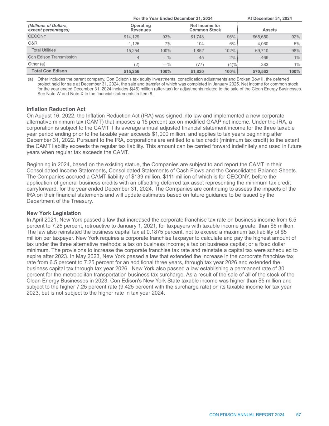 For the Year Ended December 31, 2024 At December 31, 2024 (Millions of Dollars, except percentages) Operating Revenues Net Income for Common Stock Assets CECONY $14,129 93% $1,748 96% $65,650 92% O&R 1,125 7% 104 6% 4,060 6% Total Utilities 15,254 100% 1,852 102% 69,710 98% Con Edison Transmission 4 —% 45 2% 469 1% Other (a) (2) —% (77) (4) % 383 1% Total Con Edison $15,256 100% $1,820 100% $70,562 100% (a) Other includes the parent company, Con Edison’s tax equity investments, consolidation adjustments and Broken Bow II, the deferred project held for sale at December 31, 2024, the sale and transfer of which was completed in January 2025. Net income for common stock for the year ended December 31, 2024 includes $(46) million (after-tax) for adjustments related to the sale of the Clean Energy Businesses. See Note W and Note X to the financial statements in Item 8. Inflation Reduction Act On August 16, 2022, the Inflation Reduction Act (IRA) was signed into law and implemented a new corporate alternative minimum tax (CAMT) that imposes a 15 percent tax on modified GAAP net income. Under the IRA, a corporation is subject to the CAMT if its average annual adjusted financial statement income for the three taxable year period ending prior to the taxable year exceeds $1,000 million, and applies to tax years beginning after December 31, 2022. Pursuant to the IRA, corporations are entitled to a tax credit (minimum tax credit) to the extent the CAMT liability exceeds the regular tax liability. This amount can be carried forward indefinitely and used in future years when regular tax exceeds the CAMT. Beginning in 2024, based on the existing statue, the Companies are subject to and report the CAMT in their Consolidated Income Statements, Consolidated Statements of Cash Flows and the Consolidated Balance Sheets. The Companies accrued a CAMT liability of $139 million, $111 million of which is for CECONY, before the application of general business credits with an offsetting deferred tax asset representing the minimum tax credit carryforward, for the year ended December 31, 2024. The Companies are continuing to assess the impacts of the IRA on their financial statements and will update estimates based on future guidance to be issued by the Department of the Treasury. New York Legislation In April 2021, New York passed a law that increased the corporate franchise tax rate on business income from 6.5 percent to 7.25 percent, retroactive to January 1, 2021, for taxpayers with taxable income greater than $5 million. The law also reinstated the business capital tax at 0.1875 percent, not to exceed a maximum tax liability of $5 million per taxpayer. New York requires a corporate franchise taxpayer to calculate and pay the highest amount of tax under the three alternative methods: a tax on business income; a tax on business capital; or a fixed dollar minimum. The provisions to increase the corporate franchise tax rate and reinstate a capital tax were scheduled to expire after 2023. In May 2023, New York passed a law that extended the increase in the corporate franchise tax rate from 6.5 percent to 7.25 percent for an additional three years, through tax year 2026 and extended the business capital tax through tax year 2026. New York also passed a law establishing a permanent rate of 30 percent for the metropolitan transportation business tax surcharge. As a result of the sale of all of the stock of the Clean Energy Businesses in 2023, Con Edison's New York State taxable income was higher than $5 million and subject to the higher 7.25 percent rate (9.425 percent with the surcharge rate) on its taxable income for tax year 2023, but is not subject to the higher rate in tax year 2024. CON EDISON ANNUAL REPORT 2024 57