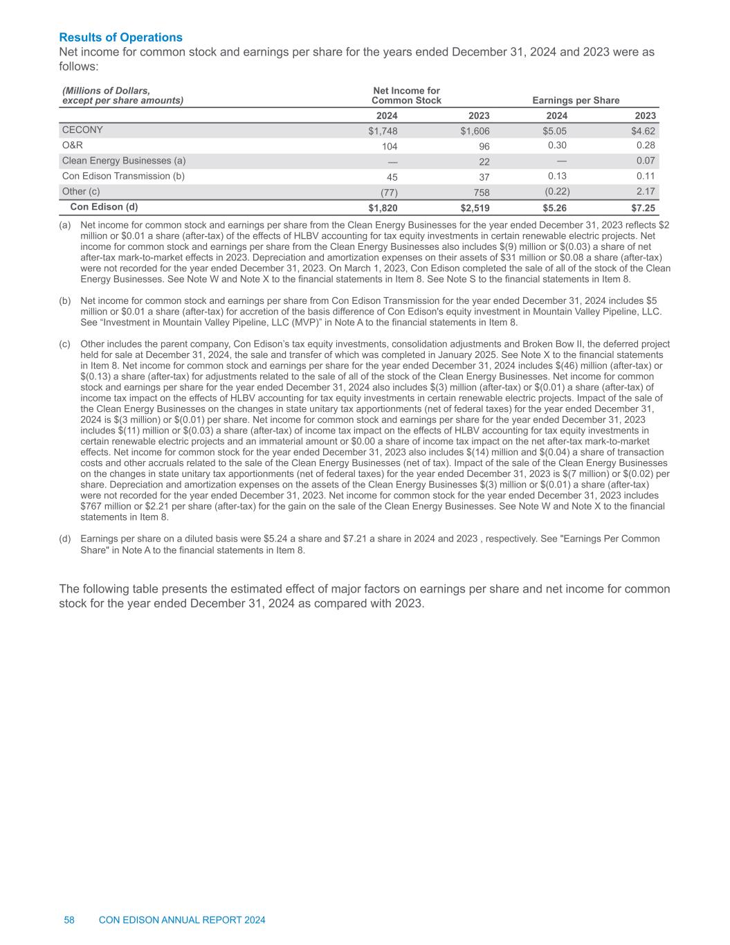 Results of Operations Net income for common stock and earnings per share for the years ended December 31, 2024 and 2023 were as follows: (Millions of Dollars, except per share amounts) Net Income for Common Stock Earnings per Share 2024 2023 2024 2023 CECONY $1,748 $1,606 $5.05 $4.62 O&R 104 96 0.30 0.28 Clean Energy Businesses (a) — 22 — 0.07 Con Edison Transmission (b) 45 37 0.13 0.11 Other (c) (77) 758 (0.22) 2.17 Con Edison (d) $1,820 $2,519 $5.26 $7.25 (a) Net income for common stock and earnings per share from the Clean Energy Businesses for the year ended December 31, 2023 reflects $2 million or $0.01 a share (after-tax) of the effects of HLBV accounting for tax equity investments in certain renewable electric projects. Net income for common stock and earnings per share from the Clean Energy Businesses also includes $(9) million or $(0.03) a share of net after-tax mark-to-market effects in 2023. Depreciation and amortization expenses on their assets of $31 million or $0.08 a share (after-tax) were not recorded for the year ended December 31, 2023. On March 1, 2023, Con Edison completed the sale of all of the stock of the Clean Energy Businesses. See Note W and Note X to the financial statements in Item 8. See Note S to the financial statements in Item 8. (b) Net income for common stock and earnings per share from Con Edison Transmission for the year ended December 31, 2024 includes $5 million or $0.01 a share (after-tax) for accretion of the basis difference of Con Edison's equity investment in Mountain Valley Pipeline, LLC. See “Investment in Mountain Valley Pipeline, LLC (MVP)” in Note A to the financial statements in Item 8. (c) Other includes the parent company, Con Edison’s tax equity investments, consolidation adjustments and Broken Bow II, the deferred project held for sale at December 31, 2024, the sale and transfer of which was completed in January 2025. See Note X to the financial statements in Item 8. Net income for common stock and earnings per share for the year ended December 31, 2024 includes $(46) million (after-tax) or $(0.13) a share (after-tax) for adjustments related to the sale of all of the stock of the Clean Energy Businesses. Net income for common stock and earnings per share for the year ended December 31, 2024 also includes $(3) million (after-tax) or $(0.01) a share (after-tax) of income tax impact on the effects of HLBV accounting for tax equity investments in certain renewable electric projects. Impact of the sale of the Clean Energy Businesses on the changes in state unitary tax apportionments (net of federal taxes) for the year ended December 31, 2024 is $(3 million) or $(0.01) per share. Net income for common stock and earnings per share for the year ended December 31, 2023 includes $(11) million or $(0.03) a share (after-tax) of income tax impact on the effects of HLBV accounting for tax equity investments in certain renewable electric projects and an immaterial amount or $0.00 a share of income tax impact on the net after-tax mark-to-market effects. Net income for common stock for the year ended December 31, 2023 also includes $(14) million and $(0.04) a share of transaction costs and other accruals related to the sale of the Clean Energy Businesses (net of tax). Impact of the sale of the Clean Energy Businesses on the changes in state unitary tax apportionments (net of federal taxes) for the year ended December 31, 2023 is $(7 million) or $(0.02) per share. Depreciation and amortization expenses on the assets of the Clean Energy Businesses $(3) million or $(0.01) a share (after-tax) were not recorded for the year ended December 31, 2023. Net income for common stock for the year ended December 31, 2023 includes $767 million or $2.21 per share (after-tax) for the gain on the sale of the Clean Energy Businesses. See Note W and Note X to the financial statements in Item 8. (d) Earnings per share on a diluted basis were $5.24 a share and $7.21 a share in 2024 and 2023 , respectively. See "Earnings Per Common Share" in Note A to the financial statements in Item 8. The following table presents the estimated effect of major factors on earnings per share and net income for common stock for the year ended December 31, 2024 as compared with 2023. 58 CON EDISON ANNUAL REPORT 2024