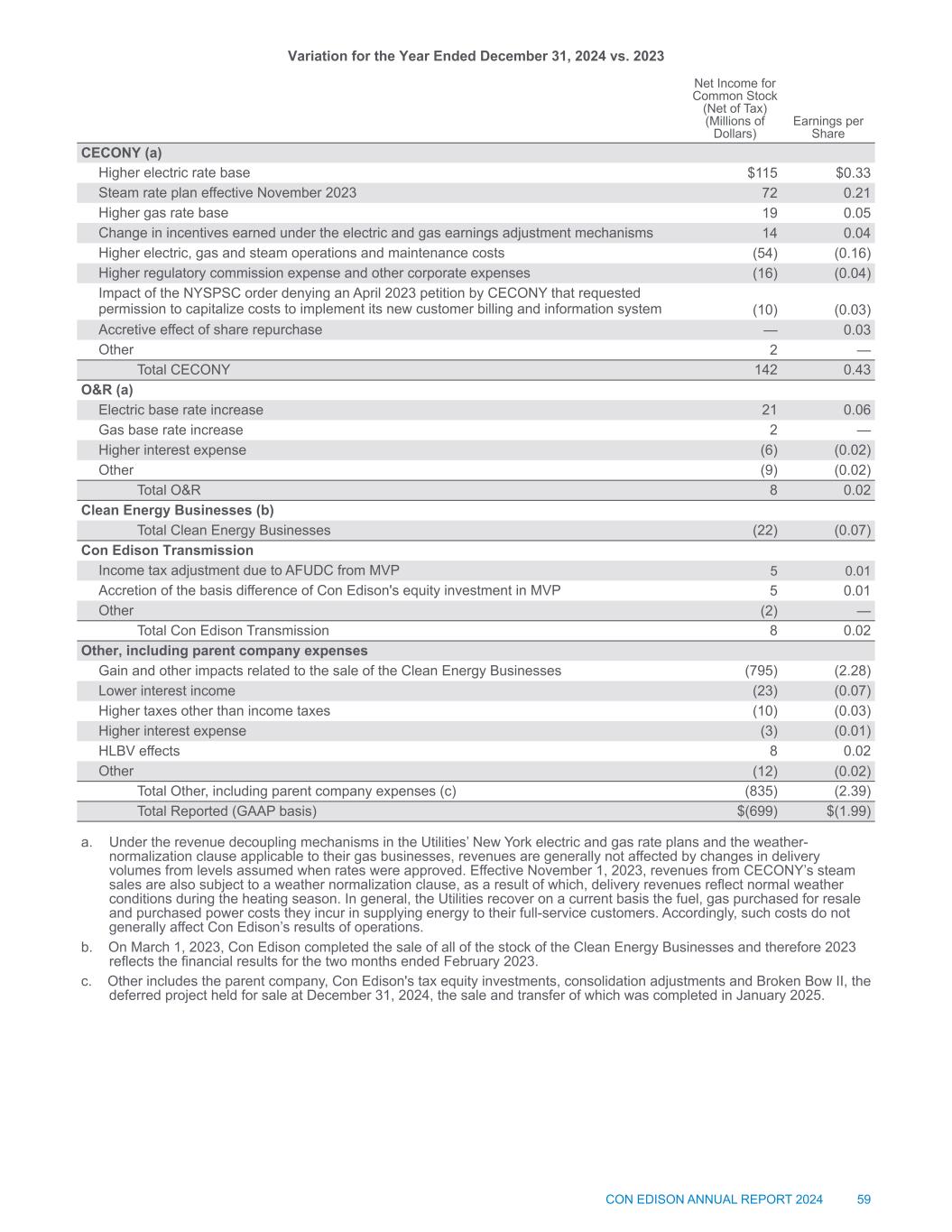 Variation for the Year Ended December 31, 2024 vs. 2023 Net Income for Common Stock (Net of Tax) (Millions of Dollars) Earnings per Share CECONY (a) Higher electric rate base $115 $0.33 Steam rate plan effective November 2023 72 0.21 Higher gas rate base 19 0.05 Change in incentives earned under the electric and gas earnings adjustment mechanisms 14 0.04 Higher electric, gas and steam operations and maintenance costs (54) (0.16) Higher regulatory commission expense and other corporate expenses (16) (0.04) Impact of the NYSPSC order denying an April 2023 petition by CECONY that requested permission to capitalize costs to implement its new customer billing and information system (10) (0.03) Accretive effect of share repurchase — 0.03 Other 2 — Total CECONY 142 0.43 O&R (a) Electric base rate increase 21 0.06 Gas base rate increase 2 — Higher interest expense (6) (0.02) Other (9) (0.02) Total O&R 8 0.02 Clean Energy Businesses (b) Total Clean Energy Businesses (22) (0.07) Con Edison Transmission Income tax adjustment due to AFUDC from MVP 5 0.01 Accretion of the basis difference of Con Edison's equity investment in MVP 5 0.01 Other (2) — Total Con Edison Transmission 8 0.02 Other, including parent company expenses Gain and other impacts related to the sale of the Clean Energy Businesses (795) (2.28) Lower interest income (23) (0.07) Higher taxes other than income taxes (10) (0.03) Higher interest expense (3) (0.01) HLBV effects 8 0.02 Other (12) (0.02) Total Other, including parent company expenses (c) (835) (2.39) Total Reported (GAAP basis) $(699) $(1.99) a. Under the revenue decoupling mechanisms in the Utilities’ New York electric and gas rate plans and the weather- normalization clause applicable to their gas businesses, revenues are generally not affected by changes in delivery volumes from levels assumed when rates were approved. Effective November 1, 2023, revenues from CECONY’s steam sales are also subject to a weather normalization clause, as a result of which, delivery revenues reflect normal weather conditions during the heating season. In general, the Utilities recover on a current basis the fuel, gas purchased for resale and purchased power costs they incur in supplying energy to their full-service customers. Accordingly, such costs do not generally affect Con Edison’s results of operations. b. On March 1, 2023, Con Edison completed the sale of all of the stock of the Clean Energy Businesses and therefore 2023 reflects the financial results for the two months ended February 2023. c. Other includes the parent company, Con Edison's tax equity investments, consolidation adjustments and Broken Bow II, the deferred project held for sale at December 31, 2024, the sale and transfer of which was completed in January 2025. CON EDISON ANNUAL REPORT 2024 59
