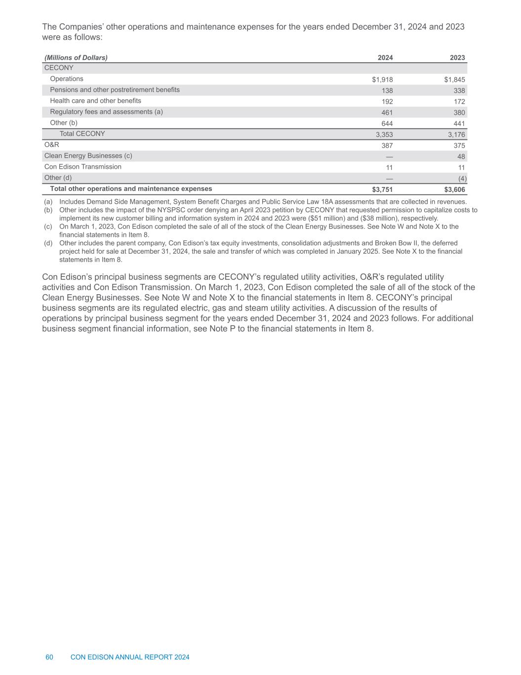 The Companies’ other operations and maintenance expenses for the years ended December 31, 2024 and 2023 were as follows: (Millions of Dollars) 2024 2023 CECONY Operations $1,918 $1,845 Pensions and other postretirement benefits 138 338 Health care and other benefits 192 172 Regulatory fees and assessments (a) 461 380 Other (b) 644 441 Total CECONY 3,353 3,176 O&R 387 375 Clean Energy Businesses (c) — 48 Con Edison Transmission 11 11 Other (d) — (4) Total other operations and maintenance expenses $3,751 $3,606 (a) Includes Demand Side Management, System Benefit Charges and Public Service Law 18A assessments that are collected in revenues. (b) Other includes the impact of the NYSPSC order denying an April 2023 petition by CECONY that requested permission to capitalize costs to implement its new customer billing and information system in 2024 and 2023 were ($51 million) and ($38 million), respectively. (c) On March 1, 2023, Con Edison completed the sale of all of the stock of the Clean Energy Businesses. See Note W and Note X to the financial statements in Item 8. (d) Other includes the parent company, Con Edison’s tax equity investments, consolidation adjustments and Broken Bow II, the deferred project held for sale at December 31, 2024, the sale and transfer of which was completed in January 2025. See Note X to the financial statements in Item 8. Con Edison’s principal business segments are CECONY’s regulated utility activities, O&R’s regulated utility activities and Con Edison Transmission. On March 1, 2023, Con Edison completed the sale of all of the stock of the Clean Energy Businesses. See Note W and Note X to the financial statements in Item 8. CECONY’s principal business segments are its regulated electric, gas and steam utility activities. A discussion of the results of operations by principal business segment for the years ended December 31, 2024 and 2023 follows. For additional business segment financial information, see Note P to the financial statements in Item 8. 60 CON EDISON ANNUAL REPORT 2024