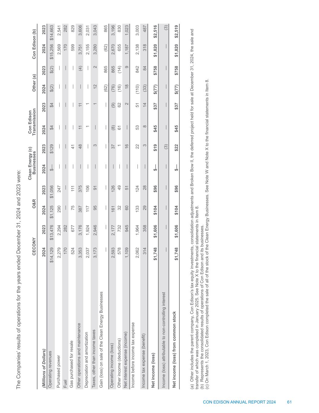 Th e C om pa ni es ’ r es ul ts o f o pe ra tio ns fo r t he y ea rs e nd ed D ec em be r 3 1, 2 02 4 an d 20 23 w er e: C EC O N Y O & R C le an E ne rg y (c ) B us in es se s C on E di so n Tr an sm is si on O th er (a ) C on E di so n (b ) (M ill io ns o f D ol la rs ) 20 24 20 23 20 24 20 23 20 24 20 23 20 24 20 23 20 24 20 23 20 24 20 23 O pe ra tin g re ve nu es $1 4, 12 9 $1 3, 47 6 $1 ,1 25 $1 ,0 56 $— $1 29 $4 $4 $( 2) $( 2) $1 5, 25 6 $1 4, 66 3 P ur ch as ed p ow er 2, 27 9 2, 29 4 29 0 24 7 — — — — — — 2, 56 9 2, 54 1 Fu el 17 0 28 2 — — — — — — — — 17 0 28 2 G as p ur ch as ed fo r r es al e 52 4 67 7 75 11 1 — 41 — — — — 59 9 82 9 O th er o pe ra tio ns a nd m ai nt en an ce 3, 35 3 3, 17 6 38 7 37 5 — 48 11 11 — (4 ) 3, 75 1 3, 60 6 D ep re ci at io n an d am or tiz at io n 2, 03 7 1, 92 4 11 7 10 6 — — 1 1 — — 2, 15 5 2, 03 1 Ta xe s, o th er th an in co m e ta xe s 3, 17 3 2, 94 6 95 91 — 3 — 1 12 2 3, 28 0 3, 04 3 G ai n (lo ss ) o n sa le o f t he C le an E ne rg y B us in es se s — — — — — — — — (6 2) 86 5 (6 2) 86 5 O pe ra tin g in co m e (lo ss ) 2, 59 3 2, 17 7 16 1 12 6 — 37 (8 ) (9 ) (7 6) 86 5 2, 67 0 3, 19 6 O th er in co m e (d ed uc tio ns ) 57 8 73 2 32 49 — 1 61 62 (1 6) (1 4) 65 5 83 0 N et in te re st e xp en se (i nc om e) 1, 10 9 94 5 60 51 — 16 — 2 18 9 1, 18 7 1, 02 3 In co m e be fo re in co m e ta x ex pe ns e 2, 06 2 1, 96 4 13 3 12 4 — 22 53 51 (1 10 ) 84 2 2, 13 8 3, 00 3 In co m e ta x ex pe ns e (b en ef it) 31 4 35 8 29 28 — 3 8 14 (3 3) 84 31 8 48 7 N et in co m e (lo ss ) $1 ,7 48 $1 ,6 06 $1 04 $9 6 $— $1 9 $4 5 $3 7 $( 77 ) $7 58 $1 ,8 20 $2 ,5 16 In co m e (lo ss ) a ttr ib ut ab le to n on -c on tro lli ng in te re st — — — — — (3 ) — — — — — (3 ) N et in co m e (lo ss ) f ro m c om m on s to ck $1 ,7 48 $1 ,6 06 $1 04 $9 6 $— $2 2 $4 5 $3 7 $( 77 ) $7 58 $1 ,8 20 $2 ,5 19 (a ) O th er in cl ud es th e pa re nt c om pa ny , C on E di so n’ s ta x eq ui ty in ve st m en ts , c on so lid at io n ad ju st m en ts a nd B ro ke n B ow II , t he d ef er re d pr oj ec t h el d fo r s al e at D ec em be r 3 1, 2 02 4, th e sa le a nd tra ns fe r o f w hi ch w as c om pl et ed in J an ua ry 2 02 5. S ee N ot e X to th e fin an ci al s ta te m en ts in It em 8 . (b ) R ep re se nt s th e co ns ol id at ed re su lts o f o pe ra tio ns o f C on E di so n an d its b us in es se s. (c )O n M ar ch 1 , 2 02 3, C on E di so n co m pl et ed th e sa le o f a ll of th e st oc k of th e C le an E ne rg y B us in es se s. S ee N ot e W a nd N ot e X to th e fin an ci al s ta te m en ts in It em 8 . CON EDISON ANNUAL REPORT 2024 61