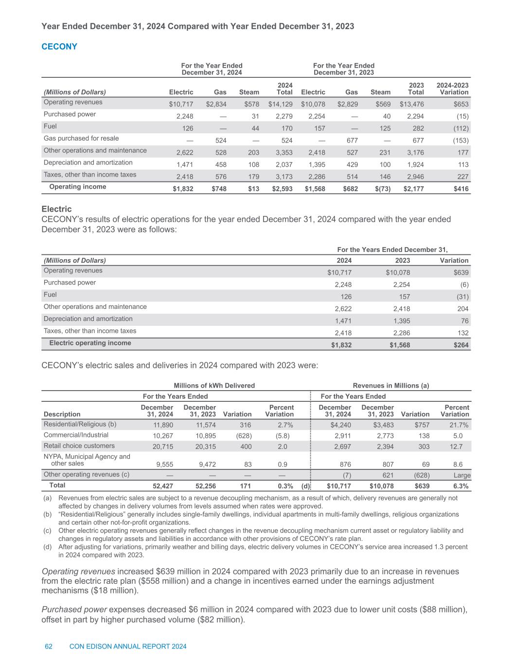 Year Ended December 31, 2024 Compared with Year Ended December 31, 2023 CECONY For the Year Ended December 31, 2024 For the Year Ended December 31, 2023 (Millions of Dollars) Electric Gas Steam 2024 Total Electric Gas Steam 2023 Total 2024-2023 Variation Operating revenues $10,717 $2,834 $578 $14,129 $10,078 $2,829 $569 $13,476 $653 Purchased power 2,248 — 31 2,279 2,254 — 40 2,294 (15) Fuel 126 — 44 170 157 — 125 282 (112) Gas purchased for resale — 524 — 524 — 677 — 677 (153) Other operations and maintenance 2,622 528 203 3,353 2,418 527 231 3,176 177 Depreciation and amortization 1,471 458 108 2,037 1,395 429 100 1,924 113 Taxes, other than income taxes 2,418 576 179 3,173 2,286 514 146 2,946 227 Operating income $1,832 $748 $13 $2,593 $1,568 $682 $(73) $2,177 $416 Electric CECONY’s results of electric operations for the year ended December 31, 2024 compared with the year ended December 31, 2023 were as follows: For the Years Ended December 31, (Millions of Dollars) 2024 2023 Variation Operating revenues $10,717 $10,078 $639 Purchased power 2,248 2,254 (6) Fuel 126 157 (31) Other operations and maintenance 2,622 2,418 204 Depreciation and amortization 1,471 1,395 76 Taxes, other than income taxes 2,418 2,286 132 Electric operating income $1,832 $1,568 $264 CECONY’s electric sales and deliveries in 2024 compared with 2023 were: Millions of kWh Delivered Revenues in Millions (a) For the Years Ended For the Years Ended Description December 31, 2024 December 31, 2023 Variation Percent Variation December 31, 2024 December 31, 2023 Variation Percent Variation Residential/Religious (b) 11,890 11,574 316 2.7% $4,240 $3,483 $757 21.7% Commercial/Industrial 10,267 10,895 (628) (5.8) 2,911 2,773 138 5.0 Retail choice customers 20,715 20,315 400 2.0 2,697 2,394 303 12.7 NYPA, Municipal Agency and other sales 9,555 9,472 83 0.9 876 807 69 8.6 Other operating revenues (c) — — — — (7) 621 (628) Large Total 52,427 52,256 171 0.3% (d) $10,717 $10,078 $639 6.3% (a) Revenues from electric sales are subject to a revenue decoupling mechanism, as a result of which, delivery revenues are generally not affected by changes in delivery volumes from levels assumed when rates were approved. (b) “Residential/Religious” generally includes single-family dwellings, individual apartments in multi-family dwellings, religious organizations and certain other not-for-profit organizations. (c) Other electric operating revenues generally reflect changes in the revenue decoupling mechanism current asset or regulatory liability and changes in regulatory assets and liabilities in accordance with other provisions of CECONY’s rate plan. (d) After adjusting for variations, primarily weather and billing days, electric delivery volumes in CECONY’s service area increased 1.3 percent in 2024 compared with 2023. Operating revenues increased $639 million in 2024 compared with 2023 primarily due to an increase in revenues from the electric rate plan ($558 million) and a change in incentives earned under the earnings adjustment mechanisms ($18 million). Purchased power expenses decreased $6 million in 2024 compared with 2023 due to lower unit costs ($88 million), offset in part by higher purchased volume ($82 million). 62 CON EDISON ANNUAL REPORT 2024