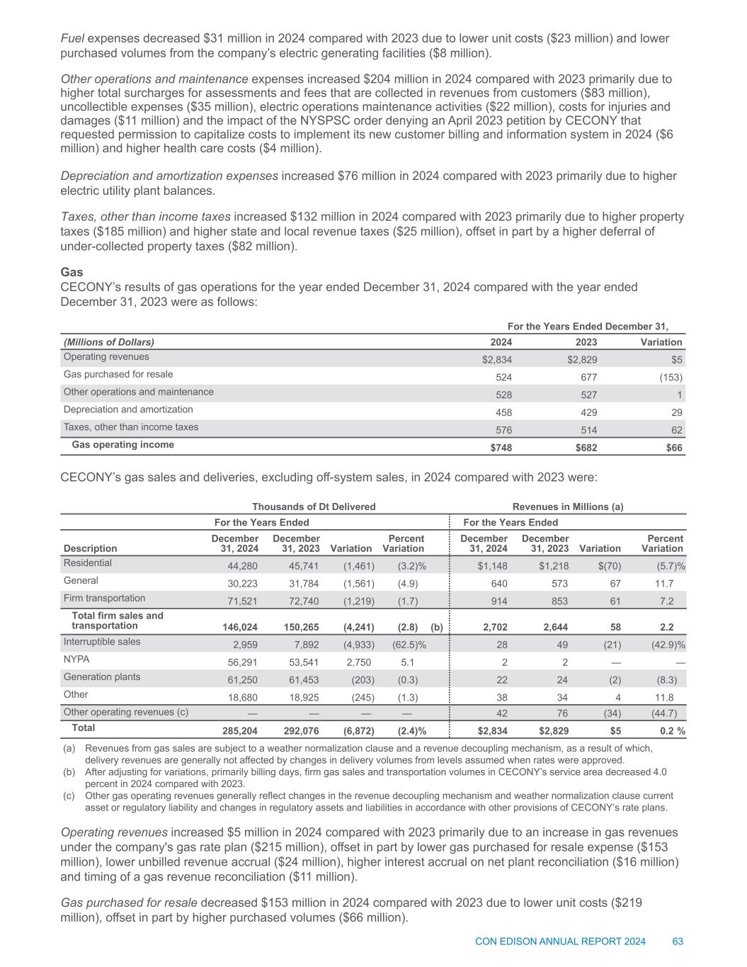 Fuel expenses decreased $31 million in 2024 compared with 2023 due to lower unit costs ($23 million) and lower purchased volumes from the company’s electric generating facilities ($8 million). Other operations and maintenance expenses increased $204 million in 2024 compared with 2023 primarily due to higher total surcharges for assessments and fees that are collected in revenues from customers ($83 million), uncollectible expenses ($35 million), electric operations maintenance activities ($22 million), costs for injuries and damages ($11 million) and the impact of the NYSPSC order denying an April 2023 petition by CECONY that requested permission to capitalize costs to implement its new customer billing and information system in 2024 ($6 million) and higher health care costs ($4 million). Depreciation and amortization expenses increased $76 million in 2024 compared with 2023 primarily due to higher electric utility plant balances. Taxes, other than income taxes increased $132 million in 2024 compared with 2023 primarily due to higher property taxes ($185 million) and higher state and local revenue taxes ($25 million), offset in part by a higher deferral of under-collected property taxes ($82 million). Gas CECONY’s results of gas operations for the year ended December 31, 2024 compared with the year ended December 31, 2023 were as follows: For the Years Ended December 31, (Millions of Dollars) 2024 2023 Variation Operating revenues $2,834 $2,829 $5 Gas purchased for resale 524 677 (153) Other operations and maintenance 528 527 1 Depreciation and amortization 458 429 29 Taxes, other than income taxes 576 514 62 Gas operating income $748 $682 $66 CECONY’s gas sales and deliveries, excluding off-system sales, in 2024 compared with 2023 were: Thousands of Dt Delivered Revenues in Millions (a) For the Years Ended For the Years Ended Description December 31, 2024 December 31, 2023 Variation Percent Variation December 31, 2024 December 31, 2023 Variation Percent Variation Residential 44,280 45,741 (1,461) (3.2) % $1,148 $1,218 $(70) (5.7) % General 30,223 31,784 (1,561) (4.9) 640 573 67 11.7 Firm transportation 71,521 72,740 (1,219) (1.7) 914 853 61 7.2 Total firm sales and transportation 146,024 150,265 (4,241) (2.8) (b) 2,702 2,644 58 2.2 Interruptible sales 2,959 7,892 (4,933) (62.5) % 28 49 (21) (42.9) % NYPA 56,291 53,541 2,750 5.1 2 2 — — Generation plants 61,250 61,453 (203) (0.3) 22 24 (2) (8.3) Other 18,680 18,925 (245) (1.3) 38 34 4 11.8 Other operating revenues (c) — — — — 42 76 (34) (44.7) Total 285,204 292,076 (6,872) (2.4) % $2,834 $2,829 $5 0.2 % (a) Revenues from gas sales are subject to a weather normalization clause and a revenue decoupling mechanism, as a result of which, delivery revenues are generally not affected by changes in delivery volumes from levels assumed when rates were approved. (b) After adjusting for variations, primarily billing days, firm gas sales and transportation volumes in CECONY’s service area decreased 4.0 percent in 2024 compared with 2023. (c) Other gas operating revenues generally reflect changes in the revenue decoupling mechanism and weather normalization clause current asset or regulatory liability and changes in regulatory assets and liabilities in accordance with other provisions of CECONY’s rate plans. Operating revenues increased $5 million in 2024 compared with 2023 primarily due to an increase in gas revenues under the company's gas rate plan ($215 million), offset in part by lower gas purchased for resale expense ($153 million), lower unbilled revenue accrual ($24 million), higher interest accrual on net plant reconciliation ($16 million) and timing of a gas revenue reconciliation ($11 million). Gas purchased for resale decreased $153 million in 2024 compared with 2023 due to lower unit costs ($219 million), offset in part by higher purchased volumes ($66 million). CON EDISON ANNUAL REPORT 2024 63