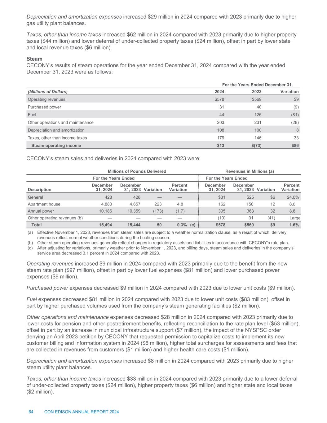 Depreciation and amortization expenses increased $29 million in 2024 compared with 2023 primarily due to higher gas utility plant balances. Taxes, other than income taxes increased $62 million in 2024 compared with 2023 primarily due to higher property taxes ($44 million) and lower deferral of under-collected property taxes ($24 million), offset in part by lower state and local revenue taxes ($6 million). Steam CECONY’s results of steam operations for the year ended December 31, 2024 compared with the year ended December 31, 2023 were as follows: For the Years Ended December 31, (Millions of Dollars) 2024 2023 Variation Operating revenues $578 $569 $9 Purchased power 31 40 (9) Fuel 44 125 (81) Other operations and maintenance 203 231 (28) Depreciation and amortization 108 100 8 Taxes, other than income taxes 179 146 33 Steam operating income $13 $(73) $86 CECONY’s steam sales and deliveries in 2024 compared with 2023 were: Millions of Pounds Delivered Revenues in Millions (a) For the Years Ended For the Years Ended Description December 31, 2024 December 31, 2023 Variation Percent Variation December 31, 2024 December 31, 2023 Variation Percent Variation General 428 428 — — $31 $25 $6 24.0% Apartment house 4,880 4,657 223 4.8 162 150 12 8.0 Annual power 10,186 10,359 (173) (1.7) 395 363 32 8.8 Other operating revenues (b) — — — — (10) 31 (41) Large Total 15,494 15,444 50 0.3% (c) $578 $569 $9 1.6% (a) Effective November 1, 2023, revenues from steam sales are subject to a weather normalization clause, as a result of which, delivery revenues reflect normal weather conditions during the heating season. (b) Other steam operating revenues generally reflect changes in regulatory assets and liabilities in accordance with CECONY’s rate plan. (c) After adjusting for variations, primarily weather prior to November 1, 2023, and billing days, steam sales and deliveries in the company’s service area decreased 3.1 percent in 2024 compared with 2023. Operating revenues increased $9 million in 2024 compared with 2023 primarily due to the benefit from the new steam rate plan ($97 million), offset in part by lower fuel expenses ($81 million) and lower purchased power expenses ($9 million). Purchased power expenses decreased $9 million in 2024 compared with 2023 due to lower unit costs ($9 million). Fuel expenses decreased $81 million in 2024 compared with 2023 due to lower unit costs ($83 million), offset in part by higher purchased volumes used from the company’s steam generating facilities ($2 million). Other operations and maintenance expenses decreased $28 million in 2024 compared with 2023 primarily due to lower costs for pension and other postretirement benefits, reflecting reconciliation to the rate plan level ($53 million), offset in part by an increase in municipal infrastructure support ($7 million), the impact of the NYSPSC order denying an April 2023 petition by CECONY that requested permission to capitalize costs to implement its new customer billing and information system in 2024 ($6 million), higher total surcharges for assessments and fees that are collected in revenues from customers ($1 million) and higher health care costs ($1 million). Depreciation and amortization expenses increased $8 million in 2024 compared with 2023 primarily due to higher steam utility plant balances. Taxes, other than income taxes increased $33 million in 2024 compared with 2023 primarily due to a lower deferral of under-collected property taxes ($24 million), higher property taxes ($6 million) and higher state and local taxes ($2 million). 64 CON EDISON ANNUAL REPORT 2024