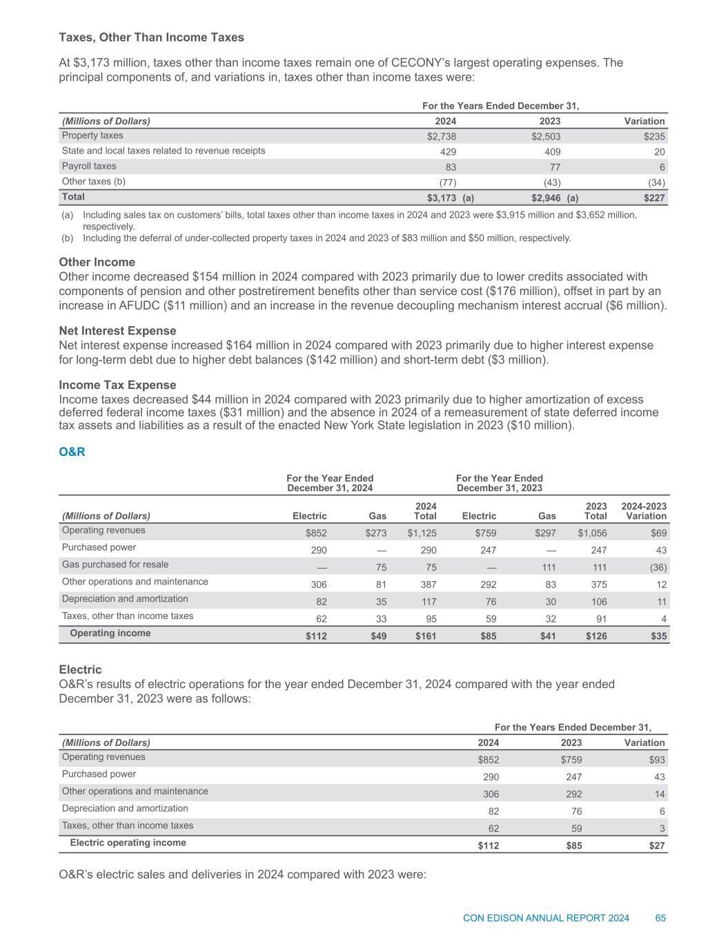 Taxes, Other Than Income Taxes At $3,173 million, taxes other than income taxes remain one of CECONY’s largest operating expenses. The principal components of, and variations in, taxes other than income taxes were: For the Years Ended December 31, (Millions of Dollars) 2024 2023 Variation Property taxes $2,738 $2,503 $235 State and local taxes related to revenue receipts 429 409 20 Payroll taxes 83 77 6 Other taxes (b) (77) (43) (34) Total $3,173 (a) $2,946 (a) $227 (a) Including sales tax on customers’ bills, total taxes other than income taxes in 2024 and 2023 were $3,915 million and $3,652 million, respectively. (b) Including the deferral of under-collected property taxes in 2024 and 2023 of $83 million and $50 million, respectively. Other Income Other income decreased $154 million in 2024 compared with 2023 primarily due to lower credits associated with components of pension and other postretirement benefits other than service cost ($176 million), offset in part by an increase in AFUDC ($11 million) and an increase in the revenue decoupling mechanism interest accrual ($6 million). Net Interest Expense Net interest expense increased $164 million in 2024 compared with 2023 primarily due to higher interest expense for long-term debt due to higher debt balances ($142 million) and short-term debt ($3 million). Income Tax Expense Income taxes decreased $44 million in 2024 compared with 2023 primarily due to higher amortization of excess deferred federal income taxes ($31 million) and the absence in 2024 of a remeasurement of state deferred income tax assets and liabilities as a result of the enacted New York State legislation in 2023 ($10 million). O&R For the Year Ended December 31, 2024 For the Year Ended December 31, 2023 (Millions of Dollars) Electric Gas 2024 Total Electric Gas 2023 Total 2024-2023 Variation Operating revenues $852 $273 $1,125 $759 $297 $1,056 $69 Purchased power 290 — 290 247 — 247 43 Gas purchased for resale — 75 75 — 111 111 (36) Other operations and maintenance 306 81 387 292 83 375 12 Depreciation and amortization 82 35 117 76 30 106 11 Taxes, other than income taxes 62 33 95 59 32 91 4 Operating income $112 $49 $161 $85 $41 $126 $35 Electric O&R’s results of electric operations for the year ended December 31, 2024 compared with the year ended December 31, 2023 were as follows: For the Years Ended December 31, (Millions of Dollars) 2024 2023 Variation Operating revenues $852 $759 $93 Purchased power 290 247 43 Other operations and maintenance 306 292 14 Depreciation and amortization 82 76 6 Taxes, other than income taxes 62 59 3 Electric operating income $112 $85 $27 O&R’s electric sales and deliveries in 2024 compared with 2023 were: CON EDISON ANNUAL REPORT 2024 65