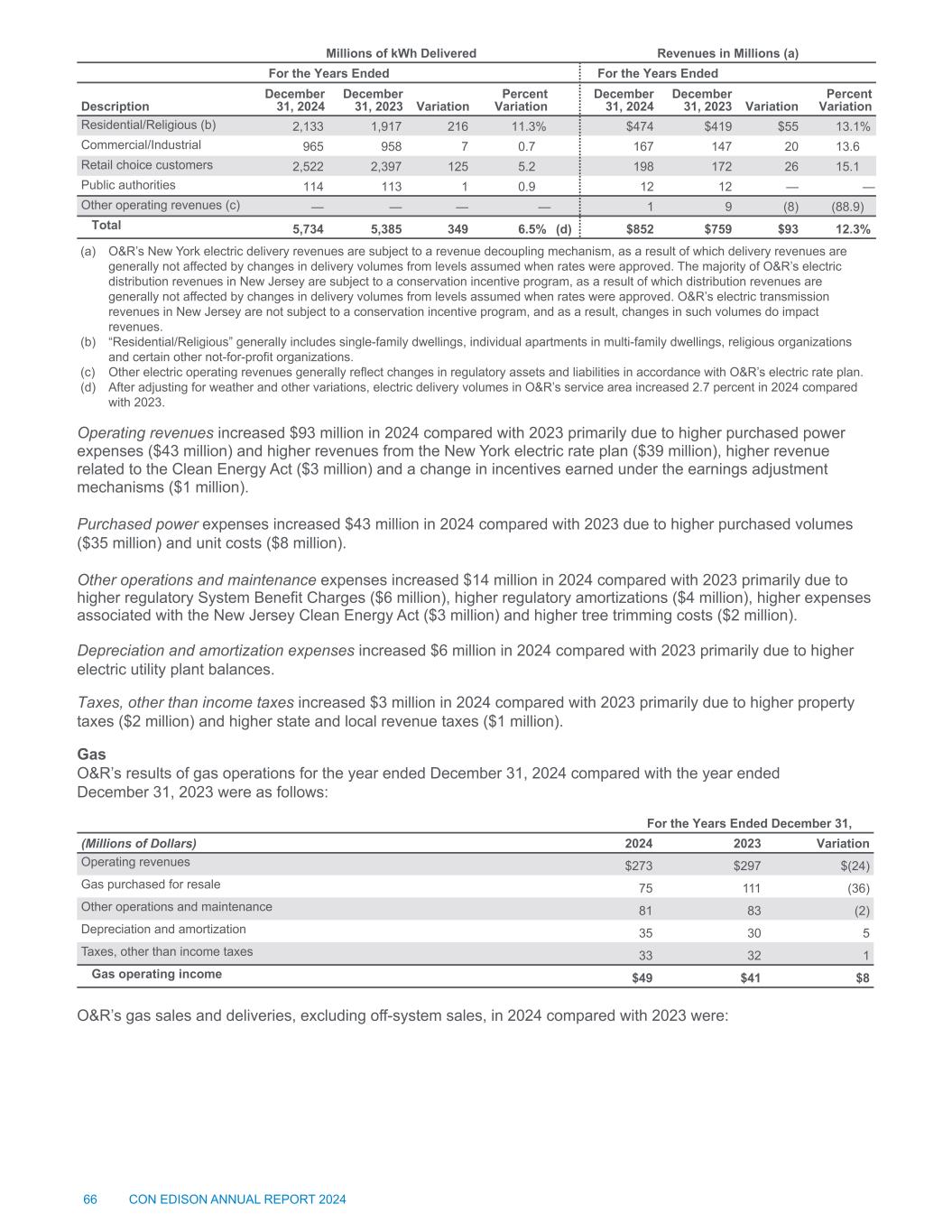 Millions of kWh Delivered Revenues in Millions (a) For the Years Ended For the Years Ended Description December 31, 2024 December 31, 2023 Variation Percent Variation December 31, 2024 December 31, 2023 Variation Percent Variation Residential/Religious (b) 2,133 1,917 216 11.3% $474 $419 $55 13.1% Commercial/Industrial 965 958 7 0.7 167 147 20 13.6 Retail choice customers 2,522 2,397 125 5.2 198 172 26 15.1 Public authorities 114 113 1 0.9 12 12 — — Other operating revenues (c) — — — — 1 9 (8) (88.9) Total 5,734 5,385 349 6.5% (d) $852 $759 $93 12.3% (a) O&R’s New York electric delivery revenues are subject to a revenue decoupling mechanism, as a result of which delivery revenues are generally not affected by changes in delivery volumes from levels assumed when rates were approved. The majority of O&R’s electric distribution revenues in New Jersey are subject to a conservation incentive program, as a result of which distribution revenues are generally not affected by changes in delivery volumes from levels assumed when rates were approved. O&R’s electric transmission revenues in New Jersey are not subject to a conservation incentive program, and as a result, changes in such volumes do impact revenues. (b) “Residential/Religious” generally includes single-family dwellings, individual apartments in multi-family dwellings, religious organizations and certain other not-for-profit organizations. (c) Other electric operating revenues generally reflect changes in regulatory assets and liabilities in accordance with O&R’s electric rate plan. (d) After adjusting for weather and other variations, electric delivery volumes in O&R’s service area increased 2.7 percent in 2024 compared with 2023. Operating revenues increased $93 million in 2024 compared with 2023 primarily due to higher purchased power expenses ($43 million) and higher revenues from the New York electric rate plan ($39 million), higher revenue related to the Clean Energy Act ($3 million) and a change in incentives earned under the earnings adjustment mechanisms ($1 million). Purchased power expenses increased $43 million in 2024 compared with 2023 due to higher purchased volumes ($35 million) and unit costs ($8 million). Other operations and maintenance expenses increased $14 million in 2024 compared with 2023 primarily due to higher regulatory System Benefit Charges ($6 million), higher regulatory amortizations ($4 million), higher expenses associated with the New Jersey Clean Energy Act ($3 million) and higher tree trimming costs ($2 million). Depreciation and amortization expenses increased $6 million in 2024 compared with 2023 primarily due to higher electric utility plant balances. Taxes, other than income taxes increased $3 million in 2024 compared with 2023 primarily due to higher property taxes ($2 million) and higher state and local revenue taxes ($1 million). Gas O&R’s results of gas operations for the year ended December 31, 2024 compared with the year ended December 31, 2023 were as follows: For the Years Ended December 31, (Millions of Dollars) 2024 2023 Variation Operating revenues $273 $297 $(24) Gas purchased for resale 75 111 (36) Other operations and maintenance 81 83 (2) Depreciation and amortization 35 30 5 Taxes, other than income taxes 33 32 1 Gas operating income $49 $41 $8 O&R’s gas sales and deliveries, excluding off-system sales, in 2024 compared with 2023 were: 66 CON EDISON ANNUAL REPORT 2024