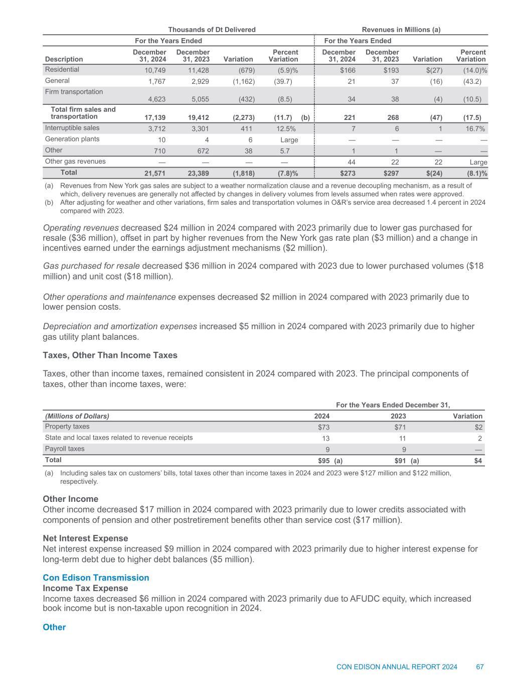 Thousands of Dt Delivered Revenues in Millions (a) For the Years Ended For the Years Ended Description December 31, 2024 December 31, 2023 Variation Percent Variation December 31, 2024 December 31, 2023 Variation Percent Variation Residential 10,749 11,428 (679) (5.9) % $166 $193 $(27) (14.0) % General 1,767 2,929 (1,162) (39.7) 21 37 (16) (43.2) Firm transportation 4,623 5,055 (432) (8.5) 34 38 (4) (10.5) Total firm sales and transportation 17,139 19,412 (2,273) (11.7) (b) 221 268 (47) (17.5) Interruptible sales 3,712 3,301 411 12.5% 7 6 1 16.7% Generation plants 10 4 6 Large — — — — Other 710 672 38 5.7 1 1 — — Other gas revenues — — — — 44 22 22 Large Total 21,571 23,389 (1,818) (7.8) % $273 $297 $(24) (8.1) % (a) Revenues from New York gas sales are subject to a weather normalization clause and a revenue decoupling mechanism, as a result of which, delivery revenues are generally not affected by changes in delivery volumes from levels assumed when rates were approved. (b) After adjusting for weather and other variations, firm sales and transportation volumes in O&R’s service area decreased 1.4 percent in 2024 compared with 2023. Operating revenues decreased $24 million in 2024 compared with 2023 primarily due to lower gas purchased for resale ($36 million), offset in part by higher revenues from the New York gas rate plan ($3 million) and a change in incentives earned under the earnings adjustment mechanisms ($2 million). Gas purchased for resale decreased $36 million in 2024 compared with 2023 due to lower purchased volumes ($18 million) and unit cost ($18 million). Other operations and maintenance expenses decreased $2 million in 2024 compared with 2023 primarily due to lower pension costs. Depreciation and amortization expenses increased $5 million in 2024 compared with 2023 primarily due to higher gas utility plant balances. Taxes, Other Than Income Taxes Taxes, other than income taxes, remained consistent in 2024 compared with 2023. The principal components of taxes, other than income taxes, were: For the Years Ended December 31, (Millions of Dollars) 2024 2023 Variation Property taxes $73 $71 $2 State and local taxes related to revenue receipts 13 11 2 Payroll taxes 9 9 — Total $95 (a) $91 (a) $4 (a) Including sales tax on customers’ bills, total taxes other than income taxes in 2024 and 2023 were $127 million and $122 million, respectively. Other Income Other income decreased $17 million in 2024 compared with 2023 primarily due to lower credits associated with components of pension and other postretirement benefits other than service cost ($17 million). Net Interest Expense Net interest expense increased $9 million in 2024 compared with 2023 primarily due to higher interest expense for long-term debt due to higher debt balances ($5 million). Con Edison Transmission Income Tax Expense Income taxes decreased $6 million in 2024 compared with 2023 primarily due to AFUDC equity, which increased book income but is non-taxable upon recognition in 2024. Other CON EDISON ANNUAL REPORT 2024 67