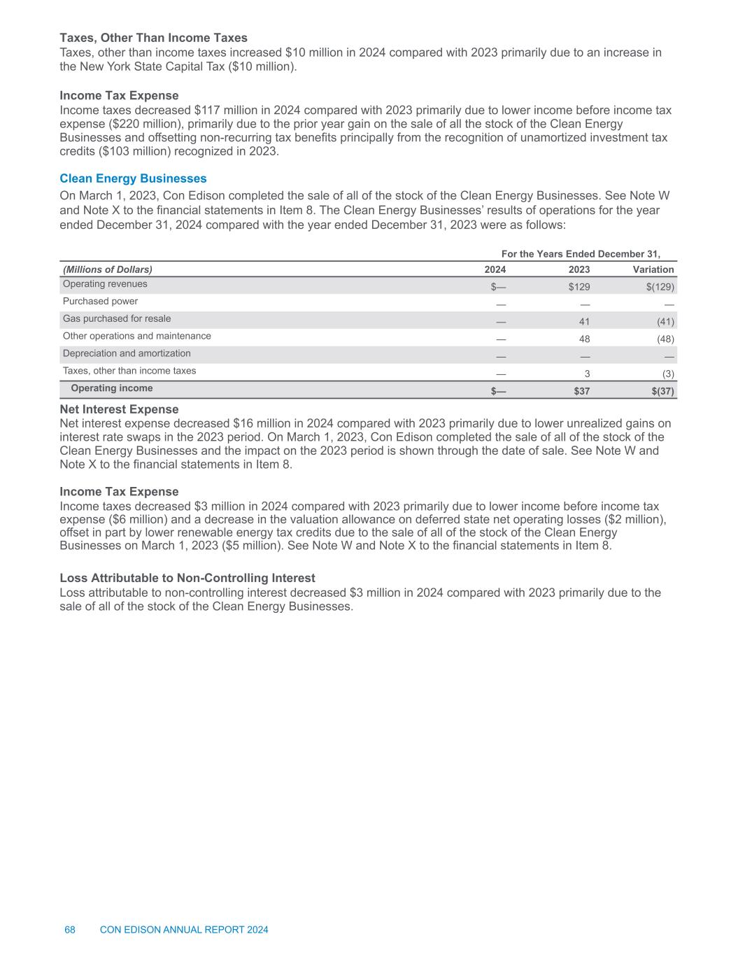 Taxes, Other Than Income Taxes Taxes, other than income taxes increased $10 million in 2024 compared with 2023 primarily due to an increase in the New York State Capital Tax ($10 million). Income Tax Expense Income taxes decreased $117 million in 2024 compared with 2023 primarily due to lower income before income tax expense ($220 million), primarily due to the prior year gain on the sale of all the stock of the Clean Energy Businesses and offsetting non-recurring tax benefits principally from the recognition of unamortized investment tax credits ($103 million) recognized in 2023. Clean Energy Businesses On March 1, 2023, Con Edison completed the sale of all of the stock of the Clean Energy Businesses. See Note W and Note X to the financial statements in Item 8. The Clean Energy Businesses’ results of operations for the year ended December 31, 2024 compared with the year ended December 31, 2023 were as follows: For the Years Ended December 31, (Millions of Dollars) 2024 2023 Variation Operating revenues $— $129 $(129) Purchased power — — — Gas purchased for resale — 41 (41) Other operations and maintenance — 48 (48) Depreciation and amortization — — — Taxes, other than income taxes — 3 (3) Operating income $— $37 $(37) Net Interest Expense Net interest expense decreased $16 million in 2024 compared with 2023 primarily due to lower unrealized gains on interest rate swaps in the 2023 period. On March 1, 2023, Con Edison completed the sale of all of the stock of the Clean Energy Businesses and the impact on the 2023 period is shown through the date of sale. See Note W and Note X to the financial statements in Item 8. Income Tax Expense Income taxes decreased $3 million in 2024 compared with 2023 primarily due to lower income before income tax expense ($6 million) and a decrease in the valuation allowance on deferred state net operating losses ($2 million), offset in part by lower renewable energy tax credits due to the sale of all of the stock of the Clean Energy Businesses on March 1, 2023 ($5 million). See Note W and Note X to the financial statements in Item 8. Loss Attributable to Non-Controlling Interest Loss attributable to non-controlling interest decreased $3 million in 2024 compared with 2023 primarily due to the sale of all of the stock of the Clean Energy Businesses. 68 CON EDISON ANNUAL REPORT 2024