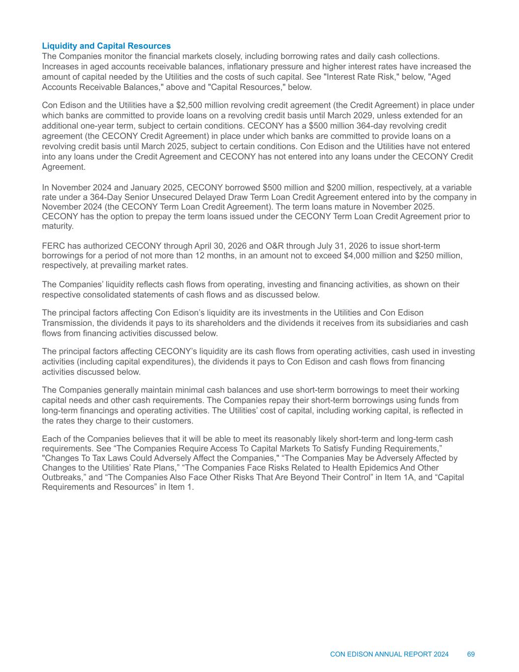Liquidity and Capital Resources The Companies monitor the financial markets closely, including borrowing rates and daily cash collections. Increases in aged accounts receivable balances, inflationary pressure and higher interest rates have increased the amount of capital needed by the Utilities and the costs of such capital. See "Interest Rate Risk," below, "Aged Accounts Receivable Balances," above and "Capital Resources," below. Con Edison and the Utilities have a $2,500 million revolving credit agreement (the Credit Agreement) in place under which banks are committed to provide loans on a revolving credit basis until March 2029, unless extended for an additional one-year term, subject to certain conditions. CECONY has a $500 million 364-day revolving credit agreement (the CECONY Credit Agreement) in place under which banks are committed to provide loans on a revolving credit basis until March 2025, subject to certain conditions. Con Edison and the Utilities have not entered into any loans under the Credit Agreement and CECONY has not entered into any loans under the CECONY Credit Agreement. In November 2024 and January 2025, CECONY borrowed $500 million and $200 million, respectively, at a variable rate under a 364-Day Senior Unsecured Delayed Draw Term Loan Credit Agreement entered into by the company in November 2024 (the CECONY Term Loan Credit Agreement). The term loans mature in November 2025. CECONY has the option to prepay the term loans issued under the CECONY Term Loan Credit Agreement prior to maturity. FERC has authorized CECONY through April 30, 2026 and O&R through July 31, 2026 to issue short-term borrowings for a period of not more than 12 months, in an amount not to exceed $4,000 million and $250 million, respectively, at prevailing market rates. The Companies’ liquidity reflects cash flows from operating, investing and financing activities, as shown on their respective consolidated statements of cash flows and as discussed below. The principal factors affecting Con Edison’s liquidity are its investments in the Utilities and Con Edison Transmission, the dividends it pays to its shareholders and the dividends it receives from its subsidiaries and cash flows from financing activities discussed below. The principal factors affecting CECONY’s liquidity are its cash flows from operating activities, cash used in investing activities (including capital expenditures), the dividends it pays to Con Edison and cash flows from financing activities discussed below. The Companies generally maintain minimal cash balances and use short-term borrowings to meet their working capital needs and other cash requirements. The Companies repay their short-term borrowings using funds from long-term financings and operating activities. The Utilities’ cost of capital, including working capital, is reflected in the rates they charge to their customers. Each of the Companies believes that it will be able to meet its reasonably likely short-term and long-term cash requirements. See “The Companies Require Access To Capital Markets To Satisfy Funding Requirements,” "Changes To Tax Laws Could Adversely Affect the Companies," “The Companies May be Adversely Affected by Changes to the Utilities’ Rate Plans,” “The Companies Face Risks Related to Health Epidemics And Other Outbreaks,” and “The Companies Also Face Other Risks That Are Beyond Their Control” in Item 1A, and “Capital Requirements and Resources” in Item 1. CON EDISON ANNUAL REPORT 2024 69