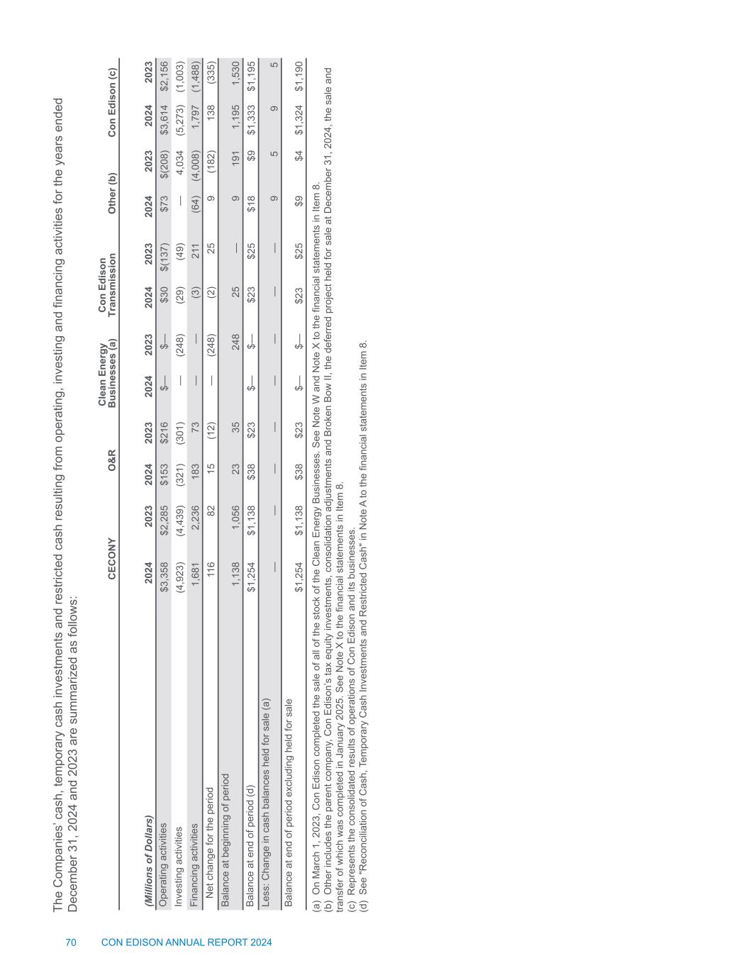 Th e C om pa ni es ’ c as h, te m po ra ry c as h in ve st m en ts a nd re st ric te d ca sh re su lti ng fr om o pe ra tin g, in ve st in g an d fin an ci ng a ct iv iti es fo r t he y ea rs e nd ed D ec em be r 3 1, 2 02 4 an d 20 23 a re s um m ar iz ed a s fo llo w s: C EC O N Y O & R C le an E ne rg y B us in es se s (a ) C on E di so n Tr an sm is si on O th er (b ) C on E di so n (c ) (M ill io ns o f D ol la rs ) 20 24 20 23 20 24 20 23 20 24 20 23 20 24 20 23 20 24 20 23 20 24 20 23 O pe ra tin g ac tiv iti es $3 ,3 58 $2 ,2 85 $1 53 $2 16 $— $— $3 0 $( 13 7) $7 3 $( 20 8) $3 ,6 14 $2 ,1 56 In ve st in g ac tiv iti es (4 ,9 23 ) (4 ,4 39 ) (3 21 ) (3 01 ) — (2 48 ) (2 9) (4 9) — 4, 03 4 (5 ,2 73 ) (1 ,0 03 ) Fi na nc in g ac tiv iti es 1, 68 1 2, 23 6 18 3 73 — — (3 ) 21 1 (6 4) (4 ,0 08 ) 1, 79 7 (1 ,4 88 ) N et c ha ng e fo r t he p er io d 11 6 82 15 (1 2) — (2 48 ) (2 ) 25 9 (1 82 ) 13 8 (3 35 ) B al an ce a t b eg in ni ng o f p er io d 1, 13 8 1, 05 6 23 35 24 8 25 — 9 19 1 1, 19 5 1, 53 0 B al an ce a t e nd o f p er io d (d ) $1 ,2 54 $1 ,1 38 $3 8 $2 3 $— $— $2 3 $2 5 $1 8 $9 $1 ,3 33 $1 ,1 95 Le ss : C ha ng e in c as h ba la nc es h el d fo r s al e (a ) — — — — — — — — 9 5 9 5 B al an ce a t e nd o f p er io d ex cl ud in g he ld fo r s al e $1 ,2 54 $1 ,1 38 $3 8 $2 3 $— $— $2 3 $2 5 $9 $4 $1 ,3 24 $1 ,1 90 (a ) O n M ar ch 1 , 2 02 3, C on E di so n co m pl et ed th e sa le o f a ll of th e st oc k of th e C le an E ne rg y B us in es se s. S ee N ot e W a nd N ot e X to th e fin an ci al s ta te m en ts in It em 8 . (b ) O th er in cl ud es th e pa re nt c om pa ny , C on E di so n’ s ta x eq ui ty in ve st m en ts , c on so lid at io n ad ju st m en ts a nd B ro ke n B ow II , t he d ef er re d pr oj ec t h el d fo r s al e at D ec em be r 3 1, 2 02 4, th e sa le a nd tra ns fe r o f w hi ch w as c om pl et ed in J an ua ry 2 02 5. S ee N ot e X to th e fin an ci al s ta te m en ts in It em 8 . (c ) R ep re se nt s th e co ns ol id at ed re su lts o f o pe ra tio ns o f C on E di so n an d its b us in es se s. (d ) S ee "R ec on ci lia tio n of C as h, T em po ra ry C as h In ve st m en ts a nd R es tri ct ed C as h" in N ot e A to th e fin an ci al s ta te m en ts in It em 8 . 70 CON EDISON ANNUAL REPORT 2024