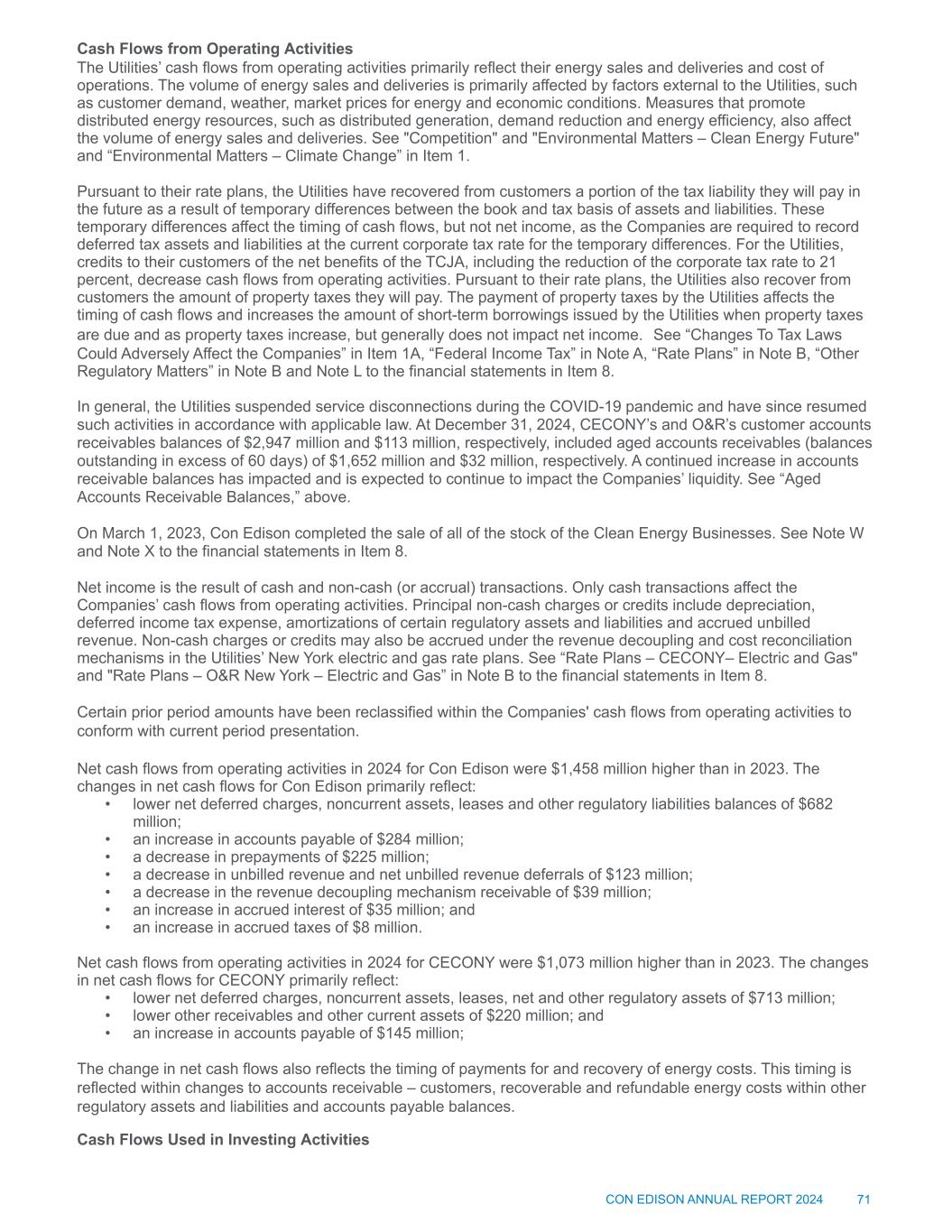 Cash Flows from Operating Activities The Utilities’ cash flows from operating activities primarily reflect their energy sales and deliveries and cost of operations. The volume of energy sales and deliveries is primarily affected by factors external to the Utilities, such as customer demand, weather, market prices for energy and economic conditions. Measures that promote distributed energy resources, such as distributed generation, demand reduction and energy efficiency, also affect the volume of energy sales and deliveries. See "Competition" and "Environmental Matters – Clean Energy Future" and “Environmental Matters – Climate Change” in Item 1. Pursuant to their rate plans, the Utilities have recovered from customers a portion of the tax liability they will pay in the future as a result of temporary differences between the book and tax basis of assets and liabilities. These temporary differences affect the timing of cash flows, but not net income, as the Companies are required to record deferred tax assets and liabilities at the current corporate tax rate for the temporary differences. For the Utilities, credits to their customers of the net benefits of the TCJA, including the reduction of the corporate tax rate to 21 percent, decrease cash flows from operating activities. Pursuant to their rate plans, the Utilities also recover from customers the amount of property taxes they will pay. The payment of property taxes by the Utilities affects the timing of cash flows and increases the amount of short-term borrowings issued by the Utilities when property taxes are due and as property taxes increase, but generally does not impact net income. See “Changes To Tax Laws Could Adversely Affect the Companies” in Item 1A, “Federal Income Tax” in Note A, “Rate Plans” in Note B, “Other Regulatory Matters” in Note B and Note L to the financial statements in Item 8. In general, the Utilities suspended service disconnections during the COVID-19 pandemic and have since resumed such activities in accordance with applicable law. At December 31, 2024, CECONY’s and O&R’s customer accounts receivables balances of $2,947 million and $113 million, respectively, included aged accounts receivables (balances outstanding in excess of 60 days) of $1,652 million and $32 million, respectively. A continued increase in accounts receivable balances has impacted and is expected to continue to impact the Companies’ liquidity. See “Aged Accounts Receivable Balances,” above. On March 1, 2023, Con Edison completed the sale of all of the stock of the Clean Energy Businesses. See Note W and Note X to the financial statements in Item 8. Net income is the result of cash and non-cash (or accrual) transactions. Only cash transactions affect the Companies’ cash flows from operating activities. Principal non-cash charges or credits include depreciation, deferred income tax expense, amortizations of certain regulatory assets and liabilities and accrued unbilled revenue. Non-cash charges or credits may also be accrued under the revenue decoupling and cost reconciliation mechanisms in the Utilities’ New York electric and gas rate plans. See “Rate Plans – CECONY– Electric and Gas" and "Rate Plans – O&R New York – Electric and Gas” in Note B to the financial statements in Item 8. Certain prior period amounts have been reclassified within the Companies' cash flows from operating activities to conform with current period presentation. Net cash flows from operating activities in 2024 for Con Edison were $1,458 million higher than in 2023. The changes in net cash flows for Con Edison primarily reflect: • lower net deferred charges, noncurrent assets, leases and other regulatory liabilities balances of $682 million; • an increase in accounts payable of $284 million; • a decrease in prepayments of $225 million; • a decrease in unbilled revenue and net unbilled revenue deferrals of $123 million; • a decrease in the revenue decoupling mechanism receivable of $39 million; • an increase in accrued interest of $35 million; and • an increase in accrued taxes of $8 million. Net cash flows from operating activities in 2024 for CECONY were $1,073 million higher than in 2023. The changes in net cash flows for CECONY primarily reflect: • lower net deferred charges, noncurrent assets, leases, net and other regulatory assets of $713 million; • lower other receivables and other current assets of $220 million; and • an increase in accounts payable of $145 million; The change in net cash flows also reflects the timing of payments for and recovery of energy costs. This timing is reflected within changes to accounts receivable – customers, recoverable and refundable energy costs within other regulatory assets and liabilities and accounts payable balances. Cash Flows Used in Investing Activities CON EDISON ANNUAL REPORT 2024 71