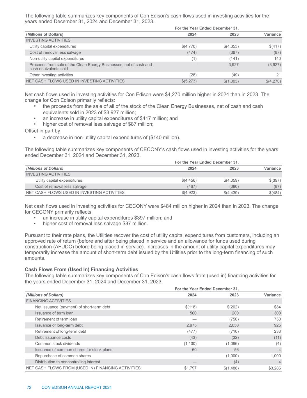 The following table summarizes key components of Con Edison's cash flows used in investing activities for the years ended December 31, 2024 and December 31, 2023. For the Year Ended December 31, (Millions of Dollars) 2024 2023 Variance INVESTING ACTIVITIES Utility capital expenditures $(4,770) $(4,353) $(417) Cost of removal less salvage (474) (387) (87) Non-utility capital expenditures (1) (141) 140 Proceeds from sale of the Clean Energy Businesses, net of cash and cash equivalents sold — 3,927 (3,927) Other investing activities (28) (49) 21 NET CASH FLOWS USED IN INVESTING ACTIVITIES $(5,273) $(1,003) $(4,270) Net cash flows used in investing activities for Con Edison were $4,270 million higher in 2024 than in 2023. The change for Con Edison primarily reflects: • the proceeds from the sale of all of the stock of the Clean Energy Businesses, net of cash and cash equivalents sold in 2023 of $3,927 million; • an increase in utility capital expenditures of $417 million; and • higher cost of removal less salvage of $87 million; Offset in part by • a decrease in non-utility capital expenditures of ($140 million). The following table summarizes key components of CECONY's cash flows used in investing activities for the years ended December 31, 2024 and December 31, 2023. For the Year Ended December 31, (Millions of Dollars) 2024 2023 Variance INVESTING ACTIVITIES Utility capital expenditures $(4,456) $(4,059) $(397) Cost of removal less salvage (467) (380) (87) NET CASH FLOWS USED IN INVESTING ACTIVITIES $(4,923) $(4,439) $(484) Net cash flows used in investing activities for CECONY were $484 million higher in 2024 than in 2023. The change for CECONY primarily reflects: • an increase in utility capital expenditures $397 million; and • higher cost of removal less salvage $87 million. Pursuant to their rate plans, the Utilities recover the cost of utility capital expenditures from customers, including an approved rate of return (before and after being placed in service and an allowance for funds used during construction (AFUDC) before being placed in service). Increases in the amount of utility capital expenditures may temporarily increase the amount of short-term debt issued by the Utilities prior to the long-term financing of such amounts. Cash Flows From (Used In) Financing Activities The following table summarizes key components of Con Edison's cash flows from (used in) financing activities for the years ended December 31, 2024 and December 31, 2023. For the Year Ended December 31, (Millions of Dollars) 2024 2023 Variance FINANCING ACTIVITIES Net issuance (payment) of short-term debt $(118) $(202) $84 Issuance of term loan 500 200 300 Retirement of term loan — (750) 750 Issuance of long-term debt 2,975 2,050 925 Retirement of long-term debt (477) (710) 233 Debt issuance costs (43) (32) (11) Common stock dividends (1,100) (1,096) (4) Issuance of common shares for stock plans 60 56 4 Repurchase of common shares — (1,000) 1,000 Distribution to noncontrolling interest — (4) 4 NET CASH FLOWS FROM (USED IN) FINANCING ACTIVITIES $1,797 $(1,488) $3,285 72 CON EDISON ANNUAL REPORT 2024