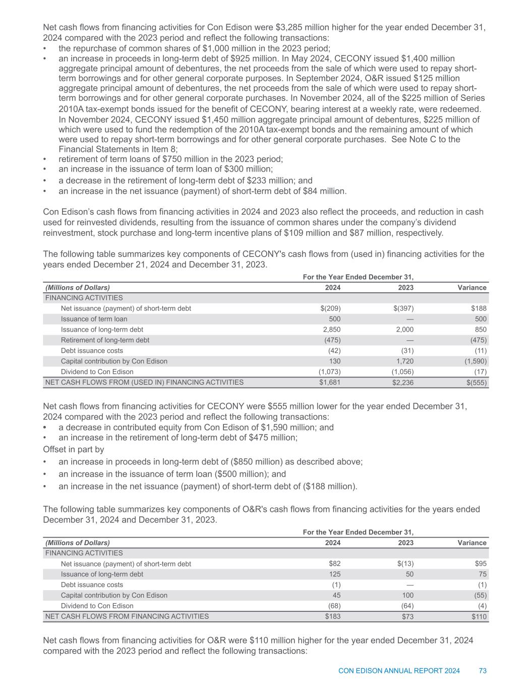 Net cash flows from financing activities for Con Edison were $3,285 million higher for the year ended December 31, 2024 compared with the 2023 period and reflect the following transactions: • the repurchase of common shares of $1,000 million in the 2023 period; • an increase in proceeds in long-term debt of $925 million. In May 2024, CECONY issued $1,400 million aggregate principal amount of debentures, the net proceeds from the sale of which were used to repay short- term borrowings and for other general corporate purposes. In September 2024, O&R issued $125 million aggregate principal amount of debentures, the net proceeds from the sale of which were used to repay short- term borrowings and for other general corporate purchases. In November 2024, all of the $225 million of Series 2010A tax-exempt bonds issued for the benefit of CECONY, bearing interest at a weekly rate, were redeemed. In November 2024, CECONY issued $1,450 million aggregate principal amount of debentures, $225 million of which were used to fund the redemption of the 2010A tax-exempt bonds and the remaining amount of which were used to repay short-term borrowings and for other general corporate purchases. See Note C to the Financial Statements in Item 8; • retirement of term loans of $750 million in the 2023 period; • an increase in the issuance of term loan of $300 million; • a decrease in the retirement of long-term debt of $233 million; and • an increase in the net issuance (payment) of short-term debt of $84 million. Con Edison’s cash flows from financing activities in 2024 and 2023 also reflect the proceeds, and reduction in cash used for reinvested dividends, resulting from the issuance of common shares under the company’s dividend reinvestment, stock purchase and long-term incentive plans of $109 million and $87 million, respectively. The following table summarizes key components of CECONY's cash flows from (used in) financing activities for the years ended December 21, 2024 and December 31, 2023. For the Year Ended December 31, (Millions of Dollars) 2024 2023 Variance FINANCING ACTIVITIES Net issuance (payment) of short-term debt $(209) $(397) $188 Issuance of term loan 500 — 500 Issuance of long-term debt 2,850 2,000 850 Retirement of long-term debt (475) — (475) Debt issuance costs (42) (31) (11) Capital contribution by Con Edison 130 1,720 (1,590) Dividend to Con Edison (1,073) (1,056) (17) NET CASH FLOWS FROM (USED IN) FINANCING ACTIVITIES $1,681 $2,236 $(555) Net cash flows from financing activities for CECONY were $555 million lower for the year ended December 31, 2024 compared with the 2023 period and reflect the following transactions: • a decrease in contributed equity from Con Edison of $1,590 million; and • an increase in the retirement of long-term debt of $475 million; Offset in part by • an increase in proceeds in long-term debt of ($850 million) as described above; • an increase in the issuance of term loan ($500 million); and • an increase in the net issuance (payment) of short-term debt of ($188 million). The following table summarizes key components of O&R's cash flows from financing activities for the years ended December 31, 2024 and December 31, 2023. For the Year Ended December 31, (Millions of Dollars) 2024 2023 Variance FINANCING ACTIVITIES Net issuance (payment) of short-term debt $82 $(13) $95 Issuance of long-term debt 125 50 75 Debt issuance costs (1) — (1) Capital contribution by Con Edison 45 100 (55) Dividend to Con Edison (68) (64) (4) NET CASH FLOWS FROM FINANCING ACTIVITIES $183 $73 $110 Net cash flows from financing activities for O&R were $110 million higher for the year ended December 31, 2024 compared with the 2023 period and reflect the following transactions: CON EDISON ANNUAL REPORT 2024 73