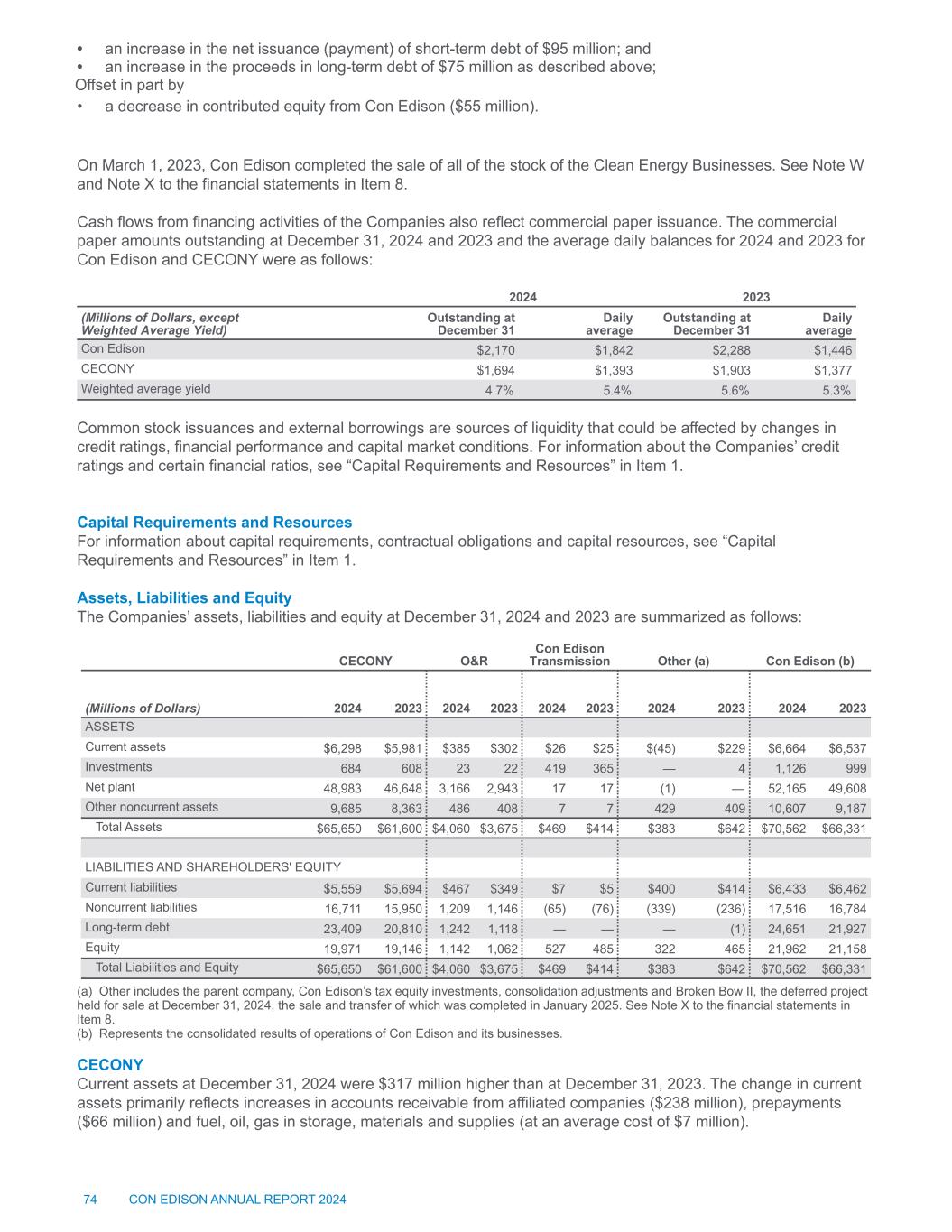 • an increase in the net issuance (payment) of short-term debt of $95 million; and • an increase in the proceeds in long-term debt of $75 million as described above; Offset in part by • a decrease in contributed equity from Con Edison ($55 million). On March 1, 2023, Con Edison completed the sale of all of the stock of the Clean Energy Businesses. See Note W and Note X to the financial statements in Item 8. Cash flows from financing activities of the Companies also reflect commercial paper issuance. The commercial paper amounts outstanding at December 31, 2024 and 2023 and the average daily balances for 2024 and 2023 for Con Edison and CECONY were as follows: 2024 2023 (Millions of Dollars, except Weighted Average Yield) Outstanding at December 31 Daily average Outstanding at December 31 Daily average Con Edison $2,170 $1,842 $2,288 $1,446 CECONY $1,694 $1,393 $1,903 $1,377 Weighted average yield 4.7% 5.4% 5.6% 5.3% Common stock issuances and external borrowings are sources of liquidity that could be affected by changes in credit ratings, financial performance and capital market conditions. For information about the Companies’ credit ratings and certain financial ratios, see “Capital Requirements and Resources” in Item 1. Capital Requirements and Resources For information about capital requirements, contractual obligations and capital resources, see “Capital Requirements and Resources” in Item 1. Assets, Liabilities and Equity The Companies’ assets, liabilities and equity at December 31, 2024 and 2023 are summarized as follows: CECONY O&R Con Edison Transmission Other (a) Con Edison (b) (Millions of Dollars) 2024 2023 2024 2023 2024 2023 2024 2023 2024 2023 ASSETS Current assets $6,298 $5,981 $385 $302 $26 $25 $(45) $229 $6,664 $6,537 Investments 684 608 23 22 419 365 — 4 1,126 999 Net plant 48,983 46,648 3,166 2,943 17 17 (1) — 52,165 49,608 Other noncurrent assets 9,685 8,363 486 408 7 7 429 409 10,607 9,187 Total Assets $65,650 $61,600 $4,060 $3,675 $469 $414 $383 $642 $70,562 $66,331 LIABILITIES AND SHAREHOLDERS' EQUITY Current liabilities $5,559 $5,694 $467 $349 $7 $5 $400 $414 $6,433 $6,462 Noncurrent liabilities 16,711 15,950 1,209 1,146 (65) (76) (339) (236) 17,516 16,784 Long-term debt 23,409 20,810 1,242 1,118 — — — (1) 24,651 21,927 Equity 19,971 19,146 1,142 1,062 527 485 322 465 21,962 21,158 Total Liabilities and Equity $65,650 $61,600 $4,060 $3,675 $469 $414 $383 $642 $70,562 $66,331 (a) Other includes the parent company, Con Edison’s tax equity investments, consolidation adjustments and Broken Bow II, the deferred project held for sale at December 31, 2024, the sale and transfer of which was completed in January 2025. See Note X to the financial statements in Item 8. (b) Represents the consolidated results of operations of Con Edison and its businesses. CECONY Current assets at December 31, 2024 were $317 million higher than at December 31, 2023. The change in current assets primarily reflects increases in accounts receivable from affiliated companies ($238 million), prepayments ($66 million) and fuel, oil, gas in storage, materials and supplies (at an average cost of $7 million). 74 CON EDISON ANNUAL REPORT 2024