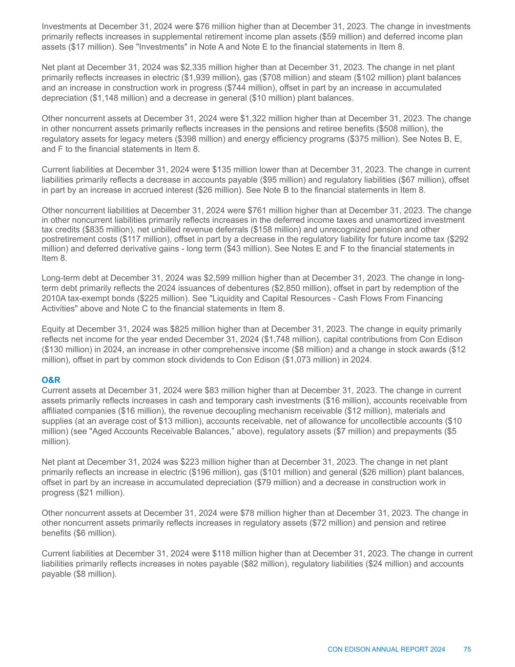 Investments at December 31, 2024 were $76 million higher than at December 31, 2023. The change in investments primarily reflects increases in supplemental retirement income plan assets ($59 million) and deferred income plan assets ($17 million). See "Investments" in Note A and Note E to the financial statements in Item 8. Net plant at December 31, 2024 was $2,335 million higher than at December 31, 2023. The change in net plant primarily reflects increases in electric ($1,939 million), gas ($708 million) and steam ($102 million) plant balances and an increase in construction work in progress ($744 million), offset in part by an increase in accumulated depreciation ($1,148 million) and a decrease in general ($10 million) plant balances. Other noncurrent assets at December 31, 2024 were $1,322 million higher than at December 31, 2023. The change in other noncurrent assets primarily reflects increases in the pensions and retiree benefits ($508 million), the regulatory assets for legacy meters ($398 million) and energy efficiency programs ($375 million). See Notes B, E, and F to the financial statements in Item 8. Current liabilities at December 31, 2024 were $135 million lower than at December 31, 2023. The change in current liabilities primarily reflects a decrease in accounts payable ($95 million) and regulatory liabilities ($67 million), offset in part by an increase in accrued interest ($26 million). See Note B to the financial statements in Item 8. Other noncurrent liabilities at December 31, 2024 were $761 million higher than at December 31, 2023. The change in other noncurrent liabilities primarily reflects increases in the deferred income taxes and unamortized investment tax credits ($835 million), net unbilled revenue deferrals ($158 million) and unrecognized pension and other postretirement costs ($117 million), offset in part by a decrease in the regulatory liability for future income tax ($292 million) and deferred derivative gains - long term ($43 million). See Notes E and F to the financial statements in Item 8. Long-term debt at December 31, 2024 was $2,599 million higher than at December 31, 2023. The change in long- term debt primarily reflects the 2024 issuances of debentures ($2,850 million), offset in part by redemption of the 2010A tax-exempt bonds ($225 million). See "Liquidity and Capital Resources - Cash Flows From Financing Activities" above and Note C to the financial statements in Item 8. Equity at December 31, 2024 was $825 million higher than at December 31, 2023. The change in equity primarily reflects net income for the year ended December 31, 2024 ($1,748 million), capital contributions from Con Edison ($130 million) in 2024, an increase in other comprehensive income ($8 million) and a change in stock awards ($12 million), offset in part by common stock dividends to Con Edison ($1,073 million) in 2024. O&R Current assets at December 31, 2024 were $83 million higher than at December 31, 2023. The change in current assets primarily reflects increases in cash and temporary cash investments ($16 million), accounts receivable from affiliated companies ($16 million), the revenue decoupling mechanism receivable ($12 million), materials and supplies (at an average cost of $13 million), accounts receivable, net of allowance for uncollectible accounts ($10 million) (see "Aged Accounts Receivable Balances,” above), regulatory assets ($7 million) and prepayments ($5 million). Net plant at December 31, 2024 was $223 million higher than at December 31, 2023. The change in net plant primarily reflects an increase in electric ($196 million), gas ($101 million) and general ($26 million) plant balances, offset in part by an increase in accumulated depreciation ($79 million) and a decrease in construction work in progress ($21 million). Other noncurrent assets at December 31, 2024 were $78 million higher than at December 31, 2023. The change in other noncurrent assets primarily reflects increases in regulatory assets ($72 million) and pension and retiree benefits ($6 million). Current liabilities at December 31, 2024 were $118 million higher than at December 31, 2023. The change in current liabilities primarily reflects increases in notes payable ($82 million), regulatory liabilities ($24 million) and accounts payable ($8 million). CON EDISON ANNUAL REPORT 2024 75
