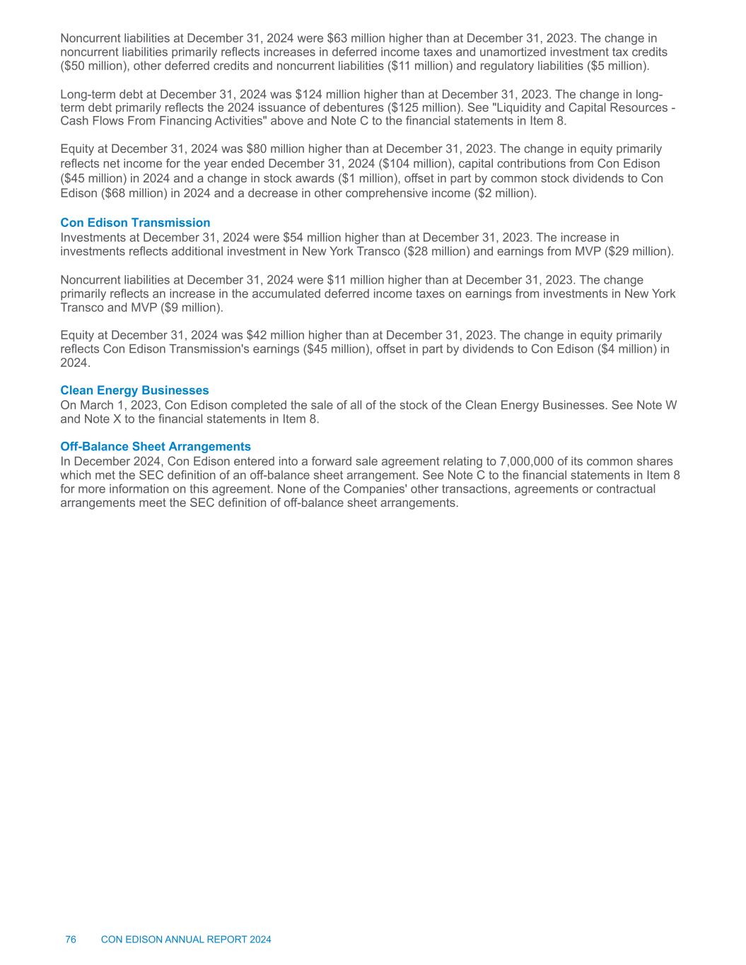 Noncurrent liabilities at December 31, 2024 were $63 million higher than at December 31, 2023. The change in noncurrent liabilities primarily reflects increases in deferred income taxes and unamortized investment tax credits ($50 million), other deferred credits and noncurrent liabilities ($11 million) and regulatory liabilities ($5 million). Long-term debt at December 31, 2024 was $124 million higher than at December 31, 2023. The change in long- term debt primarily reflects the 2024 issuance of debentures ($125 million). See "Liquidity and Capital Resources - Cash Flows From Financing Activities" above and Note C to the financial statements in Item 8. Equity at December 31, 2024 was $80 million higher than at December 31, 2023. The change in equity primarily reflects net income for the year ended December 31, 2024 ($104 million), capital contributions from Con Edison ($45 million) in 2024 and a change in stock awards ($1 million), offset in part by common stock dividends to Con Edison ($68 million) in 2024 and a decrease in other comprehensive income ($2 million). Con Edison Transmission Investments at December 31, 2024 were $54 million higher than at December 31, 2023. The increase in investments reflects additional investment in New York Transco ($28 million) and earnings from MVP ($29 million). Noncurrent liabilities at December 31, 2024 were $11 million higher than at December 31, 2023. The change primarily reflects an increase in the accumulated deferred income taxes on earnings from investments in New York Transco and MVP ($9 million). Equity at December 31, 2024 was $42 million higher than at December 31, 2023. The change in equity primarily reflects Con Edison Transmission's earnings ($45 million), offset in part by dividends to Con Edison ($4 million) in 2024. Clean Energy Businesses On March 1, 2023, Con Edison completed the sale of all of the stock of the Clean Energy Businesses. See Note W and Note X to the financial statements in Item 8. Off-Balance Sheet Arrangements In December 2024, Con Edison entered into a forward sale agreement relating to 7,000,000 of its common shares which met the SEC definition of an off-balance sheet arrangement. See Note C to the financial statements in Item 8 for more information on this agreement. None of the Companies' other transactions, agreements or contractual arrangements meet the SEC definition of off-balance sheet arrangements. 76 CON EDISON ANNUAL REPORT 2024