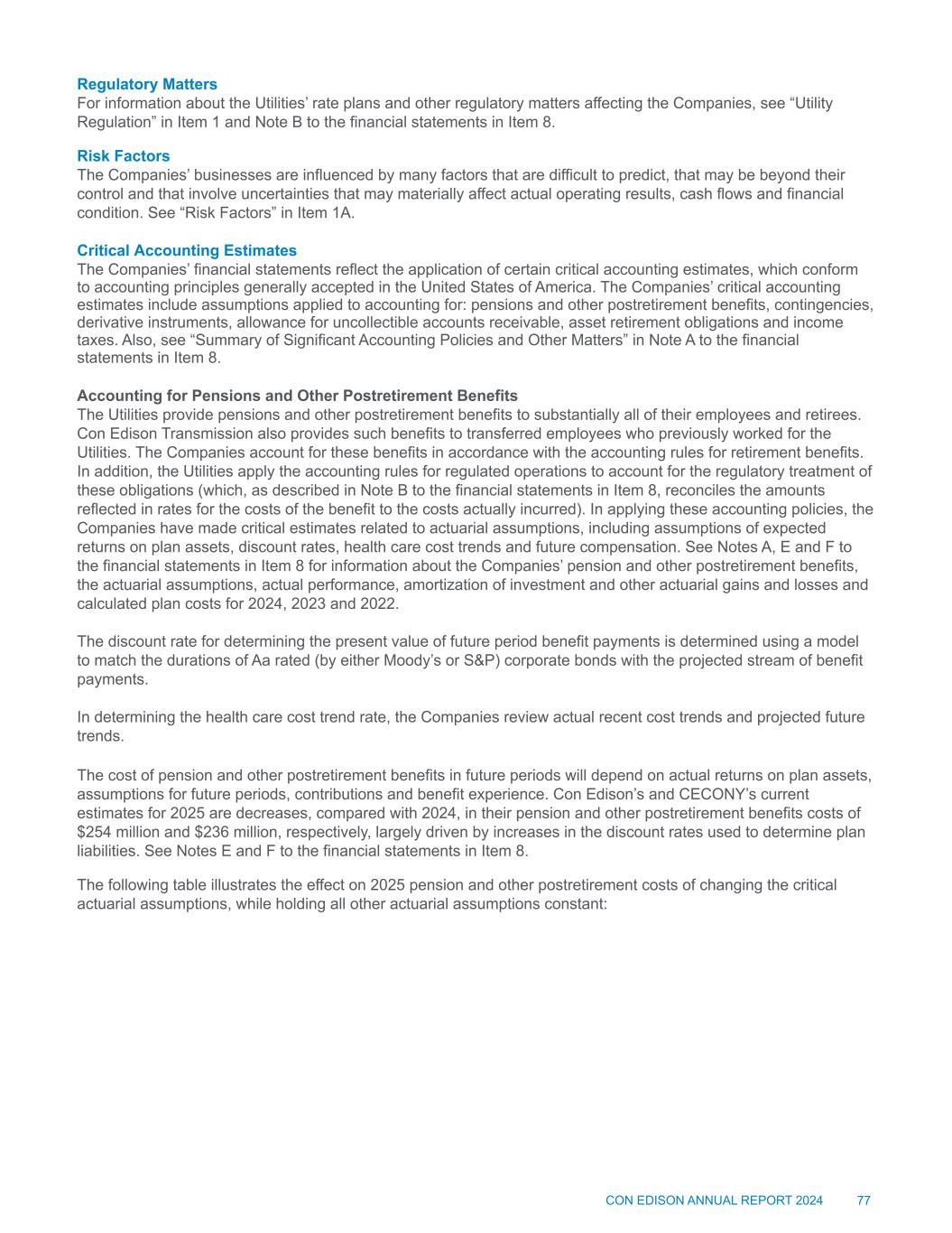 Regulatory Matters For information about the Utilities’ rate plans and other regulatory matters affecting the Companies, see “Utility Regulation” in Item 1 and Note B to the financial statements in Item 8. Risk Factors The Companies’ businesses are influenced by many factors that are difficult to predict, that may be beyond their control and that involve uncertainties that may materially affect actual operating results, cash flows and financial condition. See “Risk Factors” in Item 1A. Critical Accounting Estimates The Companies’ financial statements reflect the application of certain critical accounting estimates, which conform to accounting principles generally accepted in the United States of America. The Companies’ critical accounting estimates include assumptions applied to accounting for: pensions and other postretirement benefits, contingencies, derivative instruments, allowance for uncollectible accounts receivable, asset retirement obligations and income taxes. Also, see “Summary of Significant Accounting Policies and Other Matters” in Note A to the financial statements in Item 8. Accounting for Pensions and Other Postretirement Benefits The Utilities provide pensions and other postretirement benefits to substantially all of their employees and retirees. Con Edison Transmission also provides such benefits to transferred employees who previously worked for the Utilities. The Companies account for these benefits in accordance with the accounting rules for retirement benefits. In addition, the Utilities apply the accounting rules for regulated operations to account for the regulatory treatment of these obligations (which, as described in Note B to the financial statements in Item 8, reconciles the amounts reflected in rates for the costs of the benefit to the costs actually incurred). In applying these accounting policies, the Companies have made critical estimates related to actuarial assumptions, including assumptions of expected returns on plan assets, discount rates, health care cost trends and future compensation. See Notes A, E and F to the financial statements in Item 8 for information about the Companies’ pension and other postretirement benefits, the actuarial assumptions, actual performance, amortization of investment and other actuarial gains and losses and calculated plan costs for 2024, 2023 and 2022. The discount rate for determining the present value of future period benefit payments is determined using a model to match the durations of Aa rated (by either Moody’s or S&P) corporate bonds with the projected stream of benefit payments. In determining the health care cost trend rate, the Companies review actual recent cost trends and projected future trends. The cost of pension and other postretirement benefits in future periods will depend on actual returns on plan assets, assumptions for future periods, contributions and benefit experience. Con Edison’s and CECONY’s current estimates for 2025 are decreases, compared with 2024, in their pension and other postretirement benefits costs of $254 million and $236 million, respectively, largely driven by increases in the discount rates used to determine plan liabilities. See Notes E and F to the financial statements in Item 8. The following table illustrates the effect on 2025 pension and other postretirement costs of changing the critical actuarial assumptions, while holding all other actuarial assumptions constant: CON EDISON ANNUAL REPORT 2024 77