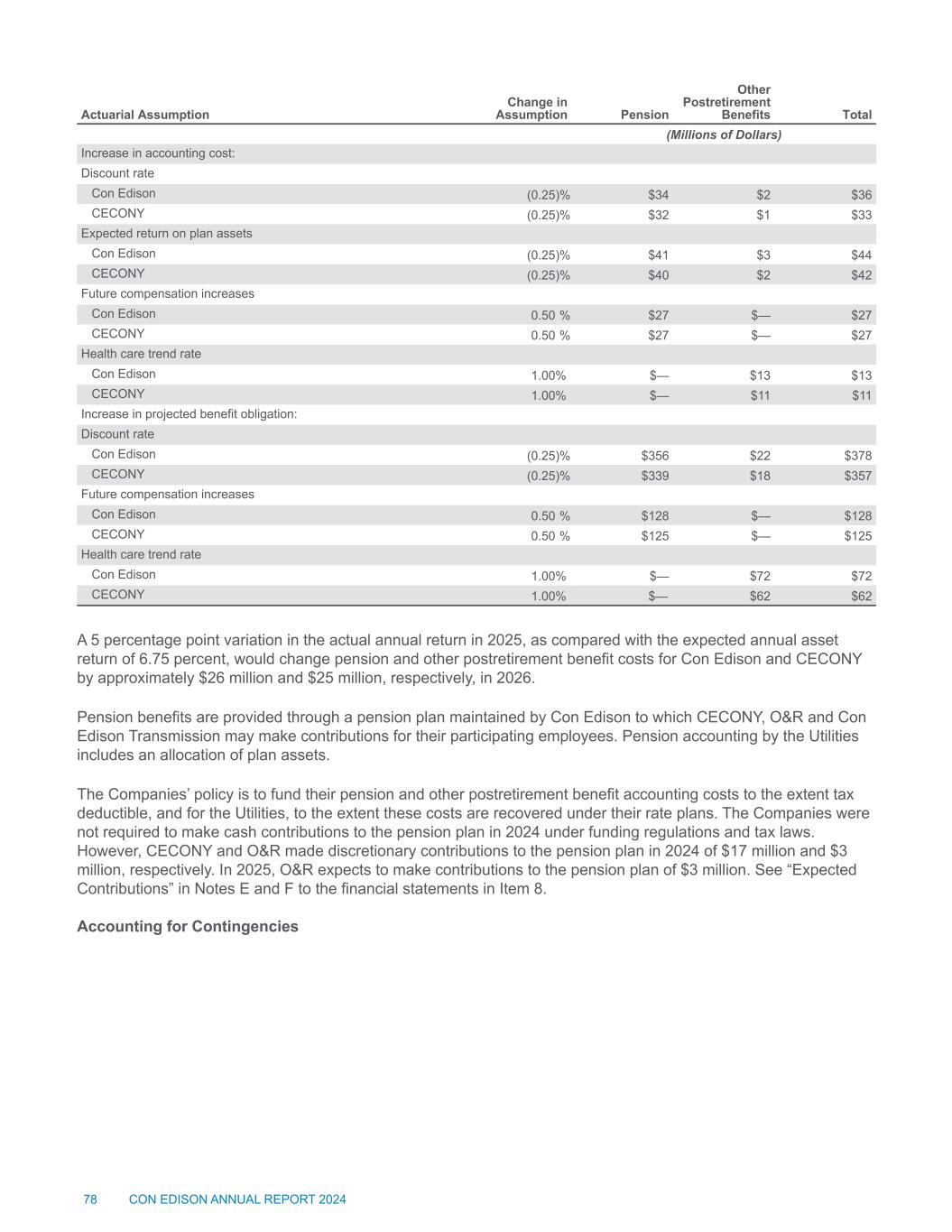 Actuarial Assumption Change in Assumption Pension Other Postretirement Benefits Total (Millions of Dollars) Increase in accounting cost: Discount rate Con Edison (0.25) % $34 $2 $36 CECONY (0.25) % $32 $1 $33 Expected return on plan assets Con Edison (0.25) % $41 $3 $44 CECONY (0.25) % $40 $2 $42 Future compensation increases Con Edison 0.50 % $27 $— $27 CECONY 0.50 % $27 $— $27 Health care trend rate Con Edison 1.00% $— $13 $13 CECONY 1.00% $— $11 $11 Increase in projected benefit obligation: Discount rate Con Edison (0.25) % $356 $22 $378 CECONY (0.25) % $339 $18 $357 Future compensation increases Con Edison 0.50 % $128 $— $128 CECONY 0.50 % $125 $— $125 Health care trend rate Con Edison 1.00% $— $72 $72 CECONY 1.00% $— $62 $62 A 5 percentage point variation in the actual annual return in 2025, as compared with the expected annual asset return of 6.75 percent, would change pension and other postretirement benefit costs for Con Edison and CECONY by approximately $26 million and $25 million, respectively, in 2026. Pension benefits are provided through a pension plan maintained by Con Edison to which CECONY, O&R and Con Edison Transmission may make contributions for their participating employees. Pension accounting by the Utilities includes an allocation of plan assets. The Companies’ policy is to fund their pension and other postretirement benefit accounting costs to the extent tax deductible, and for the Utilities, to the extent these costs are recovered under their rate plans. The Companies were not required to make cash contributions to the pension plan in 2024 under funding regulations and tax laws. However, CECONY and O&R made discretionary contributions to the pension plan in 2024 of $17 million and $3 million, respectively. In 2025, O&R expects to make contributions to the pension plan of $3 million. See “Expected Contributions” in Notes E and F to the financial statements in Item 8. Accounting for Contingencies 78 CON EDISON ANNUAL REPORT 2024
