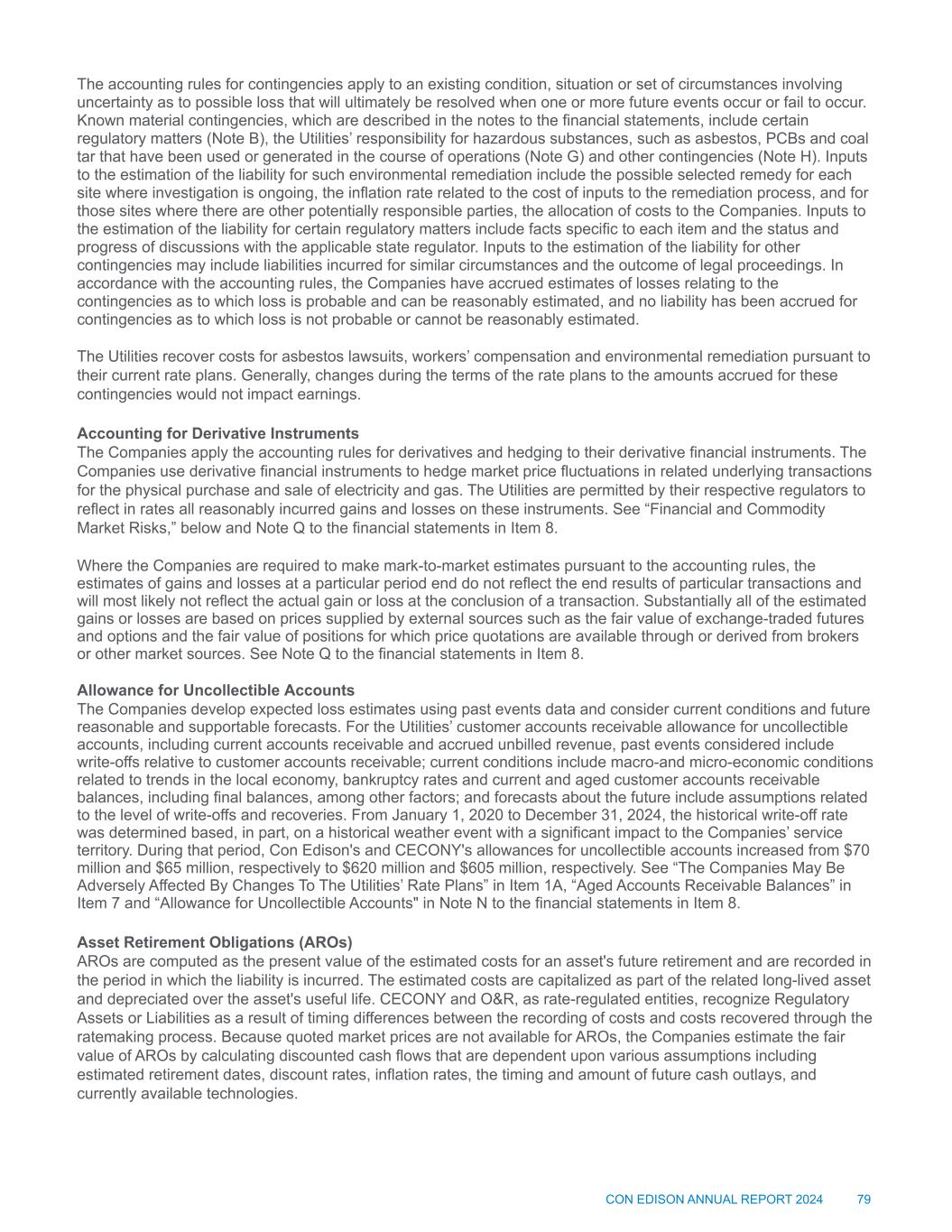 The accounting rules for contingencies apply to an existing condition, situation or set of circumstances involving uncertainty as to possible loss that will ultimately be resolved when one or more future events occur or fail to occur. Known material contingencies, which are described in the notes to the financial statements, include certain regulatory matters (Note B), the Utilities’ responsibility for hazardous substances, such as asbestos, PCBs and coal tar that have been used or generated in the course of operations (Note G) and other contingencies (Note H). Inputs to the estimation of the liability for such environmental remediation include the possible selected remedy for each site where investigation is ongoing, the inflation rate related to the cost of inputs to the remediation process, and for those sites where there are other potentially responsible parties, the allocation of costs to the Companies. Inputs to the estimation of the liability for certain regulatory matters include facts specific to each item and the status and progress of discussions with the applicable state regulator. Inputs to the estimation of the liability for other contingencies may include liabilities incurred for similar circumstances and the outcome of legal proceedings. In accordance with the accounting rules, the Companies have accrued estimates of losses relating to the contingencies as to which loss is probable and can be reasonably estimated, and no liability has been accrued for contingencies as to which loss is not probable or cannot be reasonably estimated. The Utilities recover costs for asbestos lawsuits, workers’ compensation and environmental remediation pursuant to their current rate plans. Generally, changes during the terms of the rate plans to the amounts accrued for these contingencies would not impact earnings. Accounting for Derivative Instruments The Companies apply the accounting rules for derivatives and hedging to their derivative financial instruments. The Companies use derivative financial instruments to hedge market price fluctuations in related underlying transactions for the physical purchase and sale of electricity and gas. The Utilities are permitted by their respective regulators to reflect in rates all reasonably incurred gains and losses on these instruments. See “Financial and Commodity Market Risks,” below and Note Q to the financial statements in Item 8. Where the Companies are required to make mark-to-market estimates pursuant to the accounting rules, the estimates of gains and losses at a particular period end do not reflect the end results of particular transactions and will most likely not reflect the actual gain or loss at the conclusion of a transaction. Substantially all of the estimated gains or losses are based on prices supplied by external sources such as the fair value of exchange-traded futures and options and the fair value of positions for which price quotations are available through or derived from brokers or other market sources. See Note Q to the financial statements in Item 8. Allowance for Uncollectible Accounts The Companies develop expected loss estimates using past events data and consider current conditions and future reasonable and supportable forecasts. For the Utilities’ customer accounts receivable allowance for uncollectible accounts, including current accounts receivable and accrued unbilled revenue, past events considered include write-offs relative to customer accounts receivable; current conditions include macro-and micro-economic conditions related to trends in the local economy, bankruptcy rates and current and aged customer accounts receivable balances, including final balances, among other factors; and forecasts about the future include assumptions related to the level of write-offs and recoveries. From January 1, 2020 to December 31, 2024, the historical write-off rate was determined based, in part, on a historical weather event with a significant impact to the Companies’ service territory. During that period, Con Edison's and CECONY's allowances for uncollectible accounts increased from $70 million and $65 million, respectively to $620 million and $605 million, respectively. See “The Companies May Be Adversely Affected By Changes To The Utilities’ Rate Plans” in Item 1A, “Aged Accounts Receivable Balances” in Item 7 and “Allowance for Uncollectible Accounts" in Note N to the financial statements in Item 8. Asset Retirement Obligations (AROs) AROs are computed as the present value of the estimated costs for an asset's future retirement and are recorded in the period in which the liability is incurred. The estimated costs are capitalized as part of the related long-lived asset and depreciated over the asset's useful life. CECONY and O&R, as rate-regulated entities, recognize Regulatory Assets or Liabilities as a result of timing differences between the recording of costs and costs recovered through the ratemaking process. Because quoted market prices are not available for AROs, the Companies estimate the fair value of AROs by calculating discounted cash flows that are dependent upon various assumptions including estimated retirement dates, discount rates, inflation rates, the timing and amount of future cash outlays, and currently available technologies. CON EDISON ANNUAL REPORT 2024 79