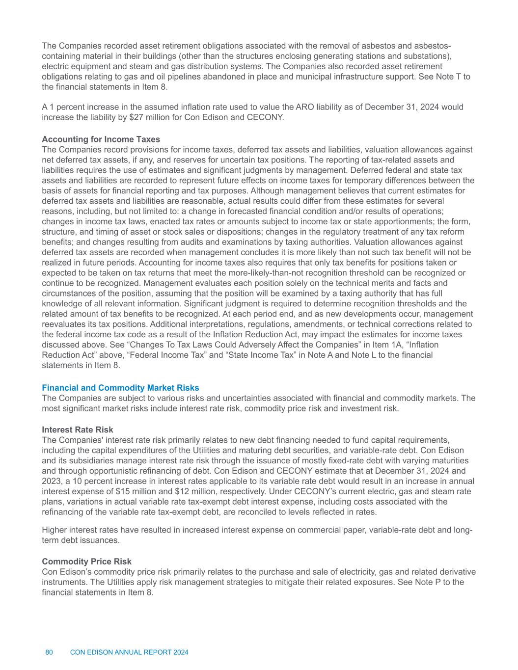 The Companies recorded asset retirement obligations associated with the removal of asbestos and asbestos- containing material in their buildings (other than the structures enclosing generating stations and substations), electric equipment and steam and gas distribution systems. The Companies also recorded asset retirement obligations relating to gas and oil pipelines abandoned in place and municipal infrastructure support. See Note T to the financial statements in Item 8. A 1 percent increase in the assumed inflation rate used to value the ARO liability as of December 31, 2024 would increase the liability by $27 million for Con Edison and CECONY. Accounting for Income Taxes The Companies record provisions for income taxes, deferred tax assets and liabilities, valuation allowances against net deferred tax assets, if any, and reserves for uncertain tax positions. The reporting of tax-related assets and liabilities requires the use of estimates and significant judgments by management. Deferred federal and state tax assets and liabilities are recorded to represent future effects on income taxes for temporary differences between the basis of assets for financial reporting and tax purposes. Although management believes that current estimates for deferred tax assets and liabilities are reasonable, actual results could differ from these estimates for several reasons, including, but not limited to: a change in forecasted financial condition and/or results of operations; changes in income tax laws, enacted tax rates or amounts subject to income tax or state apportionments; the form, structure, and timing of asset or stock sales or dispositions; changes in the regulatory treatment of any tax reform benefits; and changes resulting from audits and examinations by taxing authorities. Valuation allowances against deferred tax assets are recorded when management concludes it is more likely than not such tax benefit will not be realized in future periods. Accounting for income taxes also requires that only tax benefits for positions taken or expected to be taken on tax returns that meet the more-likely-than-not recognition threshold can be recognized or continue to be recognized. Management evaluates each position solely on the technical merits and facts and circumstances of the position, assuming that the position will be examined by a taxing authority that has full knowledge of all relevant information. Significant judgment is required to determine recognition thresholds and the related amount of tax benefits to be recognized. At each period end, and as new developments occur, management reevaluates its tax positions. Additional interpretations, regulations, amendments, or technical corrections related to the federal income tax code as a result of the Inflation Reduction Act, may impact the estimates for income taxes discussed above. See “Changes To Tax Laws Could Adversely Affect the Companies” in Item 1A, “Inflation Reduction Act” above, “Federal Income Tax” and “State Income Tax” in Note A and Note L to the financial statements in Item 8. Financial and Commodity Market Risks The Companies are subject to various risks and uncertainties associated with financial and commodity markets. The most significant market risks include interest rate risk, commodity price risk and investment risk. Interest Rate Risk The Companies' interest rate risk primarily relates to new debt financing needed to fund capital requirements, including the capital expenditures of the Utilities and maturing debt securities, and variable-rate debt. Con Edison and its subsidiaries manage interest rate risk through the issuance of mostly fixed-rate debt with varying maturities and through opportunistic refinancing of debt. Con Edison and CECONY estimate that at December 31, 2024 and 2023, a 10 percent increase in interest rates applicable to its variable rate debt would result in an increase in annual interest expense of $15 million and $12 million, respectively. Under CECONY’s current electric, gas and steam rate plans, variations in actual variable rate tax-exempt debt interest expense, including costs associated with the refinancing of the variable rate tax-exempt debt, are reconciled to levels reflected in rates. Higher interest rates have resulted in increased interest expense on commercial paper, variable-rate debt and long- term debt issuances. Commodity Price Risk Con Edison’s commodity price risk primarily relates to the purchase and sale of electricity, gas and related derivative instruments. The Utilities apply risk management strategies to mitigate their related exposures. See Note P to the financial statements in Item 8. 80 CON EDISON ANNUAL REPORT 2024