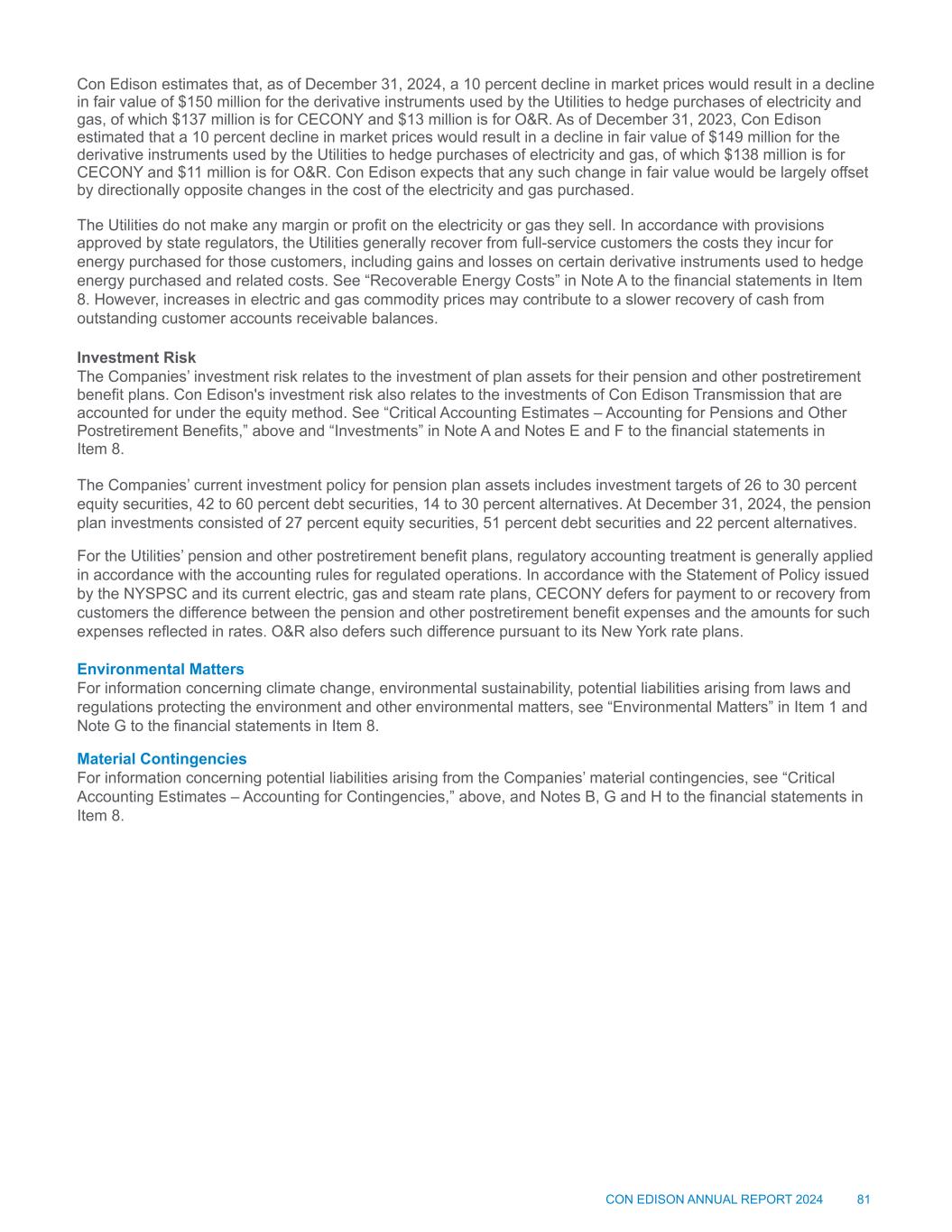 Con Edison estimates that, as of December 31, 2024, a 10 percent decline in market prices would result in a decline in fair value of $150 million for the derivative instruments used by the Utilities to hedge purchases of electricity and gas, of which $137 million is for CECONY and $13 million is for O&R. As of December 31, 2023, Con Edison estimated that a 10 percent decline in market prices would result in a decline in fair value of $149 million for the derivative instruments used by the Utilities to hedge purchases of electricity and gas, of which $138 million is for CECONY and $11 million is for O&R. Con Edison expects that any such change in fair value would be largely offset by directionally opposite changes in the cost of the electricity and gas purchased. The Utilities do not make any margin or profit on the electricity or gas they sell. In accordance with provisions approved by state regulators, the Utilities generally recover from full-service customers the costs they incur for energy purchased for those customers, including gains and losses on certain derivative instruments used to hedge energy purchased and related costs. See “Recoverable Energy Costs” in Note A to the financial statements in Item 8. However, increases in electric and gas commodity prices may contribute to a slower recovery of cash from outstanding customer accounts receivable balances. Investment Risk The Companies’ investment risk relates to the investment of plan assets for their pension and other postretirement benefit plans. Con Edison's investment risk also relates to the investments of Con Edison Transmission that are accounted for under the equity method. See “Critical Accounting Estimates – Accounting for Pensions and Other Postretirement Benefits,” above and “Investments” in Note A and Notes E and F to the financial statements in Item 8. The Companies’ current investment policy for pension plan assets includes investment targets of 26 to 30 percent equity securities, 42 to 60 percent debt securities, 14 to 30 percent alternatives. At December 31, 2024, the pension plan investments consisted of 27 percent equity securities, 51 percent debt securities and 22 percent alternatives. For the Utilities’ pension and other postretirement benefit plans, regulatory accounting treatment is generally applied in accordance with the accounting rules for regulated operations. In accordance with the Statement of Policy issued by the NYSPSC and its current electric, gas and steam rate plans, CECONY defers for payment to or recovery from customers the difference between the pension and other postretirement benefit expenses and the amounts for such expenses reflected in rates. O&R also defers such difference pursuant to its New York rate plans. Environmental Matters For information concerning climate change, environmental sustainability, potential liabilities arising from laws and regulations protecting the environment and other environmental matters, see “Environmental Matters” in Item 1 and Note G to the financial statements in Item 8. Material Contingencies For information concerning potential liabilities arising from the Companies’ material contingencies, see “Critical Accounting Estimates – Accounting for Contingencies,” above, and Notes B, G and H to the financial statements in Item 8. CON EDISON ANNUAL REPORT 2024 81