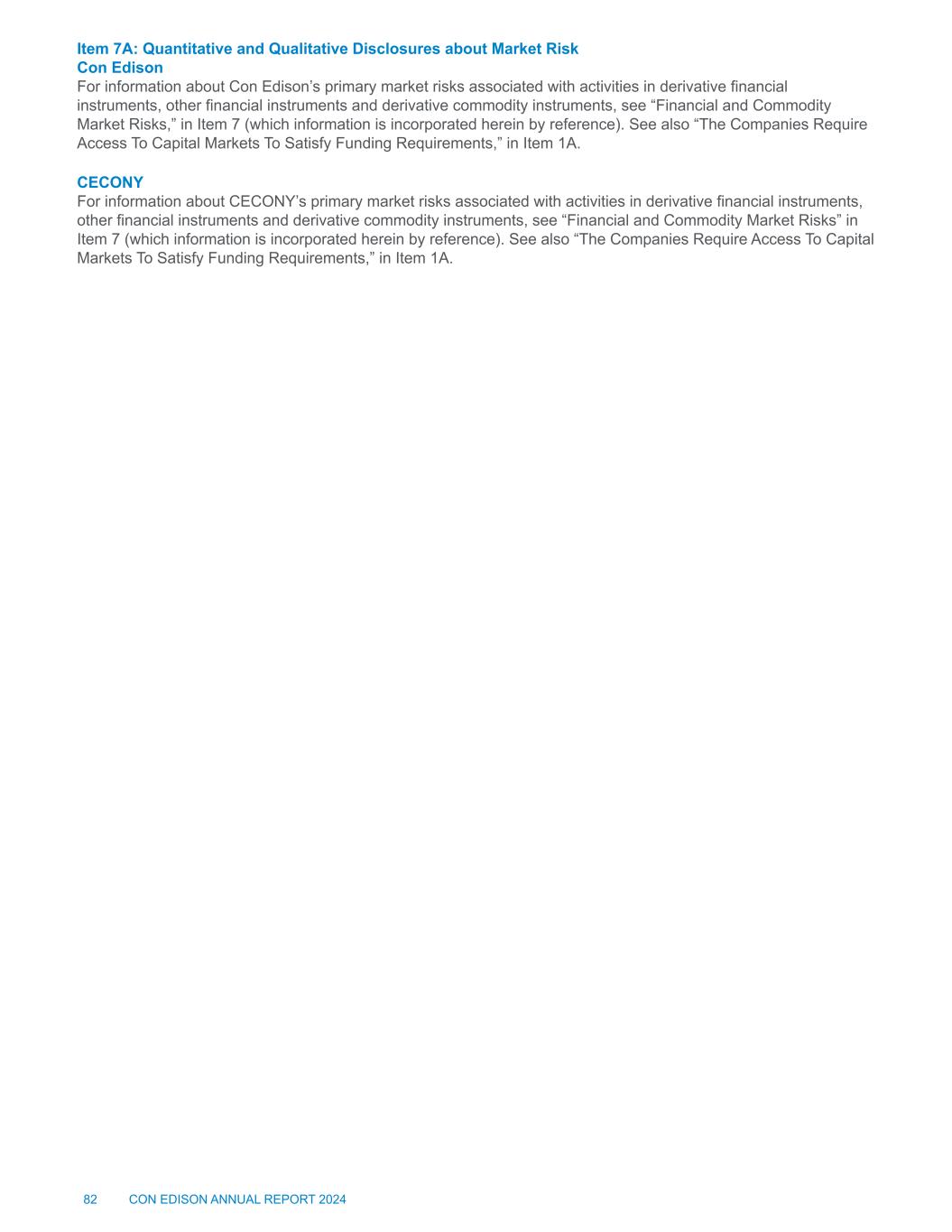 Item 7A: Quantitative and Qualitative Disclosures about Market Risk Con Edison For information about Con Edison’s primary market risks associated with activities in derivative financial instruments, other financial instruments and derivative commodity instruments, see “Financial and Commodity Market Risks,” in Item 7 (which information is incorporated herein by reference). See also “The Companies Require Access To Capital Markets To Satisfy Funding Requirements,” in Item 1A. CECONY For information about CECONY’s primary market risks associated with activities in derivative financial instruments, other financial instruments and derivative commodity instruments, see “Financial and Commodity Market Risks” in Item 7 (which information is incorporated herein by reference). See also “The Companies Require Access To Capital Markets To Satisfy Funding Requirements,” in Item 1A. 82 CON EDISON ANNUAL REPORT 2024