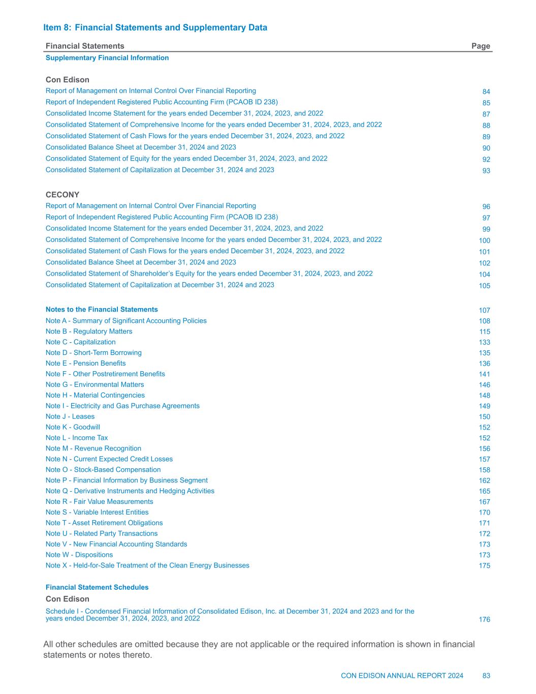 Item 8: Financial Statements and Supplementary Data Financial Statements Page Supplementary Financial Information Con Edison Report of Management on Internal Control Over Financial Reporting 84 Report of Independent Registered Public Accounting Firm (PCAOB ID 238) 85 Consolidated Income Statement for the years ended December 31, 2024, 2023, and 2022 87 Consolidated Statement of Comprehensive Income for the years ended December 31, 2024, 2023, and 2022 88 Consolidated Statement of Cash Flows for the years ended December 31, 2024, 2023, and 2022 89 Consolidated Balance Sheet at December 31, 2024 and 2023 90 Consolidated Statement of Equity for the years ended December 31, 2024, 2023, and 2022 92 Consolidated Statement of Capitalization at December 31, 2024 and 2023 93 CECONY Report of Management on Internal Control Over Financial Reporting 96 Report of Independent Registered Public Accounting Firm (PCAOB ID 238) 97 Consolidated Income Statement for the years ended December 31, 2024, 2023, and 2022 99 Consolidated Statement of Comprehensive Income for the years ended December 31, 2024, 2023, and 2022 100 Consolidated Statement of Cash Flows for the years ended December 31, 2024, 2023, and 2022 101 Consolidated Balance Sheet at December 31, 2024 and 2023 102 Consolidated Statement of Shareholder’s Equity for the years ended December 31, 2024, 2023, and 2022 104 Consolidated Statement of Capitalization at December 31, 2024 and 2023 105 Notes to the Financial Statements 107 Note A - Summary of Significant Accounting Policies 108 Note B - Regulatory Matters 115 Note C - Capitalization 133 Note D - Short-Term Borrowing 135 Note E - Pension Benefits 136 Note F - Other Postretirement Benefits 141 Note G - Environmental Matters 146 Note H - Material Contingencies 148 Note I - Electricity and Gas Purchase Agreements 149 Note J - Leases 150 Note K - Goodwill 152 Note L - Income Tax 152 Note M - Revenue Recognition 156 Note N - Current Expected Credit Losses 157 Note O - Stock-Based Compensation 158 Note P - Financial Information by Business Segment 162 Note Q - Derivative Instruments and Hedging Activities 165 Note R - Fair Value Measurements 167 Note S - Variable Interest Entities 170 Note T - Asset Retirement Obligations 171 Note U - Related Party Transactions 172 Note V - New Financial Accounting Standards 173 Note W - Dispositions 173 Note X - Held-for-Sale Treatment of the Clean Energy Businesses 175 Financial Statement Schedules Con Edison Schedule I - Condensed Financial Information of Consolidated Edison, Inc. at December 31, 2024 and 2023 and for the years ended December 31, 2024, 2023, and 2022 176 All other schedules are omitted because they are not applicable or the required information is shown in financial statements or notes thereto. CON EDISON ANNUAL REPORT 2024 83