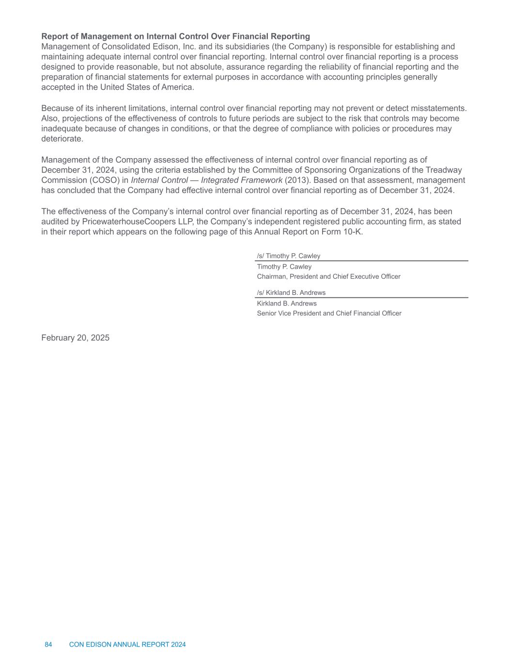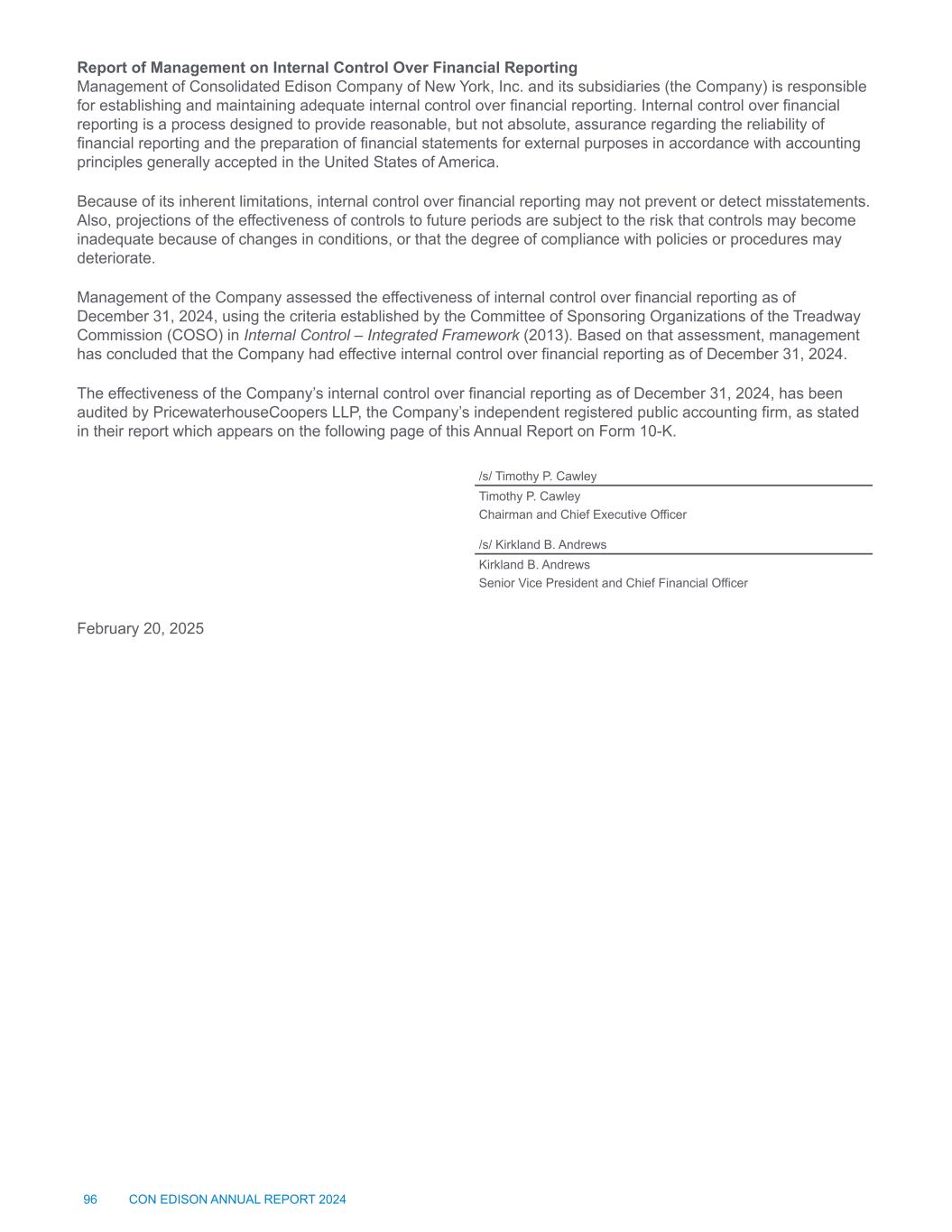 Report of Management on Internal Control Over Financial Reporting Management of Consolidated Edison, Inc. and its subsidiaries (the Company) is responsible for establishing and maintaining adequate internal control over financial reporting. Internal control over financial reporting is a process designed to provide reasonable, but not absolute, assurance regarding the reliability of financial reporting and the preparation of financial statements for external purposes in accordance with accounting principles generally accepted in the United States of America. Because of its inherent limitations, internal control over financial reporting may not prevent or detect misstatements. Also, projections of the effectiveness of controls to future periods are subject to the risk that controls may become inadequate because of changes in conditions, or that the degree of compliance with policies or procedures may deteriorate. Management of the Company assessed the effectiveness of internal control over financial reporting as of December 31, 2024, using the criteria established by the Committee of Sponsoring Organizations of the Treadway Commission (COSO) in Internal Control — Integrated Framework (2013). Based on that assessment, management has concluded that the Company had effective internal control over financial reporting as of December 31, 2024. The effectiveness of the Company’s internal control over financial reporting as of December 31, 2024, has been audited by PricewaterhouseCoopers LLP, the Company’s independent registered public accounting firm, as stated in their report which appears on the following page of this Annual Report on Form 10-K. /s/ Timothy P. Cawley Timothy P. Cawley Chairman, President and Chief Executive Officer /s/ Kirkland B. Andrews Kirkland B. Andrews Senior Vice President and Chief Financial Officer February 20, 2025 84 CON EDISON ANNUAL REPORT 2024