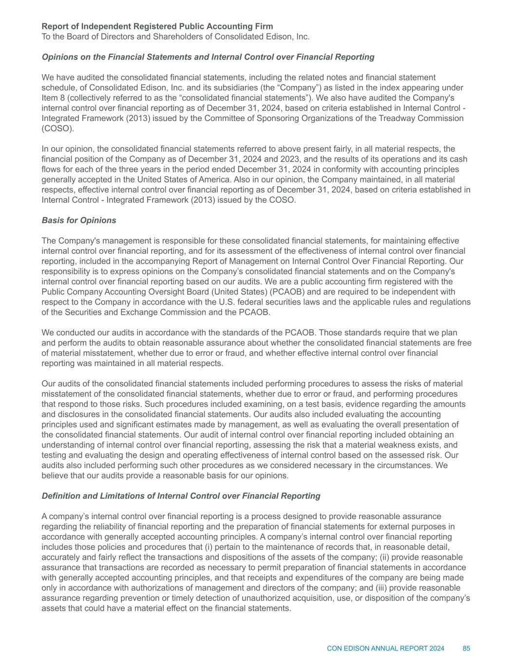 Report of Independent Registered Public Accounting Firm To the Board of Directors and Shareholders of Consolidated Edison, Inc. Opinions on the Financial Statements and Internal Control over Financial Reporting We have audited the consolidated financial statements, including the related notes and financial statement schedule, of Consolidated Edison, Inc. and its subsidiaries (the “Company”) as listed in the index appearing under Item 8 (collectively referred to as the “consolidated financial statements”). We also have audited the Company's internal control over financial reporting as of December 31, 2024, based on criteria established in Internal Control - Integrated Framework (2013) issued by the Committee of Sponsoring Organizations of the Treadway Commission (COSO). In our opinion, the consolidated financial statements referred to above present fairly, in all material respects, the financial position of the Company as of December 31, 2024 and 2023, and the results of its operations and its cash flows for each of the three years in the period ended December 31, 2024 in conformity with accounting principles generally accepted in the United States of America. Also in our opinion, the Company maintained, in all material respects, effective internal control over financial reporting as of December 31, 2024, based on criteria established in Internal Control - Integrated Framework (2013) issued by the COSO. Basis for Opinions The Company's management is responsible for these consolidated financial statements, for maintaining effective internal control over financial reporting, and for its assessment of the effectiveness of internal control over financial reporting, included in the accompanying Report of Management on Internal Control Over Financial Reporting. Our responsibility is to express opinions on the Company’s consolidated financial statements and on the Company's internal control over financial reporting based on our audits. We are a public accounting firm registered with the Public Company Accounting Oversight Board (United States) (PCAOB) and are required to be independent with respect to the Company in accordance with the U.S. federal securities laws and the applicable rules and regulations of the Securities and Exchange Commission and the PCAOB. We conducted our audits in accordance with the standards of the PCAOB. Those standards require that we plan and perform the audits to obtain reasonable assurance about whether the consolidated financial statements are free of material misstatement, whether due to error or fraud, and whether effective internal control over financial reporting was maintained in all material respects. Our audits of the consolidated financial statements included performing procedures to assess the risks of material misstatement of the consolidated financial statements, whether due to error or fraud, and performing procedures that respond to those risks. Such procedures included examining, on a test basis, evidence regarding the amounts and disclosures in the consolidated financial statements. Our audits also included evaluating the accounting principles used and significant estimates made by management, as well as evaluating the overall presentation of the consolidated financial statements. Our audit of internal control over financial reporting included obtaining an understanding of internal control over financial reporting, assessing the risk that a material weakness exists, and testing and evaluating the design and operating effectiveness of internal control based on the assessed risk. Our audits also included performing such other procedures as we considered necessary in the circumstances. We believe that our audits provide a reasonable basis for our opinions. Definition and Limitations of Internal Control over Financial Reporting A company’s internal control over financial reporting is a process designed to provide reasonable assurance regarding the reliability of financial reporting and the preparation of financial statements for external purposes in accordance with generally accepted accounting principles. A company’s internal control over financial reporting includes those policies and procedures that (i) pertain to the maintenance of records that, in reasonable detail, accurately and fairly reflect the transactions and dispositions of the assets of the company; (ii) provide reasonable assurance that transactions are recorded as necessary to permit preparation of financial statements in accordance with generally accepted accounting principles, and that receipts and expenditures of the company are being made only in accordance with authorizations of management and directors of the company; and (iii) provide reasonable assurance regarding prevention or timely detection of unauthorized acquisition, use, or disposition of the company’s assets that could have a material effect on the financial statements. CON EDISON ANNUAL REPORT 2024 85