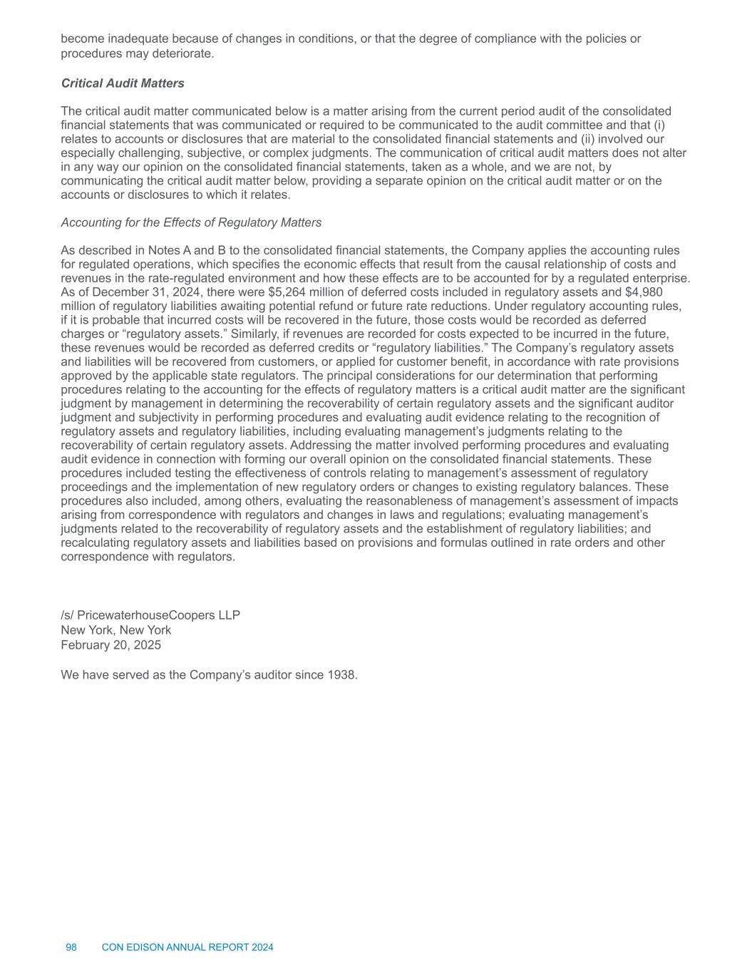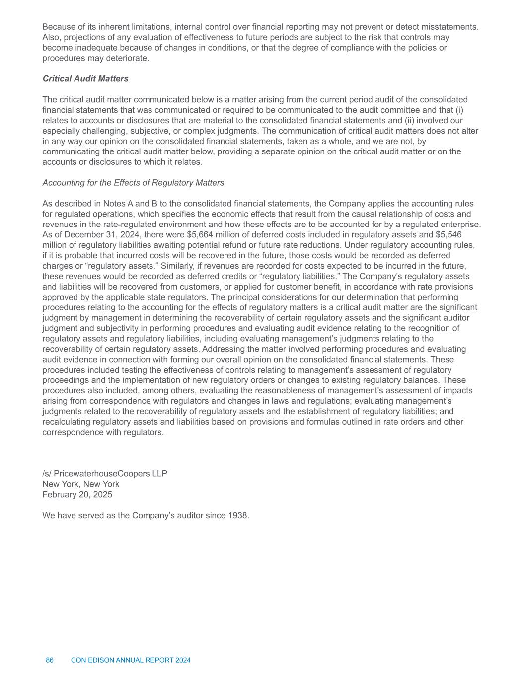 Because of its inherent limitations, internal control over financial reporting may not prevent or detect misstatements. Also, projections of any evaluation of effectiveness to future periods are subject to the risk that controls may become inadequate because of changes in conditions, or that the degree of compliance with the policies or procedures may deteriorate. Critical Audit Matters The critical audit matter communicated below is a matter arising from the current period audit of the consolidated financial statements that was communicated or required to be communicated to the audit committee and that (i) relates to accounts or disclosures that are material to the consolidated financial statements and (ii) involved our especially challenging, subjective, or complex judgments. The communication of critical audit matters does not alter in any way our opinion on the consolidated financial statements, taken as a whole, and we are not, by communicating the critical audit matter below, providing a separate opinion on the critical audit matter or on the accounts or disclosures to which it relates. Accounting for the Effects of Regulatory Matters As described in Notes A and B to the consolidated financial statements, the Company applies the accounting rules for regulated operations, which specifies the economic effects that result from the causal relationship of costs and revenues in the rate-regulated environment and how these effects are to be accounted for by a regulated enterprise. As of December 31, 2024, there were $5,664 million of deferred costs included in regulatory assets and $5,546 million of regulatory liabilities awaiting potential refund or future rate reductions. Under regulatory accounting rules, if it is probable that incurred costs will be recovered in the future, those costs would be recorded as deferred charges or “regulatory assets.” Similarly, if revenues are recorded for costs expected to be incurred in the future, these revenues would be recorded as deferred credits or “regulatory liabilities.” The Company’s regulatory assets and liabilities will be recovered from customers, or applied for customer benefit, in accordance with rate provisions approved by the applicable state regulators. The principal considerations for our determination that performing procedures relating to the accounting for the effects of regulatory matters is a critical audit matter are the significant judgment by management in determining the recoverability of certain regulatory assets and the significant auditor judgment and subjectivity in performing procedures and evaluating audit evidence relating to the recognition of regulatory assets and regulatory liabilities, including evaluating management’s judgments relating to the recoverability of certain regulatory assets. Addressing the matter involved performing procedures and evaluating audit evidence in connection with forming our overall opinion on the consolidated financial statements. These procedures included testing the effectiveness of controls relating to management’s assessment of regulatory proceedings and the implementation of new regulatory orders or changes to existing regulatory balances. These procedures also included, among others, evaluating the reasonableness of management’s assessment of impacts arising from correspondence with regulators and changes in laws and regulations; evaluating management’s judgments related to the recoverability of regulatory assets and the establishment of regulatory liabilities; and recalculating regulatory assets and liabilities based on provisions and formulas outlined in rate orders and other correspondence with regulators. /s/ PricewaterhouseCoopers LLP New York, New York February 20, 2025 We have served as the Company’s auditor since 1938. 86 CON EDISON ANNUAL REPORT 2024