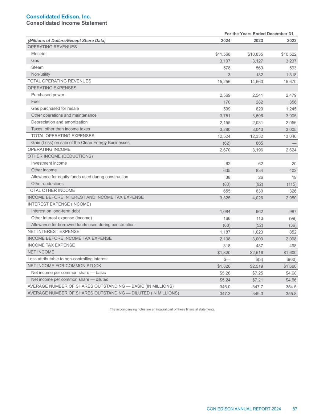 Consolidated Edison, Inc. Consolidated Income Statement For the Years Ended December 31, (Millions of Dollars/Except Share Data) 2024 2023 2022 OPERATING REVENUES Electric $11,568 $10,835 $10,522 Gas 3,107 3,127 3,237 Steam 578 569 593 Non-utility 3 132 1,318 TOTAL OPERATING REVENUES 15,256 14,663 15,670 OPERATING EXPENSES Purchased power 2,569 2,541 2,479 Fuel 170 282 356 Gas purchased for resale 599 829 1,245 Other operations and maintenance 3,751 3,606 3,905 Depreciation and amortization 2,155 2,031 2,056 Taxes, other than income taxes 3,280 3,043 3,005 TOTAL OPERATING EXPENSES 12,524 12,332 13,046 Gain (Loss) on sale of the Clean Energy Businesses (62) 865 — OPERATING INCOME 2,670 3,196 2,624 OTHER INCOME (DEDUCTIONS) Investment income 62 62 20 Other income 635 834 402 Allowance for equity funds used during construction 38 26 19 Other deductions (80) (92) (115) TOTAL OTHER INCOME 655 830 326 INCOME BEFORE INTEREST AND INCOME TAX EXPENSE 3,325 4,026 2,950 INTEREST EXPENSE (INCOME) Interest on long-term debt 1,084 962 987 Other interest expense (income) 166 113 (99) Allowance for borrowed funds used during construction (63) (52) (36) NET INTEREST EXPENSE 1,187 1,023 852 INCOME BEFORE INCOME TAX EXPENSE 2,138 3,003 2,098 INCOME TAX EXPENSE 318 487 498 NET INCOME $1,820 $2,516 $1,600 Loss attributable to non-controlling interest $— $(3) $(60) NET INCOME FOR COMMON STOCK $1,820 $2,519 $1,660 Net income per common share — basic $5.26 $7.25 $4.68 Net income per common share — diluted $5.24 $7.21 $4.66 AVERAGE NUMBER OF SHARES OUTSTANDING — BASIC (IN MILLIONS) 346.0 347.7 354.5 AVERAGE NUMBER OF SHARES OUTSTANDING — DILUTED (IN MILLIONS) 347.3 349.3 355.8 The accompanying notes are an integral part of these financial statements. CON EDISON ANNUAL REPORT 2024 87