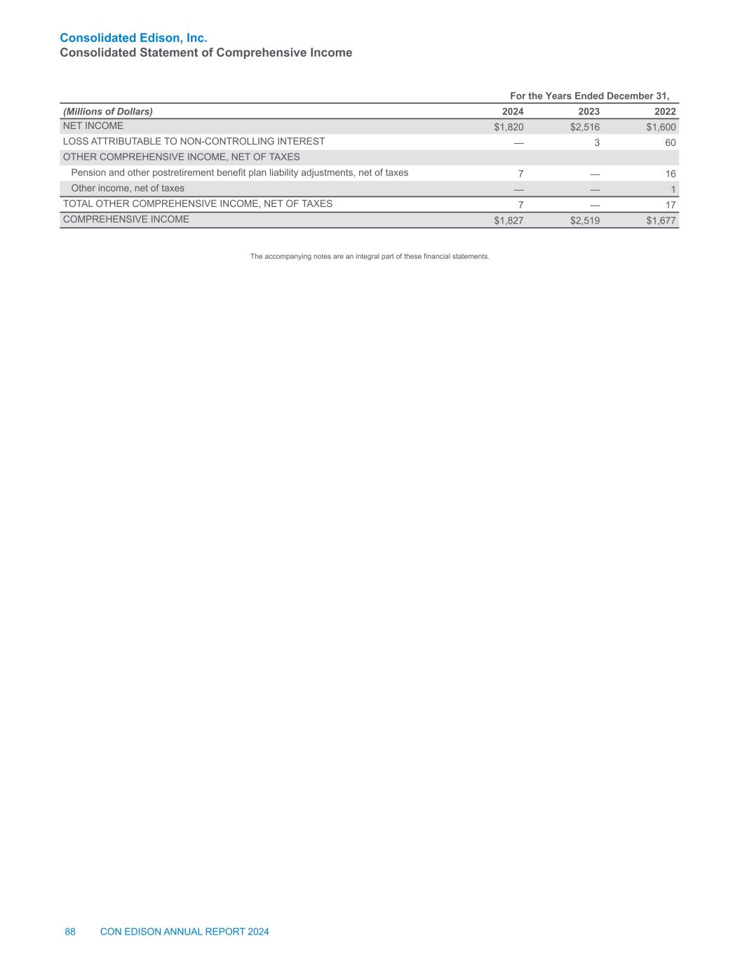 Consolidated Edison, Inc. Consolidated Statement of Comprehensive Income For the Years Ended December 31, (Millions of Dollars) 2024 2023 2022 NET INCOME $1,820 $2,516 $1,600 LOSS ATTRIBUTABLE TO NON-CONTROLLING INTEREST — 3 60 OTHER COMPREHENSIVE INCOME, NET OF TAXES Pension and other postretirement benefit plan liability adjustments, net of taxes 7 — 16 Other income, net of taxes — — 1 TOTAL OTHER COMPREHENSIVE INCOME, NET OF TAXES 7 — 17 COMPREHENSIVE INCOME $1,827 $2,519 $1,677 The accompanying notes are an integral part of these financial statements. 88 CON EDISON ANNUAL REPORT 2024