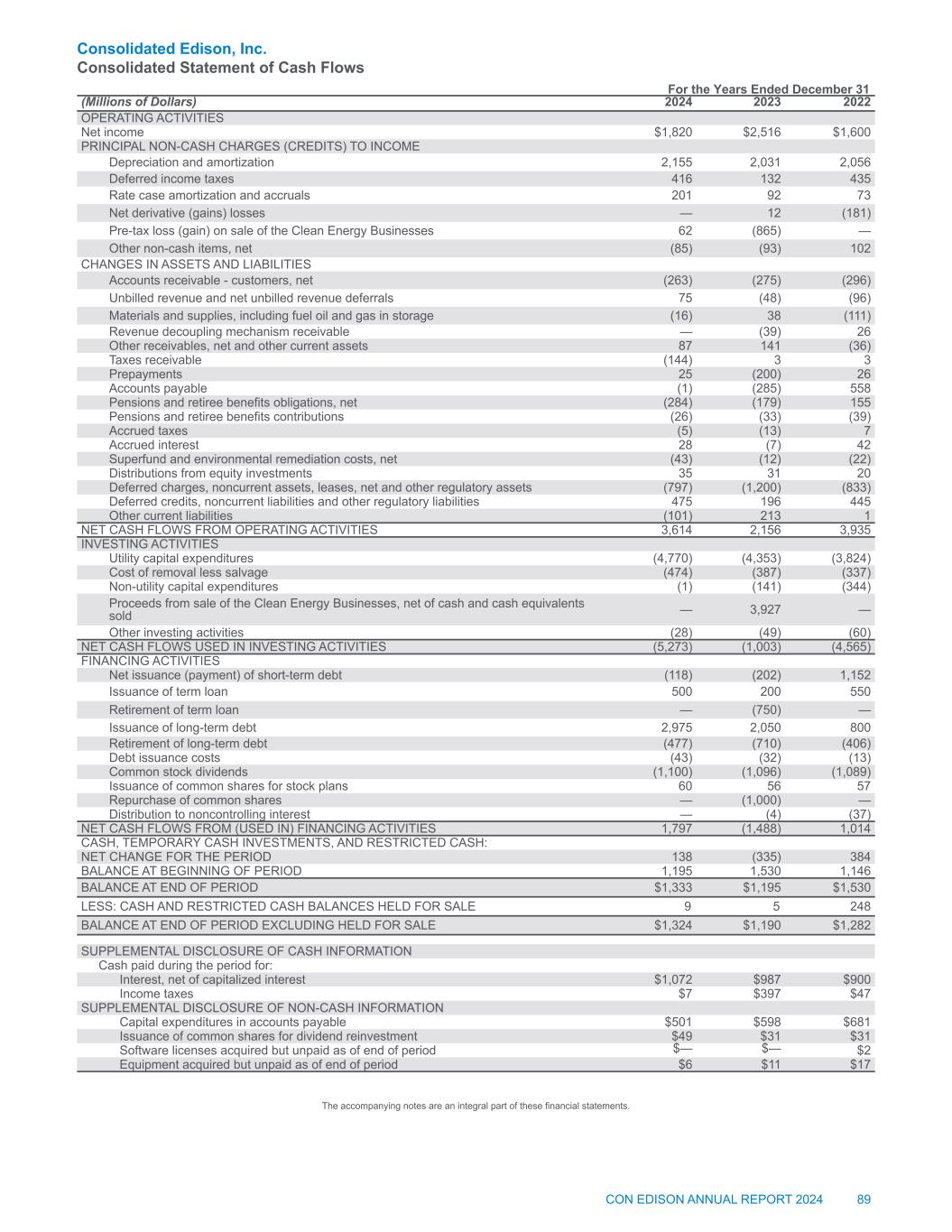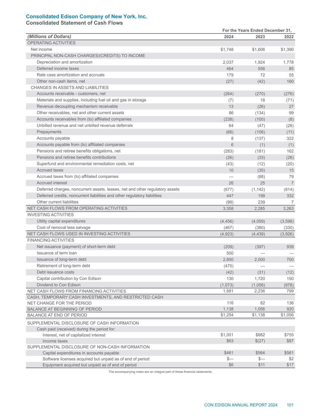 Consolidated Edison Company of New York, Inc. Consolidated Statement of Cash Flows For the Years Ended December 31, (Millions of Dollars) 2024 2023 2022 OPERATING ACTIVITIES Net income $1,748 $1,606 $1,390 PRINCIPAL NON-CASH CHARGES/(CREDITS) TO INCOME Depreciation and amortization 2,037 1,924 1,778 Deferred income taxes 464 556 85 Rate case amortization and accruals 179 72 55 Other non-cash items, net (27) (42) 160 CHANGES IN ASSETS AND LIABILITIES Accounts receivable - customers, net (264) (270) (276) Materials and supplies, including fuel oil and gas in storage (7) 18 (71) Revenue decoupling mechanism receivable 13 (26) 27 Other receivables, net and other current assets 86 (134) 99 Accounts receivables from (to) affiliated companies (238) (100) (8) Unbilled revenue and net unbilled revenue deferrals 64 (47) (28) Prepayments (66) (106) (11) Accounts payable 8 (137) 322 Accounts payable from (to) affiliated companies 6 (1) (1) Pensions and retiree benefits obligations, net (283) (181) 162 Pensions and retiree benefits contributions (26) (33) (26) Superfund and environmental remediation costs, net (43) (12) (20) Accrued taxes 10 (35) 15 Accrued taxes from (to) affiliated companies — (88) 79 Accrued interest 26 25 7 Deferred charges, noncurrent assets, leases, net and other regulatory assets (677) (1,142) (814) Deferred credits, noncurrent liabilities and other regulatory liabilities 447 199 332 Other current liabilities (99) 239 7 NET CASH FLOWS FROM OPERATING ACTIVITIES 3,358 2,285 3,263 INVESTING ACTIVITIES Utility capital expenditures (4,456) (4,059) (3,596) Cost of removal less salvage (467) (380) (330) NET CASH FLOWS USED IN INVESTING ACTIVITIES (4,923) (4,439) (3,926) FINANCING ACTIVITIES Net issuance (payment) of short-term debt (209) (397) 939 Issuance of term loan 500 — — Issuance of long-term debt 2,850 2,000 700 Retirement of long-term debt (475) — — Debt issuance costs (42) (31) (12) Capital contribution by Con Edison 130 1,720 150 Dividend to Con Edison (1,073) (1,056) (978) NET CASH FLOWS FROM FINANCING ACTIVITIES 1,681 2,236 799 CASH, TEMPORARY CASH INVESTMENTS, AND RESTRICTED CASH NET CHANGE FOR THE PERIOD 116 82 136 BALANCE AT BEGINNING OF PERIOD 1,138 1,056 920 BALANCE AT END OF PERIOD $1,254 $1,138 $1,056 SUPPLEMENTAL DISCLOSURE OF CASH INFORMATION Cash paid (received) during the period for: Interest, net of capitalized interest $1,001 $882 $755 Income taxes $63 $(27) $87 SUPPLEMENTAL DISCLOSURE OF NON-CASH INFORMATION Capital expenditures in accounts payable $461 $564 $561 Software licenses acquired but unpaid as of end of period $— $— $2 Equipment acquired but unpaid as of end of period $6 $11 $17 The accompanying notes are an integral part of these financial statements. CON EDISON ANNUAL REPORT 2024 101