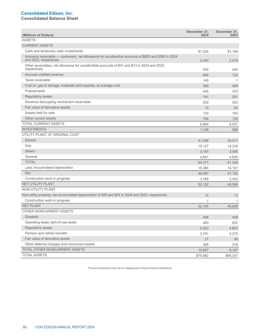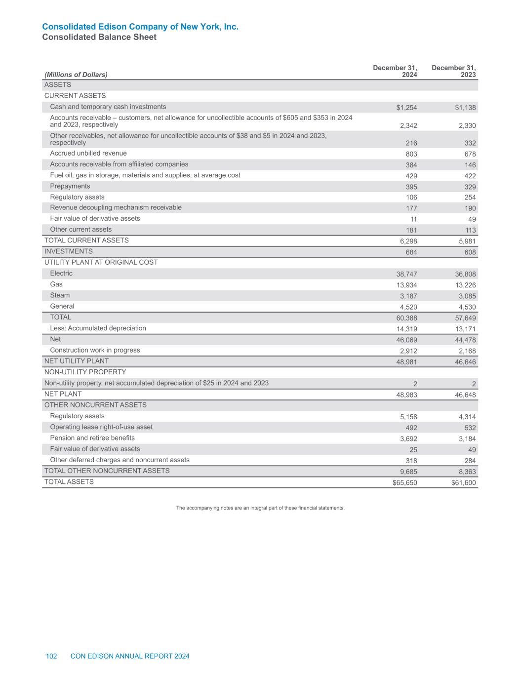 Consolidated Edison Company of New York, Inc. Consolidated Balance Sheet (Millions of Dollars) December 31, 2024 December 31, 2023 ASSETS CURRENT ASSETS Cash and temporary cash investments $1,254 $1,138 Accounts receivable – customers, net allowance for uncollectible accounts of $605 and $353 in 2024 and 2023, respectively 2,342 2,330 Other receivables, net allowance for uncollectible accounts of $38 and $9 in 2024 and 2023, respectively 216 332 Accrued unbilled revenue 803 678 Accounts receivable from affiliated companies 384 146 Fuel oil, gas in storage, materials and supplies, at average cost 429 422 Prepayments 395 329 Regulatory assets 106 254 Revenue decoupling mechanism receivable 177 190 Fair value of derivative assets 11 49 Other current assets 181 113 TOTAL CURRENT ASSETS 6,298 5,981 INVESTMENTS 684 608 UTILITY PLANT AT ORIGINAL COST Electric 38,747 36,808 Gas 13,934 13,226 Steam 3,187 3,085 General 4,520 4,530 TOTAL 60,388 57,649 Less: Accumulated depreciation 14,319 13,171 Net 46,069 44,478 Construction work in progress 2,912 2,168 NET UTILITY PLANT 48,981 46,646 NON-UTILITY PROPERTY Non-utility property, net accumulated depreciation of $25 in 2024 and 2023 2 2 NET PLANT 48,983 46,648 OTHER NONCURRENT ASSETS Regulatory assets 5,158 4,314 Operating lease right-of-use asset 492 532 Pension and retiree benefits 3,692 3,184 Fair value of derivative assets 25 49 Other deferred charges and noncurrent assets 318 284 TOTAL OTHER NONCURRENT ASSETS 9,685 8,363 TOTAL ASSETS $65,650 $61,600 The accompanying notes are an integral part of these financial statements. 102 CON EDISON ANNUAL REPORT 2024
