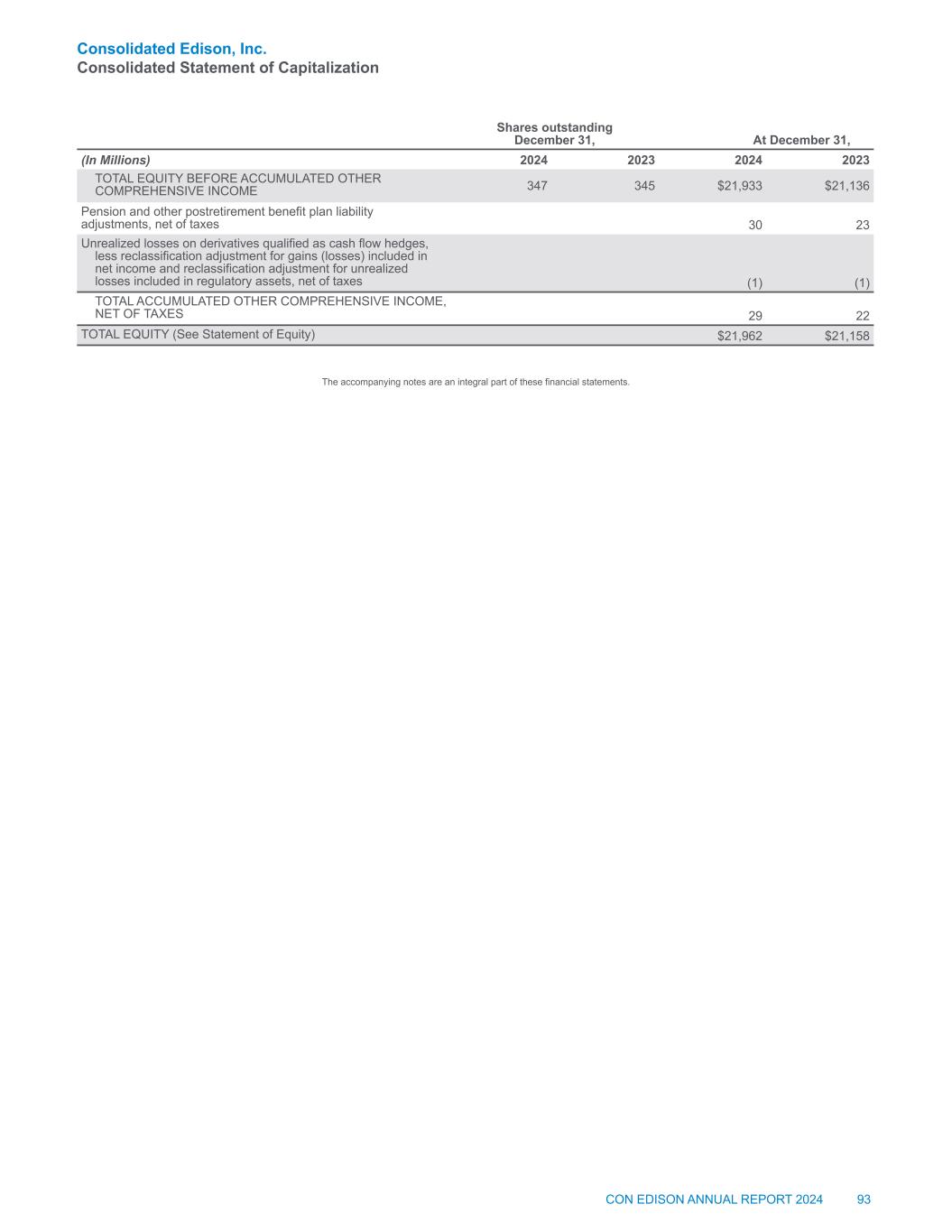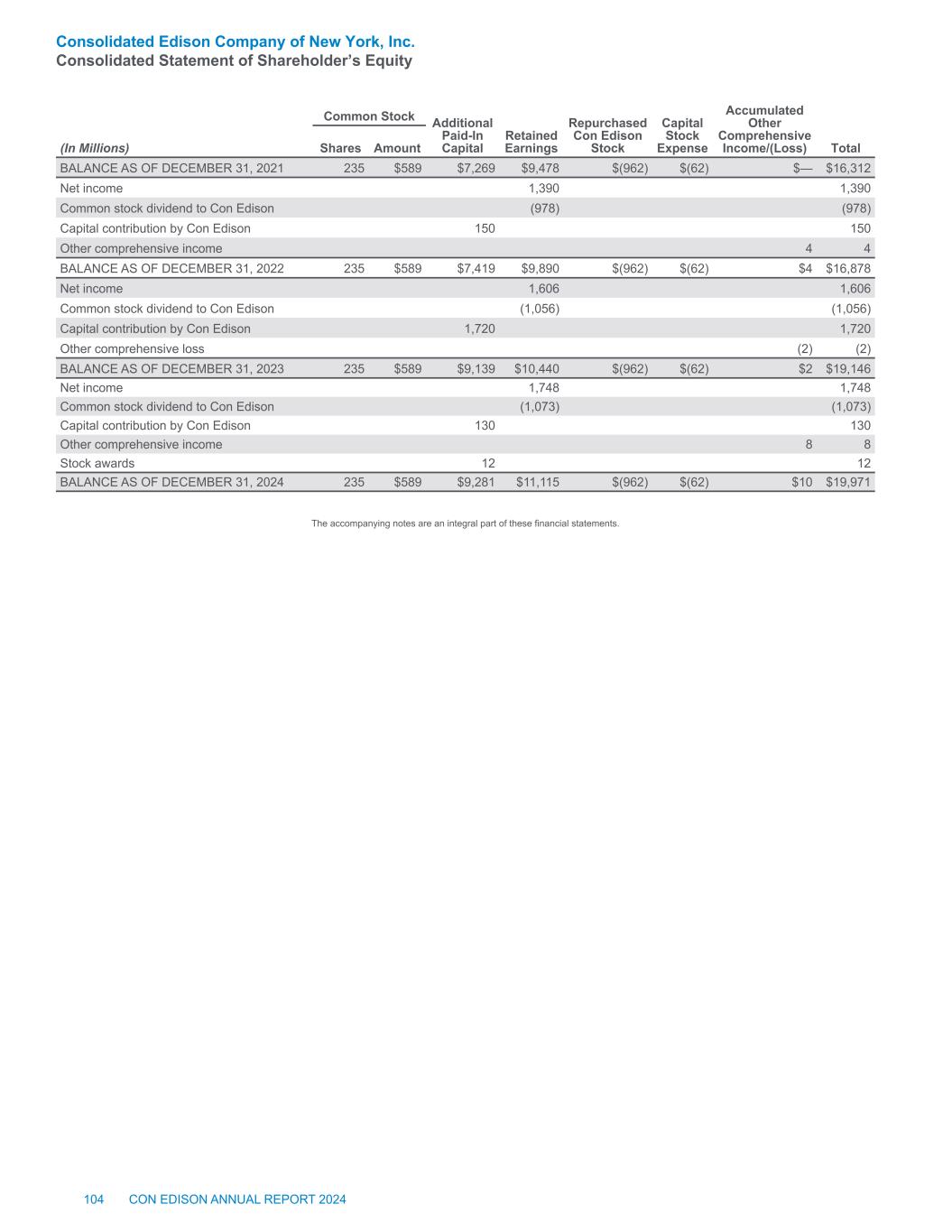 Consolidated Edison Company of New York, Inc. Consolidated Statement of Shareholder’s Equity (In Millions) Common Stock Additional Paid-In Capital Retained Earnings Repurchased Con Edison Stock Capital Stock Expense Accumulated Other Comprehensive Income/(Loss) TotalShares Amount BALANCE AS OF DECEMBER 31, 2021 235 $589 $7,269 $9,478 $(962) $(62) $— $16,312 Net income 1,390 1,390 Common stock dividend to Con Edison (978) (978) Capital contribution by Con Edison 150 150 Other comprehensive income 4 4 BALANCE AS OF DECEMBER 31, 2022 235 $589 $7,419 $9,890 $(962) $(62) $4 $16,878 Net income 1,606 1,606 Common stock dividend to Con Edison (1,056) (1,056) Capital contribution by Con Edison 1,720 1,720 Other comprehensive loss (2) (2) BALANCE AS OF DECEMBER 31, 2023 235 $589 $9,139 $10,440 $(962) $(62) $2 $19,146 Net income 1,748 1,748 Common stock dividend to Con Edison (1,073) (1,073) Capital contribution by Con Edison 130 130 Other comprehensive income 8 8 Stock awards 12 12 BALANCE AS OF DECEMBER 31, 2024 235 $589 $9,281 $11,115 $(962) $(62) $10 $19,971 The accompanying notes are an integral part of these financial statements. 104 CON EDISON ANNUAL REPORT 2024