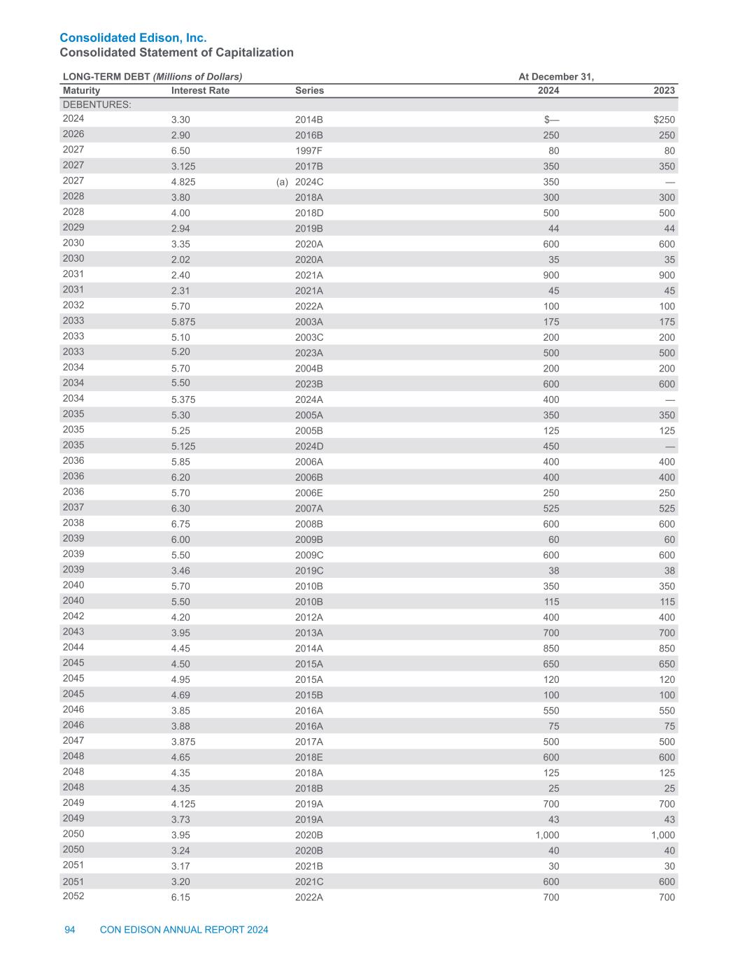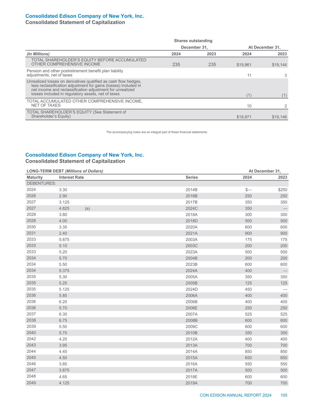 Consolidated Edison Company of New York, Inc. Consolidated Statement of Capitalization Shares outstanding December 31, At December 31, (In Millions) 2024 2023 2024 2023 TOTAL SHAREHOLDER’S EQUITY BEFORE ACCUMULATED OTHER COMPREHENSIVE INCOME 235 235 $19,961 $19,144 Pension and other postretirement benefit plan liability adjustments, net of taxes 11 3 Unrealized losses on derivatives qualified as cash flow hedges, less reclassification adjustment for gains (losses) included in net income and reclassification adjustment for unrealized losses included in regulatory assets, net of taxes (1) (1) TOTAL ACCUMULATED OTHER COMPREHENSIVE INCOME, NET OF TAXES 10 2 TOTAL SHAREHOLDER’S EQUITY (See Statement of Shareholder’s Equity) $19,971 $19,146 The accompanying notes are an integral part of these financial statements. Consolidated Edison Company of New York, Inc. Consolidated Statement of Capitalization LONG-TERM DEBT (Millions of Dollars) At December 31, Maturity Interest Rate Series 2024 2023 DEBENTURES: 2024 3.30 2014B $— $250 2026 2.90 2016B 250 250 2027 3.125 2017B 350 350 2027 4.825 (a) 2024C 350 — 2028 3.80 2018A 300 300 2028 4.00 2018D 500 500 2030 3.35 2020A 600 600 2031 2.40 2021A 900 900 2033 5.875 2003A 175 175 2033 5.10 2003C 200 200 2033 5.20 2023A 500 500 2034 5.70 2004B 200 200 2034 5.50 2023B 600 600 2034 5.375 2024A 400 — 2035 5.30 2005A 350 350 2035 5.25 2005B 125 125 2035 5.125 2024D 450 — 2036 5.85 2006A 400 400 2036 6.20 2006B 400 400 2036 5.70 2006E 250 250 2037 6.30 2007A 525 525 2038 6.75 2008B 600 600 2039 5.50 2009C 600 600 2040 5.70 2010B 350 350 2042 4.20 2012A 400 400 2043 3.95 2013A 700 700 2044 4.45 2014A 850 850 2045 4.50 2015A 650 650 2046 3.85 2016A 550 550 2047 3.875 2017A 500 500 2048 4.65 2018E 600 600 2049 4.125 2019A 700 700 CON EDISON ANNUAL REPORT 2024 105